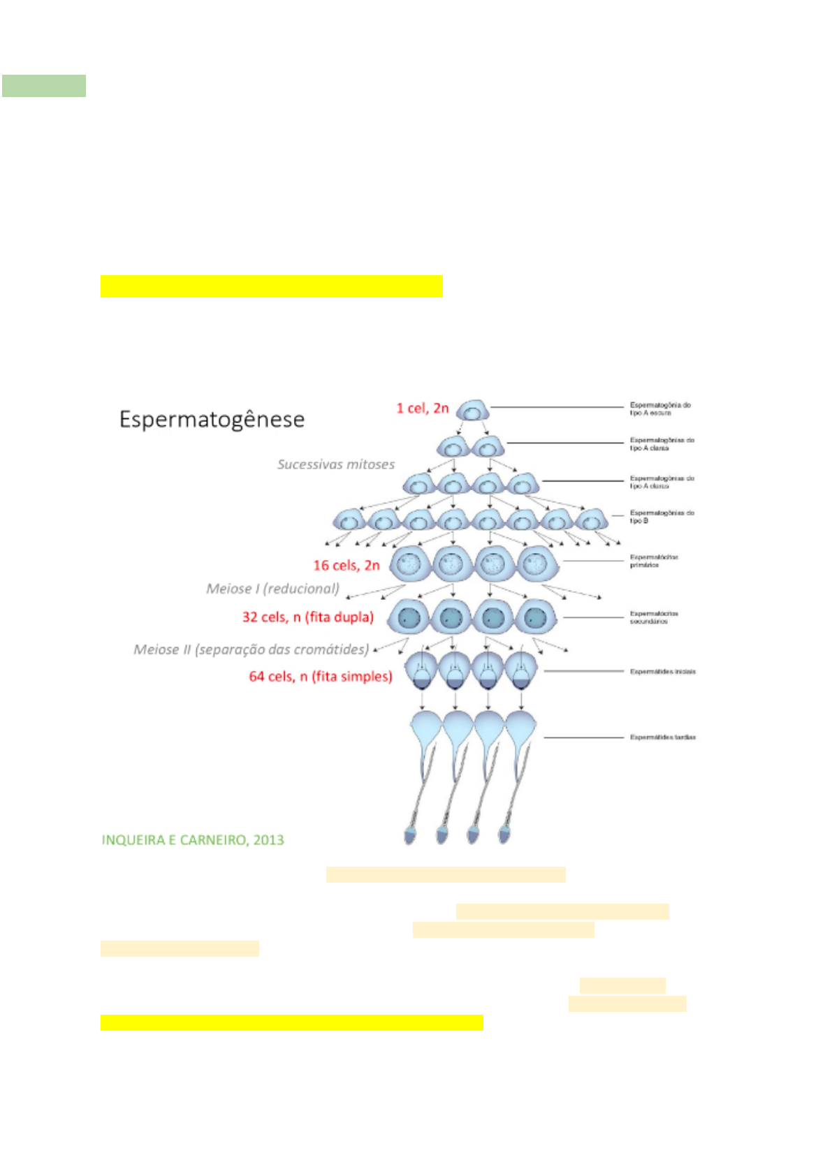 Carolina Pithon Rocha | Medicina | 3o semestre 1 Histologi� espermatogênes� � espermiogênes�; �citaçã�, ereçã�, emissã� � ejaculaçã� espermatogênese e espermiogênese a produção do gameta masculino inicia-se na puberdade pelas espermatogônias -> espermatócitos primários... Há 3 fases: espermatogonial (mitose): espermatogônia -> espermatócito I; meiose: espermatócito I -> espermatócito II -> espermátide; espermiogênese: espermátide -> espermatozóide Duração: 74 dias processo de gametogênese -> espermatogônia do tipo A escura -> células tronco com capacidade mitótica autoregenerativa -> renova o bum de espermatogônia dentro do testículo. Caso haja amadurecimento -> se forma, se divide -> espermatogônia do tipo A clara entra em divisão mitótica uma vez e entra de novo -> espermatogônia do tipo B entra em mitose -> espermatócito primário começa a ter divisão meiótica -> redistribuição dos cromossomos homólogos para formar células filhas com número reduzidos -> 32cels, n (fita dupla) -> separação das cromátides irmãs -> células filhas 64, n de fita simples -> espermátide -> não se divide mais, sofre alterações morfológicas para ter o formato tipo dos espermatozóides. espermatogônia é uma célula somática 46 cromossomos. Carolina Pithon Rocha | Medicina | 3o semestre 2 O grânulo acrossômico se funde com o complexo de golgi -> vesícula acrossômica -> centríolos ficam no polo oposto da fusão. Formação do axonema flagelar. Vesícula íntimo contato com o núcleo da célula -> capuz acrossômico. Acrossomo começa a se alongar -> cobrir ⅔ do espermatozóide, perdendo poros do núcleo. O próprio DNA da espermátide -> hipercondensar -> núcleo volume cada vez menor. Mitocôndrias no citoplasma dessas células -> se reorganizam na região mais proximal do flagelo -> formando a peça intermediária -> segmento inicial do flagelo -> produção de ATP para iniciar os batimentos flagelares. Membrana plasmática recobre todo mundo, quase perto das estruturas que estão dentro do espermatozóide. Excesso de citoplasma vai ser eliminado por corpo residual, eliminado da espermátide -> espermatozóide ser algo compacto. Acrossomos -> proteases que permitem a penetração do espermatozóides pelas barreiras físicas até entrar no ovócito secundário. Coroa radiata, zona pelúcida, membrana plasmáticas do ovócito… HISTOLOGIA testículo, epidídimo e ducto deferente bolsa escrotal dentro do saco escrotal dentro do testículo -> túbulos enovelados -> seminíferos -> espermatogênese. Tecido conjuntivo denso -> túnica albugínea. Túnica vaginal -> parte roxa C -> extensão do peritônio, gônada se desenvolve na cavidade abdominal -> carrega o peritônio que está junto com ele. Carolina Pithon Rocha | Medicina | 3o semestre 3 espermatozóide começa desenvolvimento nos túbulos seminíferos -> passa etapa de espermatogônia -> pronto -> sai do túbulo seminífero pelo túbulo reto -> conduzir espermatozóide para rede anastomosada dentro dos testículos -> sai dos testículos pelos ductos eferentes -> conduzir espermatozóides para região da cabeça do epidídimo. Onde os ductos deferentes desembocam no epidídimo. Por fim, passa pelo corpo até chegar a cauda do epidídimo -> motricidade flagelar -> ele amadurece durante esse processo. célula de sertoli -> oferecer e distribuir os nutrientes que vem do sangue para as células germinativas. Colunar, alta e emite projeções citoplasmáticas. Barreira criando compartimentos nesse epitélio -> compartimento basal (encontramos às espermatogônias) e adluminal (voltada para a luz do túbulo). Mais madura a célula germinativa -> mais sobre os degraus. Espermatócito primário -> se dividiu e gerou espermatócito secundário -> se dividir e formar às espermátides. barreira hematotesticular com células de sertoli compartimento basal -> espermatogônia e abdominal -> espermatócitos e espermátides espermátides quanto mais tardiamente -> cada vez mais na cobertura. Carolina Pithon Rocha | Medicina | 3o semestre 4 não há presença de espermatozóides aí ainda. bolinhas -> epitélio germinativo túbulo seminífero cortado -> espaço entre um túbulo e outro -> tecido conjuntivo entre, espaço intersticial. Aglomerados de células eosinofílicas -> células de leydig -> produção de testosterona. Carolina Pithon Rocha | Medicina | 3o semestre 5 túbulos seminíferos com células de leydig -> pós puberdade criança -> túbulo seminífero sem luz linha -> túbulo seminífero pré-púbere área vermelha -> túnica albugínea quase que não têm tecido intersticial entre eles. Carolina Pithon Rocha | Medicina | 3o semestre 6 ductos eferentes -> conduzem espermatozóide para a cabeça do epidídimo -> corpo -> cauda -> boa parte do fluido são absorvidos pelas células epididimárias, amadurecimento e armazenamento do espermatozóide. contração muscular -> conduz espermatozóides para o ducto ejaculatorio -> fluidos dá vesícula seminal -> ducto ejaculatorio -> uretra prostática -> sêmen expelido para o meio externo via processo de ejaculação. A porção mais dilatada é a porção da cabeça. Epitélio alto, enorme, luz mais ampla. ductos do epidídimo na calda -> linha grossa formando cada ducto. calda -> linhas mais finas Carolina Pithon Rocha | Medicina | 3o semestre 7 epitélio colunar, pseudoestratificado musculatura bem espessa -> longitudinal externa, circular média, interna é onde ocorre o processo de vasectomia Carolina Pithon Rocha | Medicina | 3o semestre 8 excitação, ereção, emissão e ejaculação Vesícula Seminal Glândula tubulares enoveladas Composição: Mucosa com muitos dobramentos - células colunares secretoras - células tronco basais - lâmina própria fibroelástica com m.liso ocasional M.liso Adventícia - grudar vesícula seminal na bexiga Carolina Pithon Rocha | Medicina | 3o semestre 9 Secreção - viscosa - amarelo esbranq
