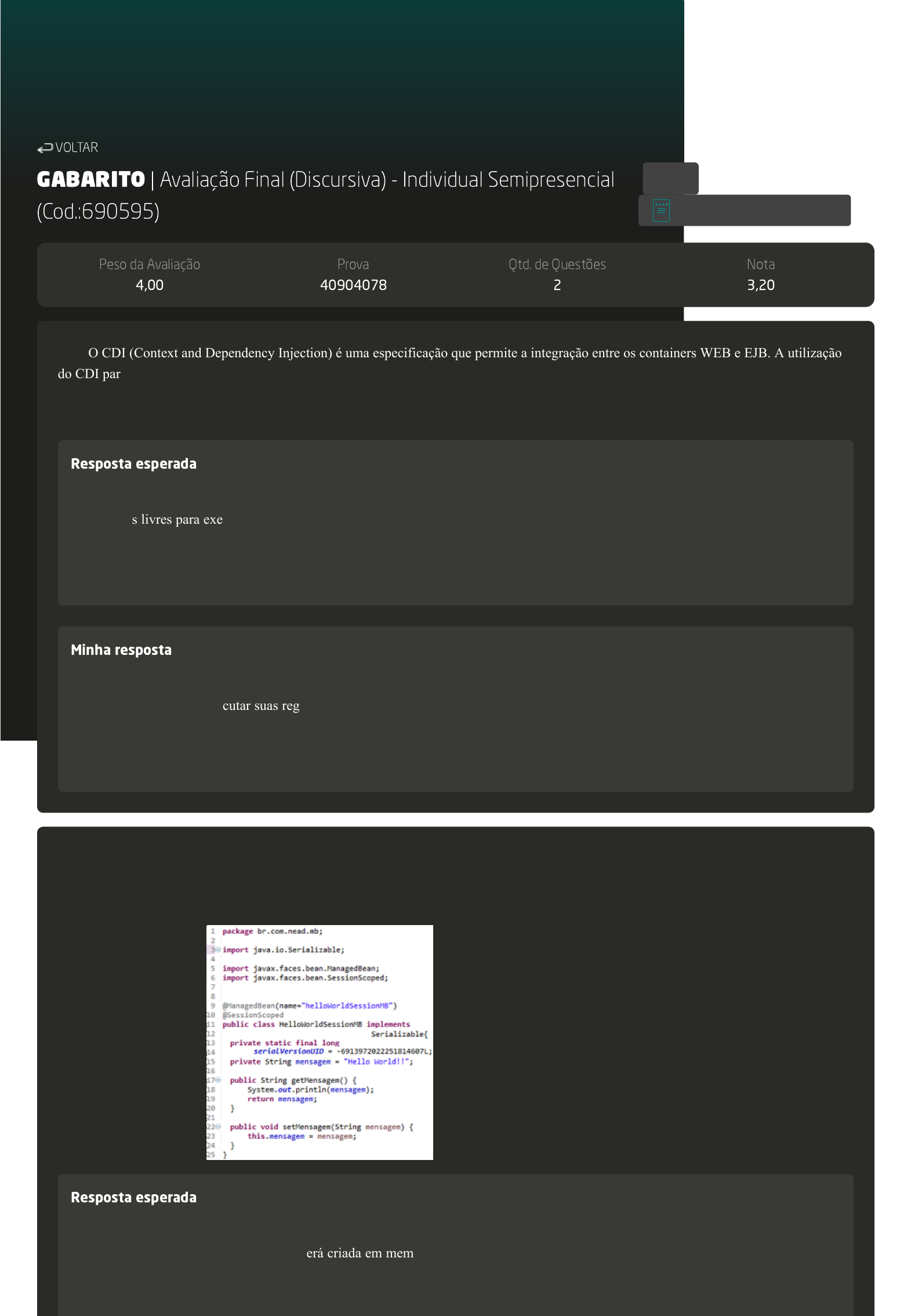 GABARITO | Avaliação Final (Discursiva) - Individual Semipresencial (Cod.:690595) Peso da Avaliação 4,00 Prova 40904078 Qtd. de Questões 2 Nota 3,20 O CDI (Context and Dependency Injection) é uma especificação que permite a integração entre os containers WEB e EJB. A utilização do CDI para injeção de dependências possui várias vantagens, como a simplificação do código-fonte, baixo acoplamento entre os objetos e a flexibilidade no gerenciamento do ciclo de vida dos objetos. Neste contexto, descreva o motivo pelo qual a utilização de injeção de dependência torna o código-fonte mais simplificado e com baixo acoplamento. Resposta esperada A simplificação de código-fonte ocorre pois os objetos da aplicação são liberados da tarefa de trazer suas próprias dependências, tornando-os livres para executar suas regras de negócios. Além disso, injetando uma classe, esta pode ser reutilizada em qualquer um dos métodos da classe que ela foi injetada, não necessitando instanciá-la cada vez que necessitar utilizá-la. O baixo acoplamento ocorre devido ao objeto conhecer suas dependências apenas por sua interface pública, sendo possível desta forma ser trocada a implementação da dependência, sem que o objeto dependente seja afetado. Minha resposta A simplificação de código-fonte ocorre pois os objetos da aplicação são liberados da tarefa de trazer suas próprias dependências, tornando-os livres para executar suas regras de negócios. Além disso, injetando uma classe, esta pode ser reutilizada em qualquer um dos métodos da classe que ela foi injetada, não necessitando instanciá-la cada vez que necessitar utilzá-la. O baixo acoplamento ocorre devido ao objeto conhecer suas dependências apenas por sua interface pública, sendo possível desta forma ser trocada a implementação da dependência, sem que o objeto dependente seja afetado. Uma das principais classes em uma aplicação desenvolvida pelo framework Java Server Faces (JSF) são os Managed Beans, os quais servem para intermediar as camadas View e Model da aplicação. Neste sentido, uma das funcionalidades de uma classe Managed Bean é receber requisições da tela e enviá-las para a camada Model. Neste contexto, analise o código-fonte a seguir e disserte explicando os códigos- fonte das linhas 9, 10 e 17. Resposta esperada Na linha 9, é especificada a nomenclatura que o Managed Bean será chamado na página HXTML. Na linha 10, é especificada a anotação "SessionScoped", definindo que a classe será criada em memória (instanciada) uma única vez enquanto durar a sessão do usuário atual, e quando fechada a sessão do usuário, este objeto será eliminado da memória (destruído). Na linha 17, é implementado um método que VOLTAR A+ Alterar modo de visualização 1 2 retorna o valor do atributo "mensagem" do Managed Bean "HelloWorldSessionMB", imprimindo no console o valor do atributo quando for método invocado. Minha resposta Na linha 9, especifica a nomenclatura que o Managed Bean será chamado na página HXTML. Na linha 1O, é especificada a anotação "SessionScoped", definindo que a classe será criada em memória instanciada uma única vez enquanto durar a sessão do usuário atual, e quando fechada a sessão do usuário, este objeto será eliminado da memória. Na linha 17, é implementado um método que retorna o valor do atributo "mensagem" do Managed Bean "HelloWorldSessionMB", imprimindo no console o valor do atributo quando for método invocado.