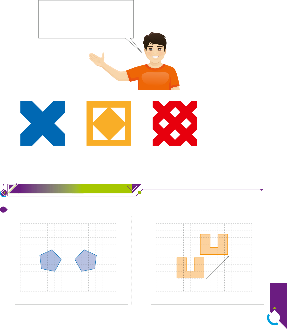 Analise os kirigamis abaixo, que apresentam diferentes níveis de dificuldade para serem feitos, e reproduza-os. LEMBRE-SE DE OBSERVAR OS DESENHOS E IDENTIFICAR AS TRANSFORMAÇÕES GEOMÉTRICAS PARA PRODUZIR UM MOLDE QUE POSSA SER RECORTADO EM UM PAPEL DOBRADO. PRATICANDO O APRENDIZADO 1 Escreva qual foi a isometria realizada em cada item. a) r Reflexão. b) Translação. Agora que você aprendeu sobre transformações geométricas e sobre o kirigami, construa novos modelos e divirta-se desafiando os colegas a reproduzi-los. V o lh a h /S h u tt e rs to ck Il ê C o m u n ic a ç ã o /A rq u iv o d a e d it o ra 299 M AT E M ÁT IC A M Ó D U LO 1 7 PH_EF2_8ANO_MAT_288a302_CAD3_MOD17_CA.indd 299 31/03/20 15:30 c) Rotação. d) Reflexão. 2 Qual é a distância do deslocamento da translação re- presentada a seguir? 11 unidades de comprimento 3 Indique o ângulo e o sentido de rotação da figura azul- -escura em cada caso a seguir. a) 45° no sentido anti-horário ou 315° no sentido horário. b) 30° no sentido horário ou 330° no sentido anti-horário. c) 90° no sentido horário ou 270° no sentido anti-horário. 4 Represente todos os eixos de simetria da figura a seguir. 300 M AT E M ÁT IC A M Ó D U LO 1 7 PH_EF2_8ANO_MAT_288a302_CAD3_MOD17_CA.indd 300 31/03/20 15:30 APLICANDO O CONHECIMENTO 1 Represente as isometrias solicitadas em cada item. a) Reflexão em relação à reta s. s r b) Rotação de 60° no sentido anti-horário em relação ao ponto P. P c) Translação de acordo com o vetor abaixo. 2 Usando compasso e transferidor, realize duas rotações sucessivas de 45° no sentido horário em relação ao ponto D. B C A D A' A" C" B" B' C' a 5 45° b 5 45° 3 Represente a reflexão da figura abaixo em relação ao ponto X. X Essa reflexão corresponde a alguma outra isometria? Sim. Ela corresponde a uma rotação de 180° em qualquer s entido em relação ao ponto X. 301 M AT E M ÁT IC A M Ó D U LO 1 7 PH_EF2_8ANO_MAT_288a302_CAD3_MOD17_CA.indd 301 31/03/20 15:30 DESENVOLVENDO HABILIDADES 1 Vinícius é fotógrafo especializado em obter imagens da natureza. Em sua última viagem, ele capturou imagens da superfície de um lago que parecia um espelho. Ob- serve uma de suas fotografias. Essa fotografia transmite a ideia de qual isometria? a) Translação na direção horizontal. b) Reflexão em relação a uma reta. c) Rotação em sentido horário. d) Reflexão em relação a um ponto. 2 A turma do 8º ano está no labo- ratório usando espelhos para fa- zer experiências com isometrias. Sobre qual das linhas ao lado os alunos devem posicionar um es- pelho para obter a figura de uma estrela de 5 pontas� a) Linha A. b) Linha B. c) Linha C. d) Linha D. 3 Renata está produzindo uma tela utilizando a técnica de carimbos. A cada novo desenho que carimba na tela, ela considera o desenho anterior e promove um giro de 45¡ no sentido horár io, tendo o ponto central do carimbo como centro de rotação. Observe abaixo o último desenho que Renata carimbou na tela. Como deve ser a próximo desenho que Renata vai carimbar? a) b) c) d) 4 Ivo é pesquisador de imagens, e solicitaram a ele uma fotografia que apresente a ideia de translação. Qual das imagens abaixo Ivo deve escolher para apresentar em sua pesquisa? a) b) c) d) A B C D M a k s im _ m /S h u tt e rs to ck b u m p 2 3 /S h u tt e rs to ck V it a lli y /S h u tt e rs to ck Ir in a T a rz ia n /S h u tt e rs to ck D a n ie le P ie tr o b e lli /S h u tt e rs to ck Il u s tr a ç õ e s : B a n c o d e im a g e n s /A rq u iv o d a e d it o ra 302 M AT E M ÁT IC A M Ó D U LO 1 7 PH_EF2_8ANO_MAT_288a302_CAD3_MOD17_CA.indd 302 31/03/20 15:30