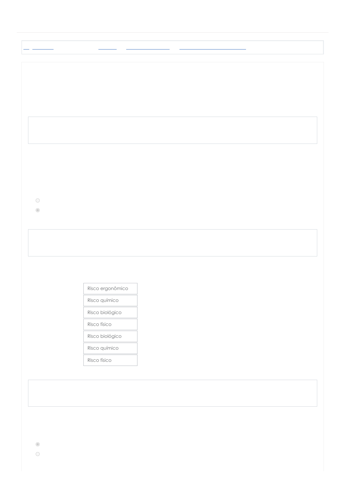 03/02/2022 11:40 2.3 Teste seus conhecimentos: Revisão da tentativa https://aprendamais.mec.gov.br/mod/quiz/review.php?attempt=384398&cmid=14170 1/5 Página inicial / Meus cursos / ST2022A / 2 Riscos ambientais / 2.3 Teste seus conhecimentos Iniciado em quinta, 3 fev 2022, 12:06 Estado Finalizada Concluída em quinta, 3 fev 2022, 12:38 Tempo empregado 32 minutos Avaliar 9,00 de um máximo de 10,00(90%) Questão 1 Correto Atingiu 1,00 de 1,00 Questão 2 Correto Atingiu 1,00 de 1,00 Questão 3 Correto Atingiu 1,00 de 1,00 Os efeitos das radiações ionizantes sobre o organismo humano dependem dos seguintes fatores: tempo de duração da exposição, intensidade da exposição, comprimento de onda da radiação e região do espectro em que se situam. Escolha uma opção: Verdadeiro Falso Relacione as colunas, indicando o tipo de risco com seu respectivo exemplo: Postura inadequada Poeiras Bactérias Frio Fungos Névoas de pinturas Vibrações Risco ergonômico Risco químico Risco biológico Risco físico Risco biológico Risco químico Risco físico As inspeções de segurança possibilitam a determinação de meios prevencionistas antes da ocorrência de acidentes. Escolha uma opção: Verdadeiro Falso https://aprendamais.mec.gov.br/ https://aprendamais.mec.gov.br/course/view.php?id=318 https://aprendamais.mec.gov.br/course/view.php?id=318#section-2 https://aprendamais.mec.gov.br/mod/quiz/view.php?id=14170 03/02/2022 11:40 2.3 Teste seus conhecimentos: Revisão da tentativa https://aprendamais.mec.gov.br/mod/quiz/review.php?attempt=384398&cmid=14170 2/5 Questão 4 Correto Atingiu 1,00 de 1,00 Questão 5 Correto Atingiu 1,00 de 1,00 Questão 6 Correto Atingiu 1,00 de 1,00 Complete a frase com as palavras corretas: O corpo humano, quando exposto a temperaturas, perde calor para o meio ambiente. Se as perdas de calor forem superiores ao calor produzido pelo metabolismo do trabalhador, haverá a na tentativa de evitar a perda excessiva do calor corporal, e o fluxo sanguíneo será em razão direta da queda de temperatura sofrida. baixas vasoconstrição reduzido Sobrecarga térmica é a quantidade de energia que o organismo deve dissipar para atingir o equilíbrio térmico. Escolha uma opção: Verdadeiro Falso O exercício de trabalho em condições acima dos limites de tolerância estabelecidos pelo Ministério do Trabalho, é denominado a. trabalho perigoso. b. trabalho oneroso. c. trabalho insalubre. d. trabalho virtuoso. e. todas estão incorretas. 03/02/2022 11:40 2.3 Teste seus conhecimentos: Revisão da tentativa https://aprendamais.mec.gov.br/mod/quiz/review.php?attempt=384398&cmid=14170 3/5 Questão 7 Correto Atingiu 1,00 de 1,00 Questão 8 Correto Atingiu 1,00 de 1,00 Selecione a opção que indica a ordem correta das etapas nas inspeções de segurança: a. Observação, informação, registro, acompanhamento e encaminhamento b. Informação, registro, observação, encaminhamento e acompanhamento c. Observação, informação, registro, encaminhamento e acompanhamento d. Informação, encaminhamento, registro, observação e acompanhamento e. Acompanhamento, observação, informação, encaminhamento e registro Consideram-se riscos ambientais, segundo a NR 9, os agentes existentes nos ambientes de trabalho que, em função de sua natureza, concentração ou intensidade e tempo de exposição, são capazes de causar danos à saúde do trabalhador. Esse agentes podem ser: I - Físicos II - Químicos III - Biológicos Está(ão) correta(s): a. Apenas I b. Apenas III c. Apenas II e III d. Apenas I e III e. Todas estão corretas 03/02/2022 11:40 2.3 Teste seus conhecimentos: Revisão da tentativa https://aprendamais.mec.gov.br/mod/quiz/review.php?attempt=384398&cmid=14170 4/5 Questão 9 Correto Atingiu 1,00 de 1,00 Questão 10 Incorreto Atingiu 0,00 de 1,00 Se a temperatura interior do corpo baixar de 36°C, poderá ocorrer: I) Redução das atividades fisiológicas II) Aumento da taxa metabólica III) Queda de pressão arterial Está(ão) correta(s): a. I somente b. Todas as alternativas c. I e II somente d. I e III somente e. II somente É considerado um som capaz de causar uma sensação indesejável e desagradável para o trabalhador: Resposta: RUIDO ◄ 2.2 Mapa de riscos ambientais Seguir para... 3.1 Comissão interna de prevenção de acidentes ► https://aprendamais.mec.gov.br/mod/page/view.php?id=14169&forceview=1 https://aprendamais.mec.gov.br/mod/page/view.php?id=14172&forceview=1 03/02/2022 11:40 2.3 Teste seus conhecimentos: Revisão da tentativa https://aprendamais.mec.gov.br/mod/quiz/review.php?attempt=384398&cmid=14170 5/5 Resumo de retenção de dados Obter o aplicativo para dispositivos móveis https://aprendamais.mec.gov.br/admin/tool/dataprivacy/summary.php https://download.moodle.org/mobile?version=2020110904&lang=pt_br&iosappid=633359593&androidappid=com.moodle.moodlemobile