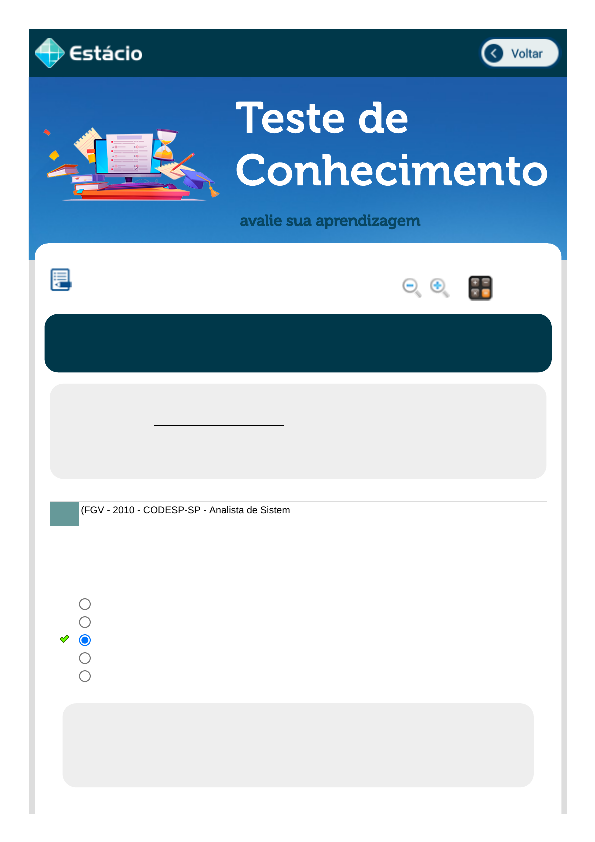 29/03/2022 17:36 Estácio: Alunos https://simulado.estacio.br/alunos/ 1/6 Teste de Conhecimento avalie sua aprendizagem (FGV - 2010 - CODESP-SP - Analista de Sistemas) O processo de gerenciamento financeiro dos serviços de TI necessita prover pontos de controle que permitam avaliar sua eficiência, eficácia, efetividade e economicidade, que constituem pontos de controle conhecidos como indicadores-chave de desempenho (Key Performance Indicator - KPI). Os indicadores índice de custos contabilizados e índice de consultas atendidas dentro do prazo estabelecido são pontos de controle visualizados, respectivamente, nas seguintes perspectivas: ENTREGA E SUPORTE EM TI Lupa Calc. EEX0055_201907147561_TEMAS Aluno: ANTONIO BENTO DA COSTA NETO Matr.: 201907147561 Disc.: ENT E SUP EM TI 2022.1 EAD (GT) / EX Prezado (a) Aluno(a), Você fará agora seu TESTE DE CONHECIMENTO! Lembre-se que este exercício é opcional, mas não valerá ponto para sua avaliação. O mesmo será composto de questões de múltipla escolha. Após responde cada questão, você terá acesso ao gabarito comentado e/ou à explicação da mesma. Aproveite para se familiarizar com este modelo de questões que será usado na sua AV e AVS. 1. Efetividade e Economicidade. Eficiência e Economicidade. Eficiência e Eficácia. Efetividade e Eficiência. Efetividade e Eficácia. Data Resp.: 29/03/2022 17:32:31 Explicação: O mapeamento de fluxo de valor pode potencializar o alcance desses indicadores. A combinação de ambos vai otimizar todos os procedimentos de avaliação das rotinas produtivas e a verificação do cumprimento das metas estabelecidas, propiciando eficiência e eficácia nos processos e rotinas. javascript:voltar(); javascript:voltar(); javascript:diminui(); javascript:aumenta(); javascript:calculadora_on(); 29/03/2022 17:36 Estácio: Alunos https://simulado.estacio.br/alunos/ 2/6 (FGV - 2014 - DPE-RJ - Técnico Superior Especializado - Gestão em Tecnologia da Informação) O planejamento estratégico de TI é necessário para gerenciar todos os recursos de TI em alinhamento com as prioridades e estratégias de negócio. O plano estratégico deve melhorar o entendimento das partes interessadas no que diz respeito a oportunidades e limitações da TI, avaliar o desempenho atual e esclarecer o nível de investimento requerido. Dentre as ações que podem levar a uma organização a alcançar a definição de um plano estratégico de TI está: (Concurso - Companhia de Processamento de Dados do Estado da Bahia) Para grande parte das organizações, a TI já faz muito mais do que a função de apenas entregar produtos de tecnologias. Assinale a alternativa que apresenta essa nova tarefa da TI nas empresas e organizações. (CESPE - 2012 - TJ - AL - Analista Judiciário - Análise de Sistemas) A finalidade do processo de gerenciamento da demanda da estratégia de serviços constante da ITIL v3 é 2. definição de uma estrutura de processos de TI. uma prática de software que está iniciando a implantação do CMMI. a realização de análises da causa-raiz do problema reportado. a obtenção de parecer profissional para aspectos legais e contratuais. o estabelecimento de um esquema de priorização de objetivos de negócio, que quantifique os requisitos de negócio. Data Resp.: 29/03/2022 17:33:27 Explicação: Existem vários benefícios provenientes do alinhamento da área de TI e Negócios, entre eles, está priorização do Negócios e quantificação de investimentos necessários à implantação da solução de TI. 3. Governança corporativa e contábil de entes da organização. Gerenciamento de infraestrutura pessoal. Prática de ensino e desenvolvimento individual. Estratégia de negócio pessoal. Parcerias estratégicas com os demais setores de negócio. Data Resp.: 29/03/2022 17:34:28 Explicação: A relação entre a área de Tecnologia da Informação (TI) e a área de negócios mudou bastante. Se no passado o objetivo da área de TI era manter a infraestrutura funcional, atualmente, o foco está em alinhar a área de Tecnologia de Informação às estratégias de negócios. A qualidade e a eficiência operacional se tornaram obrigatórias para as empresas, frente a um mercado tão competitivo, exigente e agressivo. 4. gerenciar os fornecedores e os contratos necessários ao cumprimento dos serviços prestados. assegurar o cumprimento eficaz, dentro do custo previsto, das demandas evolutivas do negócio. 29/03/2022 17:36 Estácio: Alunos https://simulado.estacio.br/alunos/ 3/6 (FCC - 2014 - Câmara Municipal de São Paulo - SP - Consultor Técnico Legislativo - Informática) Para responder à questão, considere o contexto abaixo e seus respectivos eventos. 1. A usuária Ana informa ao serviço de atendimento que não está conseguindo efetuar logon (autenticar- se) para acessar a rede interna. 2. O atendente entra em contato com um técnico de suporte nível 1, José, que é designado para eliminar o incidente. 3. José consulta o histórico do equipamento a fim de verificar se houve ocorrências anteriores. Não há. José não pôde resolver o incidente, tampouco detectar a causa, e logo informa o ocorrido ao funcionário do serviço de atendimento. 4. Este, por sua vez, entra em contato com um técnico de suporte nível 2, João, agora designado a intervir. 5. Paralelamente, o funcionário do serviço de atendimento recebe outras 5 notificações de incidentes, com características muito semelhantes às que foram informadas pela usuária Ana. 6. Como o atendente foi informado por João que o incidente até o momento não havia sido resolvido, ele acredita haver um problema generalizado, sem causa aparente, e então entra em contato com a equipe de especialistas. 7. Os especialistas, por sua vez, logo descobrem a causa do problema: um dos servidores está fisicamente danificado e precisa ser substituído. 8. Os especialistas solicitam, então, a troca do equipamento à equipe responsável pelo geren