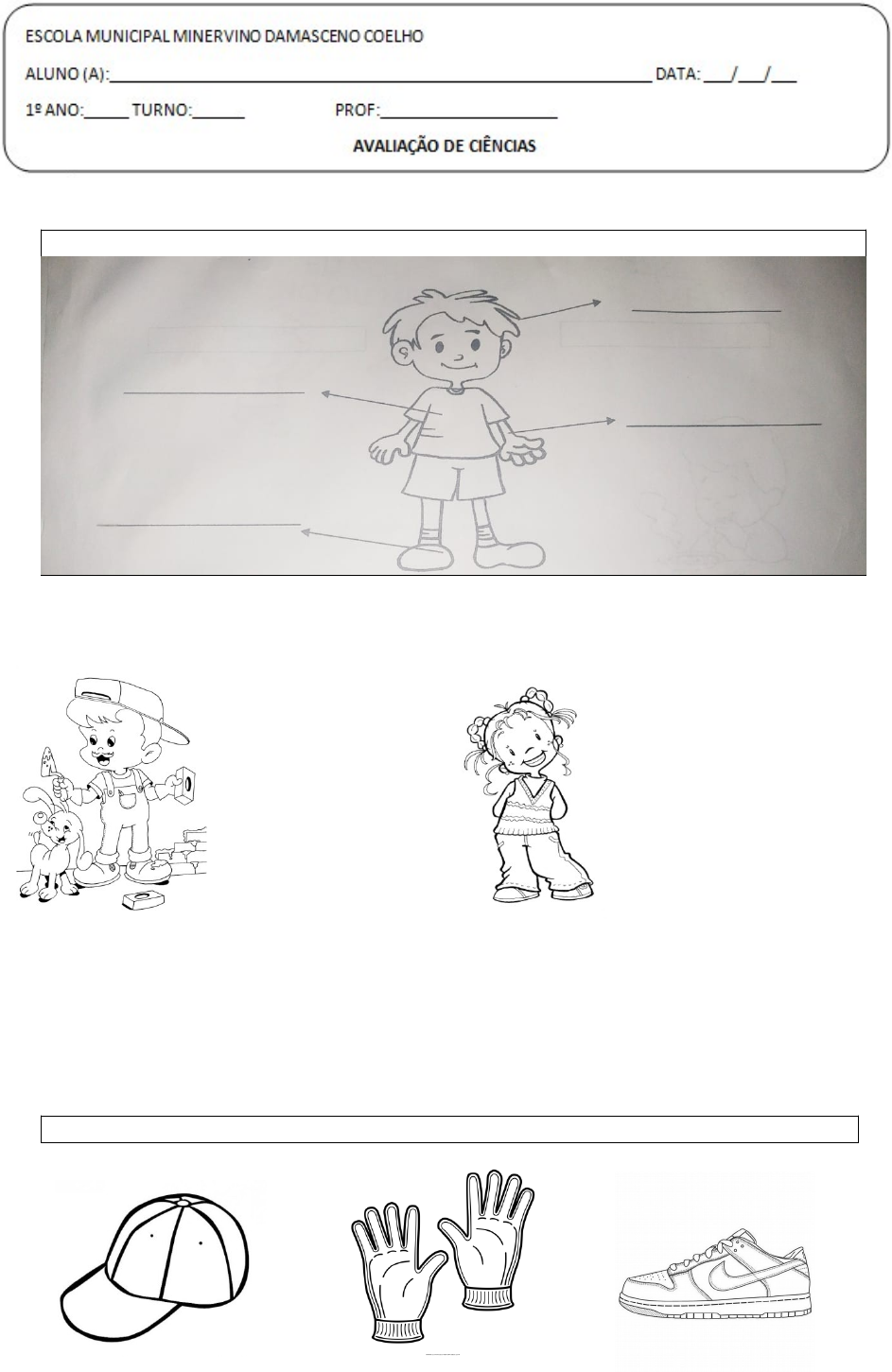 1º OBSERVE A FIGURA DO CORPO HUMANO E LOCALIZE AS PARTES DO CORPO HUMANO. TRONCO - MEMBROS SUPERIORES - MEMBROS INFERIORES - CABEÇA 2º CIRCULE O DESENHO QUE CARACTERIZA VOCÊ. 3º OBSERVE AS FIGURAS ABAIXO E LOCALIZE EM QUAL PARTE DO CORPO CADA FIGURA PODE SER USADA. PÉ - MÃO - CABEÇA 4º PODEMOS DIVIDIR O DIA EM TRÊS PERIODO: MANHÃ, TARDE E NOITE. ESCREVA EM QUAL PERIODO VOCÊ GERALMENTE REALIZA UMA DAS ATIVIDADES DAS CENAS ABAIXO. 5º PINTE AS CENAS, RECORTE AS FIGURAS E COLE-AS NOS QUADROS DE ACORDO COM AS ATIVIDADES QUE FAZEMOS DURANTE O DIA E DURANTE A NOITE.