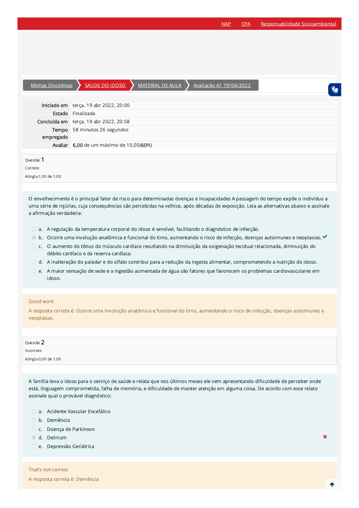 20/04/2022 18:26 Avaliação A1 19/04/2022: Revisão da tentativa https://ambienteacademico.com.br/mod/quiz/review.php?attempt=274841&cmid=312841 1/5 Minhas Disciplinas SAUDE DO IDOSO MATERIAL DE AULA Avaliação A1 19/04/2022 Iniciado em terça, 19 abr 2022, 20:00 Estado Finalizada Concluída em terça, 19 abr 2022, 20:58 Tempo empregado 58 minutos 26 segundos Avaliar 6,00 de um máximo de 10,00(60%) Questão 1 Correto Atingiu 1,00 de 1,00 Questão 2 Incorreto Atingiu 0,00 de 1,00 O envelhecimento é o principal fator de risco para determinadas doenças e incapacidades A passagem do tempo expõe o indivíduo a uma série de injúrias, cuja consequências são percebidas na velhice, após décadas de exposição. Leia as alternativas abaixo e assinale a a�rmação verdadeira: a. A regulação da temperatura corporal do idoso é sensível, facilitando o diagnóstico de infecção. b. Ocorre uma involução anatômica e funcional do timo, aumentando o risco de infecção, doenças autoimunes e neoplasias. c. O aumento do tônus do músculo cardíaco resultando na diminuição da oxigenação tecidual relacionada, diminuição do débito cardíaco e da reserva cardíaca. d. A inalteração do paladar e do olfato contribui para a redução da ingesta alimentar, comprometendo a nutrição do idoso. e. A maior sensação de sede e a ingestão aumentada de água são fatores que favorecem os problemas cardiovasculares em idoso. Good work A resposta correta é: Ocorre uma involução anatômica e funcional do timo, aumentando o risco de infecção, doenças autoimunes e neoplasias. A família leva o idoso para o serviço de saúde e relata que nos últimos meses ele vem apresentando di�culdade de perceber onde está, linguagem comprometida, falha de memória, e di�culdade de manter atenção em alguma coisa. De acordo com esse relato assinale qual o provável diagnóstico: a. Acidente Vascular Encefálico b. Demência c. Doença de Parkinson d. Delirium e. Depressão Geriátrica That's not correct A resposta correta é: Demência NAP CPA Responsabilidade Socioambiental https://ambienteacademico.com.br/my/ https://ambienteacademico.com.br/course/view.php?id=3917 https://ambienteacademico.com.br/course/view.php?id=3917§ion=2 https://ambienteacademico.com.br/mod/quiz/view.php?id=312841 https://codely-fmu-content.s3.amazonaws.com/Moodle/NAP/inicial/nap/fmu/index.html https://codely-fmu-content.s3.amazonaws.com/Moodle/CPA/landing_CPA/index.html https://portal.fmu.br/sustentabilidade 20/04/2022 18:26 Avaliação A1 19/04/2022: Revisão da tentativa https://ambienteacademico.com.br/mod/quiz/review.php?attempt=274841&cmid=312841 2/5 Questão 3 Correto Atingiu 1,00 de 1,00 Questão 4 Correto Atingiu 1,00 de 1,00 As entidades governamentais de atendimento ao idoso podem sofrer as seguintes penalidades, exceto a. Multa b. Afastamento provisório de seus dirigentes c. Fechamento de unidade ou interdição de programa d. Afastamento de�nitivo de seus dirigentes e. Advertência Good work A resposta correta é: Multa Um paciente de 88 anos comparece em um serviço de emergência acompanhado da família e relata que o idoso subitamente apresentou falta de ar, ansiedade, confusão mental, dor no peito, está urinando pouco e não consegue �car em pé. Podemos pensar que o paciente está apresentando: a. Hipertensão arterial. b. Insu�ciência cardíaca congestiva. c. Infarto agudo do miocárdio. d. Pneumonia bacteriana. e. Acidente vascular cerebral. Good work A resposta correta é: Infarto agudo do miocárdio. NAP CPA Responsabilidade Socioambiental https://codely-fmu-content.s3.amazonaws.com/Moodle/NAP/inicial/nap/fmu/index.html https://codely-fmu-content.s3.amazonaws.com/Moodle/CPA/landing_CPA/index.html https://portal.fmu.br/sustentabilidade 20/04/2022 18:26 Avaliação A1 19/04/2022: Revisão da tentativa https://ambienteacademico.com.br/mod/quiz/review.php?attempt=274841&cmid=312841 3/5 Questão 5 Incorreto Atingiu 0,00 de 1,00 Questão 6 Incorreto Atingiu 0,00 de 1,00 A Hipertensão Arterial Sistêmica é uma das doenças de maior prevalência no mundo moderno e é caracterizada pelo aumento da pressão arterial. Assinale a alternativa CORRETA: a. A Insu�ciência Cardíaca Congestiva é um fator de risco para a Hipertensão Arterial. b. O enfermeiro deve ter o conhecimento das medicações preconizadas pelo Ministério da Saúde, considerando que é a principal diretriz no tratamento da Hipertensão Arterial. c. No histórico de enfermagem deverá estar atento para: antecedentes familiares e psicossociais, fatores de risco como diabetes, tabagismo, alcoolismo, obesidade, dislipidemia, sedentarismo e estresse atuais, entre outros. d. Nas unidades de hemodiálise uma pequena porcentagem dos pacientes tem o diagnóstico de hipertensão arterial, considerando que essa a doença não tem relação com a insu�ciência renal crônica. e. A hipertensão arterial é um fator de risco para o desenvolvimento da Diabetes Mellitus. That's not correct A resposta correta é: No histórico de enfermagem deverá estar atento para: antecedentes familiares e psicossociais, fatores de risco como diabetes, tabagismo, alcoolismo, obesidade, dislipidemia, sedentarismo e estresse atuais, entre outros. No AME (Ambulatório Médico de Especialidade), o paciente Paulo Cesar com 77 anos de idade, faz acompanhamento no departamento de neurologia. Em seu prontuário, consta o diagnóstico de demência não especi�cada. No entanto, na última consulta, queixou-se ao médico e a enfermeira que estava apresentando esquecimento constante, di�culdade de planejar e realizar qualquer atividade, incapacidade de reconhecer estímulos visuais, auditivos e táteis, além de di�culdade na fala. Após avaliação da equipe multipro�ssional, resolveram realizar exames de imagem, laboratoriais e avaliação cognitiva. O médico então apresentou agora um diagnostico de�nitivo. Qual seria esse diagnóstico? a. Demência por