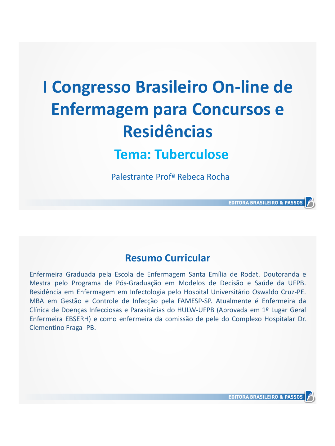 Tema: Tuberculose Palestrante Profª Rebeca Rocha I Congresso Brasileiro On-line de Enfermagem para Concursos e Residências Resumo Curricular Enfermeira Graduada pela Escola de Enfermagem Santa Emília de Rodat. Doutoranda e Mestra pelo Programa de Pós-Graduação em Modelos de Decisão e Saúde da UFPB. Residência em Enfermagem em Infectologia pelo Hospital Universitário Oswaldo Cruz-PE. MBA em Gestão e Controle de Infecção pela FAMESP-SP. Atualmente é Enfermeira da Clínica de Doenças Infecciosas e Parasitárias do HULW-UFPB (Aprovada em 1º Lugar Geral Enfermeira EBSERH) e como enfermeira da comissão de pele do Complexo Hospitalar Dr. Clementino Fraga- PB. Francislana Petrucia da Silva - 721.819.311-00 doença infecciosa e contagiosa, causada pelo Mycobacterium tuberculosis - Bacilo de Koch (BK); inalação de aerossóis, salvo em raríssimas exceções (TB congênita); até baciloscopia negativa; tosse persistente seca ou produtiva por 3 semanas ou mais, febre vespertina, emagrecimento, sudorese noturna; identificar sintomáticos respiratórios, com 2 baciloscopias*. Conceito Mecanismo de transmissão Sintomas da TB pulmonar Busca ativa Tuberculose * Nos locais onde há equipamento de TRM-TB, é necessária apenas 1 amostra de escarro no momento da identificação do sintomático respiratório (BRASIL, 2018). 1. (Prefeitura de João Pessoa/PB/AOCP/2018) Sobre a tuberculose, é correto afirmar que a) é uma doença causada pelo Mycobacterium leprae. b) a tuberculose pulmonar pode-se apresentar sob a forma primária, secundária ou miliar. c) a tuberculose pulmonar primária é mais comum em adultos, sendo que o paciente apresenta-se calmo. d) na tuberculose pulmonar primária, o paciente apresenta-se com febre alta e falta de sudorese. Francislana Petrucia da Silva - 721.819.311-00 Padrão Contato Gotículas Aerossóis Higienização das mãos Luvas e avental Máscara cirúrgica Máscara PFF2 (N-95) Profissional Todos os pacientes. Infecções na pele ou Patógenos MDR. Transmissão respiratória. Partículas > 5 micra. Transmissão respiratória. Partículas ≤ 5 micra. 2. (Residências em Áreas Profissionais de Saúde/UPE/2019) A tuberculose é considerada um agravo em saúde pública com grande magnitude, transcendência e vulnerabilidade. Sobre esse assunto, assinale a alternativa CORRETA. a) A tuberculose pulmonar apresenta-se, exclusivamente, sob a forma primária ou secundária. Os sintomas clássicos da tuberculose pulmonar são: a tosse produtiva, febre vespertina, sudorese diurna e emagrecimento. b) As formas de tuberculose extrapulmonar têm seus sinais e sintomas dependentes dos órgãos ou sistemas acometidos. Os órgãos ou sistemas que são acometidos pela tuberculose são apenas o sistema linfático, sanguíneo, a pele e os ossos. c) A prova tuberculínica consiste na inoculação intradérmica de um derivado proteico do Mycobacterium tuberculosis para medir a resposta imune celular a esses antígenos. Essa forma de diagnóstico não deve ser utilizada para o diagnóstico de infecção latente pelo M. tuberculosis. Francislana Petrucia da Silva - 721.819.311-00 2. (Residências em Áreas Profissionais de Saúde/UPE/2019) d) Está indicada a vacina BCG-ID para os contatos intradomiciliares de portadores de hanseníase, com a presença de sinais e sintomas da doença e com classificação operacional como um caso multibacilar. e) A tuberculose pulmonar e a tuberculose laríngea são classificadas como doenças de transmissão aérea e requerem medidas administrativas, ambientais e de proteção individual, que diminuam o risco de transmissão da doença. 3. (Residência Multiprofissional UFRN/COMPERVE/2019) As medidas de controle da transmissão da tuberculose nas instituições de saúde se classificam em administrativas, de controle ambiental e de proteção individual. Nesse contexto, é considerada um recurso de proteção individual para transmissão da tuberculose: a) equipamento de proteção respiratória para prevenção de doenças transmiti das por gotícula – máscara PFF2 (tipo cirúrgica). b) equipamento de proteção respiratória para prevenção de doenças transmitidas por aerossóis – máscara PFF2 (tipo N95). c) sistema de isolamento para doença de transmissão respiratória dotado de pressão negativa, filtro hepa ou irradiação ultravioleta. d) sistema de isolamento para doença de transmissão respiratória por meio da existência de quarto privativo. Francislana Petrucia da Silva - 721.819.311-00 (Residência Multiprofissional/HUB/CESPE/2017) Acerca de doenças agudas e crônicas, julgue o item subsequente. 4. Para evitar a transmissão da tuberculose, os profissionais de saúde, no atendimento a pacientes bacilíferos, devem fazer uso da máscara cirúrgica e oferecer a máscara N95/PFF2 a todos os pacientes confirmados com tuberculose ou sintomáticos respiratórios, isto é, aqueles com tosse por tempo maior ou igual a 2 semanas. ( ) CERTO ( ) ERRADO As principais medidas de prevenção e controle da tuberculose dizem respeito à identificação precoce de casos suspeitos e tratamento adequado dos casos confirmados. Medidas de prevenção e controle de tuberculose Também são importantes a oferta da vacina BCG, que previne as formas mais graves em crianças, a implementação da identificação e do tratamento da infecção latente da tuberculose, além das medidas de controle de infecção por aerossóis em serviços de saúde. Francislana Petrucia da Silva - 721.819.311-00 5. (UEPA/FADESP/2020) Após a identificação de casos novos de tuberculose na Unidade de Saúde Marta Veiga, a enfermeira responsável pelo programa, preocupada em obedecer às recomendações do Ministério da Saúde, reuniu-se com os técnicos de enfermagem e esclareceu que, dentre as principais medidas de prevenção e controle dessa doença, encontra(m)-se a(o) a) encaminhamento imediato dos pacientes que apresentam efeitos adversos graves e comorbid