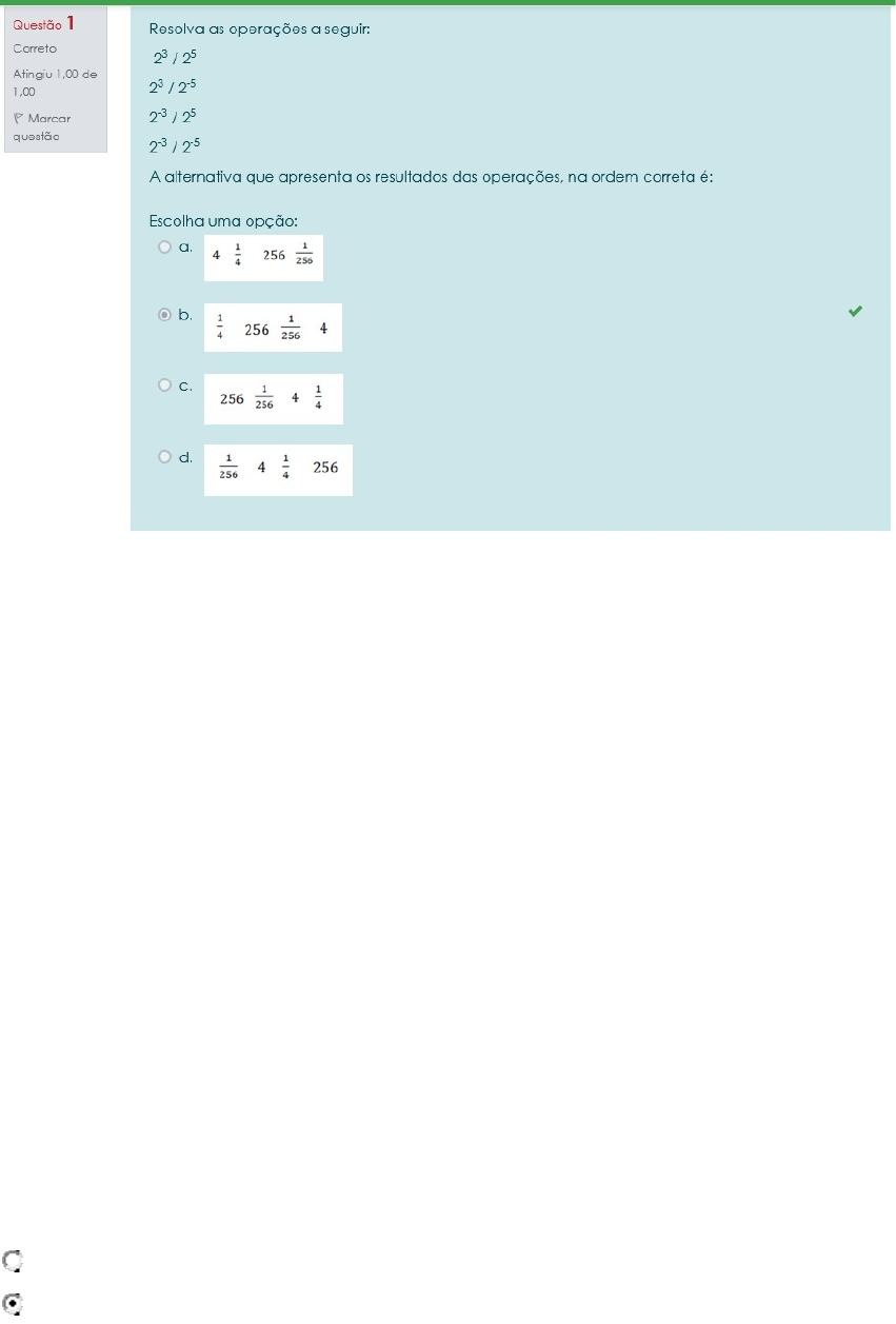 4.4 Matematica Basica Nivelamento - Teste seus conhecimentos - propriedades da potenciação Feedback Sua resposta está correta. 23 / 25 = 23-5 = 2-2 = 1/22 = 1/4 23 / 2-5 = 23 - ( - 5) = 23+5 = 28 = 256 2-3 / 25 = 2- 3 - 5 = 2-8 = 1/28 = 1/256 2-3 / 2-5 = 2-3 - ( - 5) = 2-3+5 = 22 = 4 Questão 2 Correto Texto da questão O resultado da operação abaixo é 81. (33)3 Escolha uma opção: Verdadeiro Falso Questão 3 Correto Texto da questão Calcule o resultado da operação a seguir, sem o uso da calculadora, e indique o valor no espaço reservado para a resposta: 0,5 - 3 Resposta: Feedback Questão 4 Correto Texto da questão Calcule o resultado da operação a seguir, sem o uso da calculadora, e indique o valor no espaço reservado para a resposta: - x3 - ( - x)3 Resposta: Feedback - x3 - ( - x3) = - x3 + x3 = 0 Questão 7 Correto Texto da questão Calcule o resultado da operação a seguir, sem o uso da calculadora, e indique o valor no espaço reservado para a resposta: x2 - ( - x)2 Resposta: Feedback x2 - x2 = 0 8 0 0