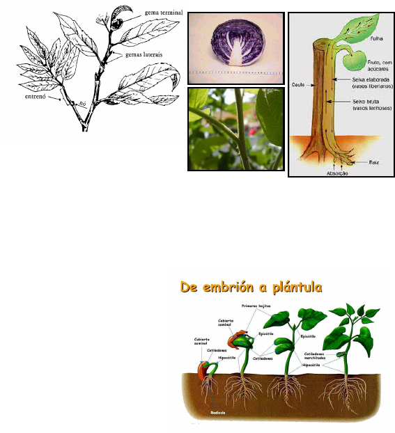 caule - 1 Botânica - Prof. Dr. Pablo G. Carrasco Caule Órgão vegetativo, geralmente aéreo, que produz e suporta folhas, flores e frutos, especializado na condução de seiva e sustentação, podendo funcionar como órgão de reserva, geralmente aclorofilado, aéreo e apresentando fototropismo positivo; quando jovem, realiza fotossíntese; às vezes efetua propagação vegetativa ou reserva de nutrientes. Morfologia externa nó região geralmente dilatada de onde saem as folhas entre-nó (meritalo) região entre dois nós consecutivos gema terminal (apical) região meristemática que promove crescimento em altura e ramificação gema lateral (axilar) região meristemática que promove ramificação lateral, muitas vezes, permanecendo dormente Quanto à origem gêmula do caulículo do embrião exógena a partir de gemas caulinares caule - 2 Quanto à forma cilíndrico, cônico, comprimido ou achatado, anguloso, sulcado, estriado, bojudo ou barrigudo. Quanto à consistência herbáceo, sublenhoso, lenhoso Quanto ao habitat aéreos, terrestres ou aquáticos Aéreos eretos tronco haste escapo estipe colmo (cheio ou oco) rastejantes ou sarmentosos trepadores ou escandentes com estruturas de fixação volúveis estolho ou estolão pendentes pseudobulbo dilatação de base caulinar e foliar adjacente. Ex: orquídeas Obs: Em certos casos os caules são tão reduzidos que a planta Brevicaule é considerada Acaule. caule - 3 caule - 4 caule - 5 Subterrâneos rizoma / cormo tubérculo bulbo sólido bulbo escamoso bulbo tunicado bulbo composto xilopódio Crocus sativus cormo de Gladiolus sp. Tubérculo de Dioscorea bulbifera Allium sativum caule - 6 Narcissus sp. Allium cepa Watsonia bulbillifera Tulipa caule - 7 Adaptações São modificações dos caules normais, como conseqüência de outras funções que exercem ou da influência do meio físico. Tipos cladódio filocladódio espinhoso ( acúleo) gavinha suculento armazenador de açucares Obs: acúleos = tricomas rígidos caule - 8 Quanto ao tipo de ramificações Indivisos: caules estipe. Ramificados monopodial: predomínio de um eixo principal sobre os ramos laterais (Pinheiros) simpodial: eixo principal da planta é formado por tecidos originados de diversas gemas (Cactos; Ficus sp.) em dicásio: duas gemas laterais do caule dão origem a ramos que crescem mais do que o eixo principal (Pteridófitas). Quanto ao desenvolvimento caules com pouca ou nenhuma lignificação erva caules lignificados subarbusto: até 1m de altura arbusto: entre 1 e 5m de altura árvore: > 5m de altura. caule - 9 Diferenças entre raiz e caule raiz caule origem * radícula * gêmula do caulículo diferenças morfológicas * com coifa * sem coifa * sem gemas terminais e laterais * com gemas terminais e laterais * com região de pêlos absorventes * sem região de pêlos absorventes * sem folhas, flores e frutos * com folhas, flores e frutos * corpo sem divisão em nós e entrenós * corpo com divisão em nós e entrenós * com radicelas de origem endógena * com ramos de origem exógena (nas gemas axilares) diferenças fisiológicas * absorção de seiva * condução de seiva * crescimento subterminal * crescimento terminal * geotropismo positivo * geotropismo negativo * raro fotossintetizante * fotossintetizantes ou não * fototropismo negativo * fototropismo positivo * responsável pela fixação da planta no solo * responsável pela sustentação de todos os elementos provenientes da gêmula Dioscorea cayennensis caule - 10 Curcuma domestica Curcuma domestica Alpinia galanga caule - 11 Alpinia galanga Zingiber officinale Aéreos o Haste: não lenhoso, ereto, da maioria das ervas. o Tronco: lenhoso, de delgado a muito robusto, da maioria das árvores e arbustos. o Estipe: cilíndrico, não ramificado, com uma coroa de folhas no ápice. Típico das palmeiras. o Colmo: nós e entrenó bem marcados. Presente nas monocotiledôneas, podendo apresentar entrenós ocos (bambú) ou cheios (cana-de-açúcar). o Volúvel: que se enrola a um suporte. Trepadeiras e cipós. o Sarmentoso: prostrado, preso ao solo com raízes apenas em um ponto. Ex.: abóbora. o Estolão: eixo caulinar rastejante que emite raízes nos nós, fixando ao solo em mais de um ponto. Ex: morangueiro. o Cladódio: caule modificado com função fotossintetizante e/ou de reserva de água, geralmente áfilos ou com folhas transformadas em espinhos. Ex.: cactos, carqueja, fita-de-moça (filocládio). o Rizóforo: eixo caulinar com crescimento geotrópico positivo, portador de raízes adventícias que podem auxiliar na sustentação ou estabilização da planta. Ex.: Rhizophora. Subterrâneos: associados às funções de armazenamento e propagação vegetativa. o Rizoma: apresenta crescimento horizontal, formando diretamente folhas ou ramos verticais com folhas. Ex.: espada-de-são-jorge, bananeira. o Tubérculo: porção terminal entumescida de ramos caulinares longos e finos. Ex.: batata-inglesa. o Cormo: sistema caulinar espessado e comprimido verticalmente, geralmente envolvido por catáfilos secos. Ex.: palma-de-santa-rita. o Bulbo: caule comprimido, reduzido a um disco basal de onde partem catáfilos armazenadores, densamente dispostos. Tunicados e escamosos. o Xilopódio: geralmentelignificado e duro, comum em espécies de cerrado, podendo ser formado parcialmente por caule e raiz. Modificações caulinares: Gavinhas: estruturas que se enrolam a um suporte, sensíveis a estímulos de contato. Ex: maracujá, chuchu. Podem ter também origem foliar. Espinhos caulinares: são gemas que se desenvolvem formando ramos curtos e ponteagudos, com função de proteção contra predação. Encontram-se sempre na axila de folhas. Existem espinhos de origem foliar, como os existentes em Cactaceae. Em ambos os casos são estruturas vascularizadas, o que os diferencia dos acúleos que são meras formações epidérmicas, sem posição definida.