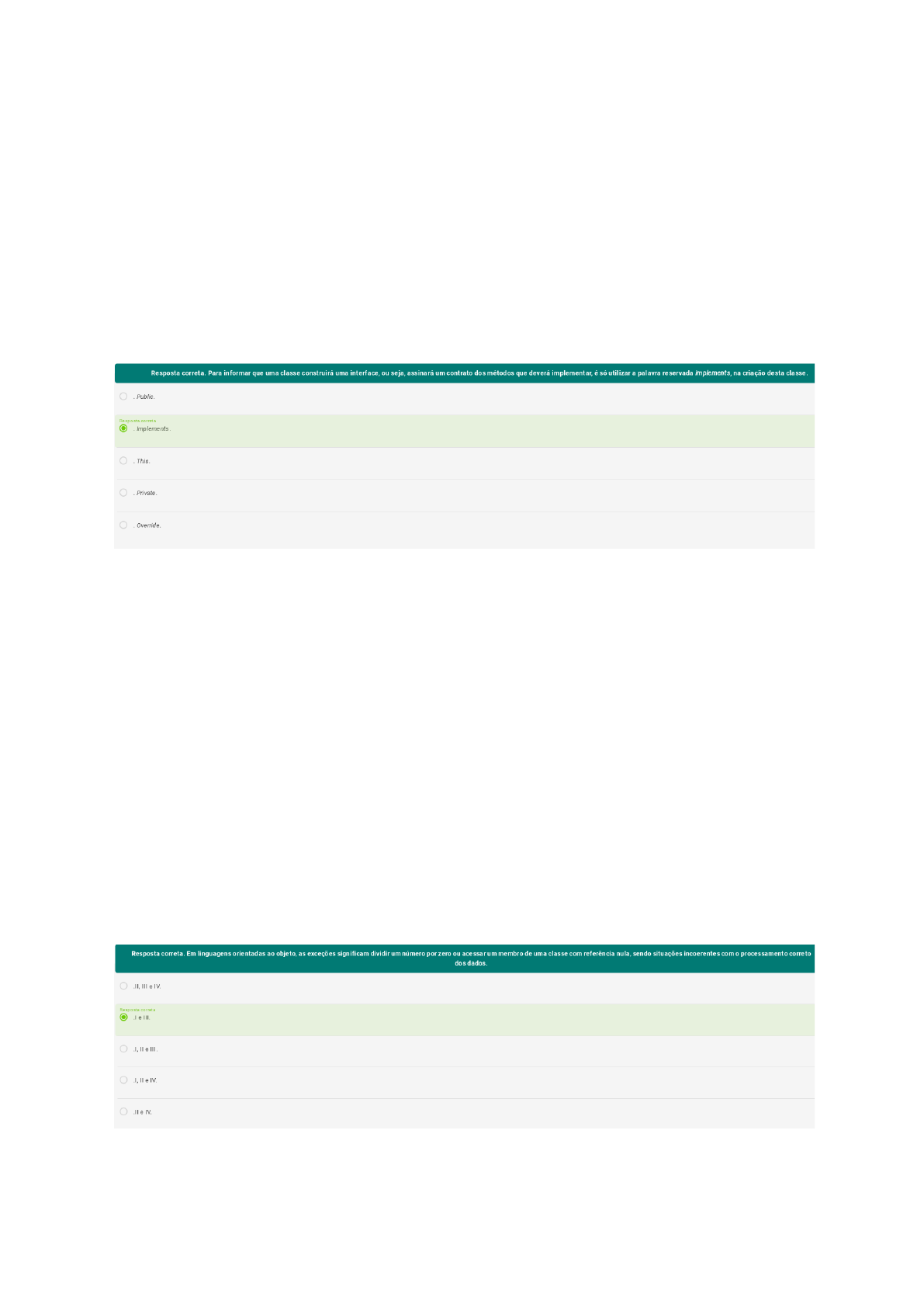 “A interface de um método consiste na assinatura e em um comentário. A assinatura de um método inclui um modificador de acesso, o tipo de retorno, o nome do método e uma lista de parâmetros. A interface fornece tudo que precisamos conhecer para utilizar o método. [...] Como a documentação da classe Sring informa que ela tem um método chamado trim para remover espaços no início e no final as string”. (BARNES, D. J.; KOLLING, M. Programação orientada a objetos em Java. São Paulo: Pearson Prentice Hall, 2004. p. 110). Portanto, podemos compreender que a implementação de uma interface requer normas de código. Para informar que uma classe implementará uma interface, qual a palavra-chave reservada deverá ser utilizada? “Um objeto exceção sempre é uma instância de uma classe em uma hierarquia de herança especial. Podemos criar novos tipo de exceção para criar subclasses nessa hierarquia. Estritamente falando, as classes de exceção sempre são subclasses da classe Throwable que é definida no pacote java.lang. devemos seguir a convenção de definição e utilizar classes de exceção que são subclasses da classe Exception”. (BARNES, D. J.; KOLLING, M. Programação orientada a objetos em Java. São Paulo: Pearson Prentice Hall, 2004. p. 290). Exceções (Exception) são objetos que informam sobre a ocorrência de algum problema em tempo de execução de um programa. Entre as opções abaixo, quais seriam as exceções que podem ocorrer? I. Dividir um número por zero. II. Acessar um membro de classe de classe sem atributos. III. Acessar um membro de classe que possui uma referência nula. IV. Subtrair um número negativo de outro número negativo. É correto o que se afirma em: “O primeiro requisito de uma recuperação bem-sucedida após um erro é que os clientes tomem nota de qualquer notificação de erro que eles recebem. Isto pode parecer óbvio, mas é comum para um programador supor que uma chamada de método não falhará e assim não se incomoda em verificar o valor do retorno.”. (BARNES, D. J.; KOLLING, M. Programação orientada a objetos em Java. São Paulo: Pearson Prentice Hall, 2004. p. 302). A linguagem Java prevê como contornar erros de execução. Neste sentido, qual a classe que trata todas as exceções de erro de um programa? “Uma classe abstrata não gera objetos, porque geralmente ela tem, no mínimo, uma operação abstrata nela definida. Se ela na verdade criasse um objeto, uma mensagem invocando a operação abstrata do objeto provocaria um erro de run-time. Em face disso, uma operação abstrata, e a classe na qual ela está definida, podem parecer inúteis. Assim, por que as temos em uma linguagem orientada a objetos? A resposta tem relação com a herança.”. (PAGE-JONES, M. Fundamentos do desenho orientado a objeto com UML. São Paulo: Makron Books, 2001. p. 98). Portanto, podemos compreender a importância de seguir as regras de programação orientada a objeto para que não ocorram erros quando o sistema estiver instalado. Neste sentido, qual o tipo de problema acarreta erro em tempo de execução? “O NetBeans IDE (Integrated Development Environment) suporta vários frameworks de aplicações Web, o que inclui todas as especificações de desenvolvimento de aplicações Web fornecidas como parte da especificação Java EE. Você também pode personalizar o IDE para funcionar com frameworks adicionais de sua escolha..”. (NETBEANS. Desenvolvimento com Frameworks de Aplicações Web. NetBeans IDE Feature, [201-]. Disponível em: https://netbeans.org/features/web//web-app_pt_BR.html. Acesso em: 22 set. 2019). Netbeans é um dos IDE (Integrated Development Environment) mais utilizados para o desenvolvimento de programas utilizando a linguagem Java, sendo o Swing uma biblioteca que pertence ao Java. Quais são os componentes do Swing do Java? I. JFrame. II. JProcedure. III. JPanels. IV. JBasic. É correto o que se afirma em: “A própria linguagem de programação Java fornece uma implementação muita limpa da maioria dos conceitos orientados a objetos importantes e serve bem como uma linguagem de ensino introdutória. Sua popularidade assegura um grupo imenso de recursos de suporte. Em qualquer área de assunto, ter várias fontes de informações disponíveis é muito útil. Para Java, em particular, incontáveis livros tutoriais, exercícios, compiladores, ambientes e questionários já existem.”. (BARNES, D. J.; KOLLING, M. Programação orientada a objetos em Java. São Paulo: Pearson Prentice Hall, 2004. p. 18). Podemos compreender a importância da linguagem Java para o desenvolvimento de códigos robustos e eficientes. Neste sentido, o Java executa um tratamento específico para exceções, entre eles as exceções explícitas. O que caracteriza o tratamento de exceções explícitas? “Uma variável de um tipo objeto contém uma referência (ou ponteiro) a um objeto. Atribuições e passagem de parâmetros têm semântica de referência (isto é, a referência é copiada, não o objeto). Depois de atribuir uma variável a uma outra, as duas variáveis referenciam o mesmo objeto. As duas variáveis são conhecidas como apelidos para o mesmo objeto. As classes são os templates para objetos, definindo os campos e os métodos que cada instância possui.”. (BARNES, D. J.; KOLLING, M. Programação orientada a objetos em Java. São Paulo: Pearson Prentice Hall, 2004. p. 352). Os ponteiros representam uma definição fundamental na orientação a objeto. Muitas vezes (na linguagem Java), ocorre um erro em tempo de execução quando se aponta para um objeto nulo. Existe uma hierarquia no tratamento de erros e exceção. Qual é a forma correta desta hierarquia? “O paradigma da orientação a objetos é um processo conceitual independente da linguagem de programação. O desenvolvimento baseado em objetos é fundamentalmente uma forma de pensar e não uma técnica de programação. Muitos sistemas organizacio