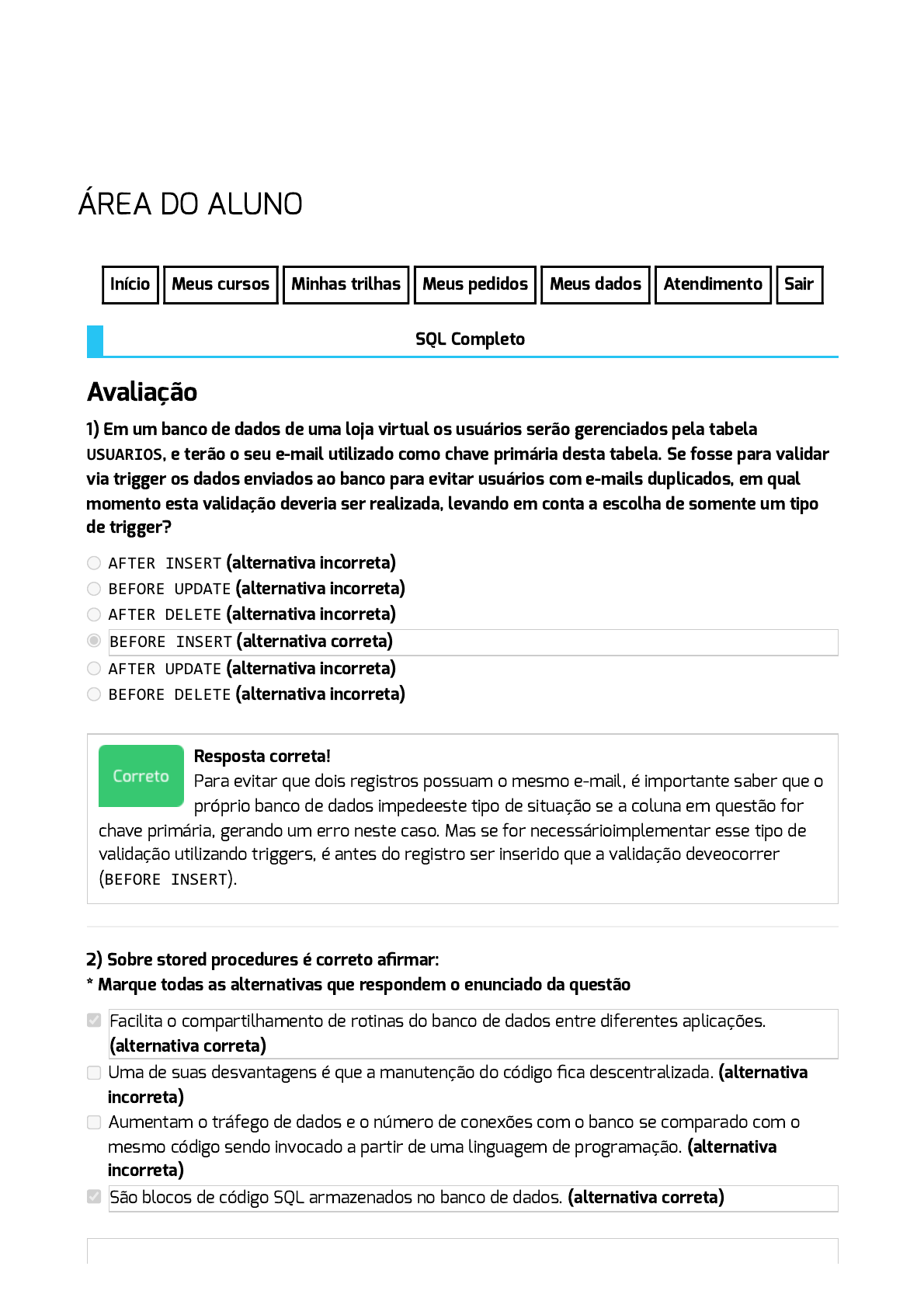 21/06/2022 01:55 Softblue https://www.softblue.com.br/course/submittest 1/3 ÁREA DO ALUNO Início Meus cursos Minhas trilhas Meus pedidos Meus dados Atendimento Sair SQL Completo Avaliação 1) Em um banco de dados de uma loja virtual os usuários serão gerenciados pela tabela USUARIOS, e terão o seu e-mail utilizado como chave primária desta tabela. Se fosse para validar via trigger os dados enviados ao banco para evitar usuários com e-mails duplicados, em qual momento esta validação deveria ser realizada, levando em conta a escolha de somente um tipo de trigger? AFTER INSERT (alternativa incorreta) BEFORE UPDATE (alternativa incorreta) AFTER DELETE (alternativa incorreta) BEFORE INSERT (alternativa correta) AFTER UPDATE (alternativa incorreta) BEFORE DELETE (alternativa incorreta) Resposta correta! Para evitar que dois registros possuam o mesmo e-mail, é importante saber que o próprio banco de dados impedeeste tipo de situação se a coluna em questão for chave primária, gerando um erro neste caso. Mas se for necessárioimplementar esse tipo de validação utilizando triggers, é antes do registro ser inserido que a validação deveocorrer (BEFORE INSERT). 2) Sobre stored procedures é correto afirmar: * Marque todas as alternativas que respondem o enunciado da questão Facilita o compartilhamento de rotinas do banco de dados entre diferentes aplicações. (alternativa correta) Uma de suas desvantagens é que a manutenção do código fica descentralizada. (alternativa incorreta) Aumentam o tráfego de dados e o número de conexões com o banco se comparado com o mesmo código sendo invocado a partir de uma linguagem de programação. (alternativa incorreta) São blocos de código SQL armazenados no banco de dados. (alternativa correta) 21/06/2022 01:55 Softblue https://www.softblue.com.br/course/submittest 2/3 Resposta correta! A manutenção de código é centralizada no caso das Stored Procedures, e não descentralizada. Isso facilita a manutenção e também o compartilhamento destes recursos.O uso de Stored Procedures reduz o tráfego de rede e as conexões com o banco de dados, pois ao invés de diversas conexões e comandos serem enviados ao banco para serem realizados por uma linguagem de programação, apenas a instrução de invocação da Stored Procedure é enviada. 3) Em um banco de dados de uma loja virtual existe uma tabela PRODUTOS. Toda vez que um determinado produto estiver com menos de 5 unidades em estoque, é desejado que seja inserido na tabela COMPRAS_REPOSICAO um registro com a descrição do produto para que o dono da loja possa providenciar o aumento do estoque. Qual o melhor tipo de trigger para criar na tabela PRODUTOS para atender esta situação, levando em conta a escolha de somente um tipo de trigger? AFTER INSERT (alternativa incorreta) BEFORE DELETE (alternativa incorreta) AFTER UPDATE (alternativa correta) AFTER DELETE (alternativa incorreta) BEFORE UPDATE (alternativa incorreta) BEFORE INSERT (alternativa incorreta) Resposta correta! Para que um aviso de produto no final de estoque seja implementado corretamente, é necessário realizar a rotina SQL que faça essa validação execute sempre que a tabela PRODUTOS seja alterada. Assim, sempre que um item sair do estoque, a rotina em questão irá procurar por produtos com menos de 5 itens no estoque, por exemplo. 4) Sobre triggers é correto afirmar: * Marque todas as alternativas que respondem o enunciado da questão Triggers devem ser utilizados apenas em bancos de dados de grande porte. (alternativa incorreta) Um trigger pode executar um código SQL a partir de um registro que foi incluído em determinada tabela. (alternativa correta) É um recurso que permite executar códigos SQL a partir de determinadas situações ou eventos. (alternativa correta) É um mecanismo de disparo de códigos SQL baseado em invocações direta do usuário. (alternativa incorreta) Resposta correta! Triggers devem ser utilizados em bancos de dados de qualquer tamanho que demandem suas funcionalidades. Seus benefícios não estão ligados ao tamanho do banco. Triggers são iniciadas a partir de eventos ocorridos no banco de dados, e não a partir de invocações de usuários. 21/06/2022 01:55 Softblue https://www.softblue.com.br/course/submittest 3/3 Sobre Nós (/site/quemsomos) Blog (Fire in the Code) (/blog) Certificado (/site/certificados) Dúvidas Frequentes (/site/perguntasfrequentes) Formas de Pagamento (/site/formaspagamento) Planos Empresariais (/site/planosempresariais) Contato (/site/contato) (/site/certificados) (/site/garantia) (https://www.facebook.com/softbluecursos) (https://www.instagram.com/softbluecursos) (https://www.youtube.com/softbluecursos) CNPJ 06.860.085/0001-64 Política de Privacidade (/site/politicaprivacidade) © Softblue Retornar para a página do curso (/course/home/id/3) https://www.softblue.com.br/site/quemsomos https://www.softblue.com.br/blog https://www.softblue.com.br/site/certificados https://www.softblue.com.br/site/perguntasfrequentes https://www.softblue.com.br/site/formaspagamento https://www.softblue.com.br/site/planosempresariais https://www.softblue.com.br/site/contato https://www.softblue.com.br/site/certificados https://www.softblue.com.br/site/garantia https://www.facebook.com/softbluecursos https://www.instagram.com/softbluecursos https://www.youtube.com/softbluecursos https://www.softblue.com.br/site/politicaprivacidade https://www.softblue.com.br/course/home/id/3