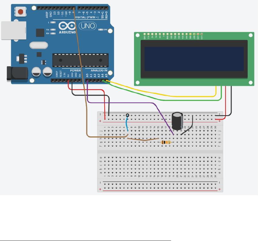 EXPERIMENTO SOBRE CONSTANTE DE TEMPO EM CIRCUITOS RC LISTA DE MATERIAIS • 1 placa Arduino Mega • 1 fonte de alimentação para placa Arduino • 1 protoboard de 400 pontos • 1 display LCD 16X2 • 4 cabinhos de ligação macho-fêmea • 6 cabinhos de ligação macho- macho • 1 resistores de 10 kΩ • 1 capacitor de 1000 µF • 1 • capacitor de 2200 µF • 1 multímetro PROCEDIMENTO EXPERIMENTAL Figura 1: Montagem do circuito utilizando Arduino e LCD (display). Abaixo uma placa protoboard de 400 pontos para conexão entre os componentes eletrônicos e o Arduino. 1ª parte – Medidas da constante de tempo para um circuito RC Com o circuito da Figura 1 montado na protoboard, meça o tempo de carga e descarga do capacitor de 1000 𝜇𝐹, utilizando a programação que se encontra na placa Arduino. No mostrador de LCD você encontrará as informações de tensão sobre o capacitor e o tempo que leva para o carregamento de 63% da carga do capacitor (se estiver carregando o capacitor), ou o tempo que leva para o capacitor descarregar até 37% da sua carga total (se estiver descarregando o capacitor), como mostra a Figura 2. Figura 2: Mostrador de LCD apresentando os valores medidos pelo Arduino. Para carregar ou descarregar o circuito, você deve ligar a extremidade do fio azul indicada com uma circunferência preta no barramento positivo ou negativo superior da protoboard respectivamente. OBS.: Para fazer as medidas de carregamento deixe que a tensão sobre o capacitor, indicada no mostrador, esteja muito próxima de zero, que seja pelo menos 0,010 𝑉. E para fazer as medidas de descarregamento deixe que a tensão sobre o capacitor seja de no mínimo 4,985 𝑉. Repita o procedimento de carga e descarga pelo menos três vezes. Registre os tempos de carga e descarga e tome os seus valores médios e desvios padrões. Caso o desvio padrão do conjunto de medidas seja menor que 0,1 𝑠, assuma este valor como incerteza da medida, equivalente ao menor tempo que pode ser lido no mostrador de LCD. Podemos afirmar que os tempos de carga e descarga são iguais? Apresente o critério que você utilizou para apresentar a sua resposta. A partir da expressão para o tempo de carga e descarga, calcule a capacitância do capacitor. Não esqueça de indicar a sua incerteza. Compare esta medida indireta com o valor nominal indicado do capacitor. Repita novamente os procedimentos de carga e descarga pelo menos mais três vezes, só que para isto substitua o capacitor da medida anterior pelo de 2200 𝜇𝐹. Novamente, tome os valores médios das medidas e seus desvios padrões. Compare os novos tempos de carga e descarga. O que você pode afirmar sobre eles? Compare também os tempos obtidos agora com os tempos das medidas anteriores. Por que eles diferem? Apresente uma justificativa. A partir da expressão para o tempo de carga e descarga, calcule a capacitância do capacitor. Não esqueça de indicar a sua incerteza. Compare esta medida indireta com o valor nominal indicado do capacitor. 2ª parte – Associação de capacitores em paralelo Para a segunda parte da medida, ligue os dois capacitores em paralelo como indicado na Figura 3. Faça três medidas dos tempos de carga e descarga dos capacitores. Tome os seus valores médios e os desvios padrões. Compare este novo resultado com os dois resultados anteriores. O que você pode afirmar sobre a capacitância equivalente de dois capacitores ligados em paralelo a partir do resultado que você obteve para os tempos de carga e descarga? Justifique a sua resposta. Figura 3: Capacitores em paralelo. A partir da expressão para o tempo de carga e descarga, calcule a capacitância equivalente da associação. Não esqueça de indicar a sua incerteza. 3ª parte – Associação de capacitores em série Por fim, ligue os dois capacitores em série como indicado na Figura 4. Faça três medidas dos tempos de carga e descarga dos capacitores. Tome os seus valores médios e os desvios padrões. Figura 4: Capacitores em série. Compare este novo resultado com os dois primeiros resultados. O que você pode afirmar sobre a capacitância equivalente de dois capacitores ligados em série a partir do resultado que você obteve para os tempos de carga e descarga? Justifique a sua resposta. A partir da expressão para o tempo de carga e descarga, calcule a capacitância equivalente da associação. Não esqueça de indicar a sua incerteza.