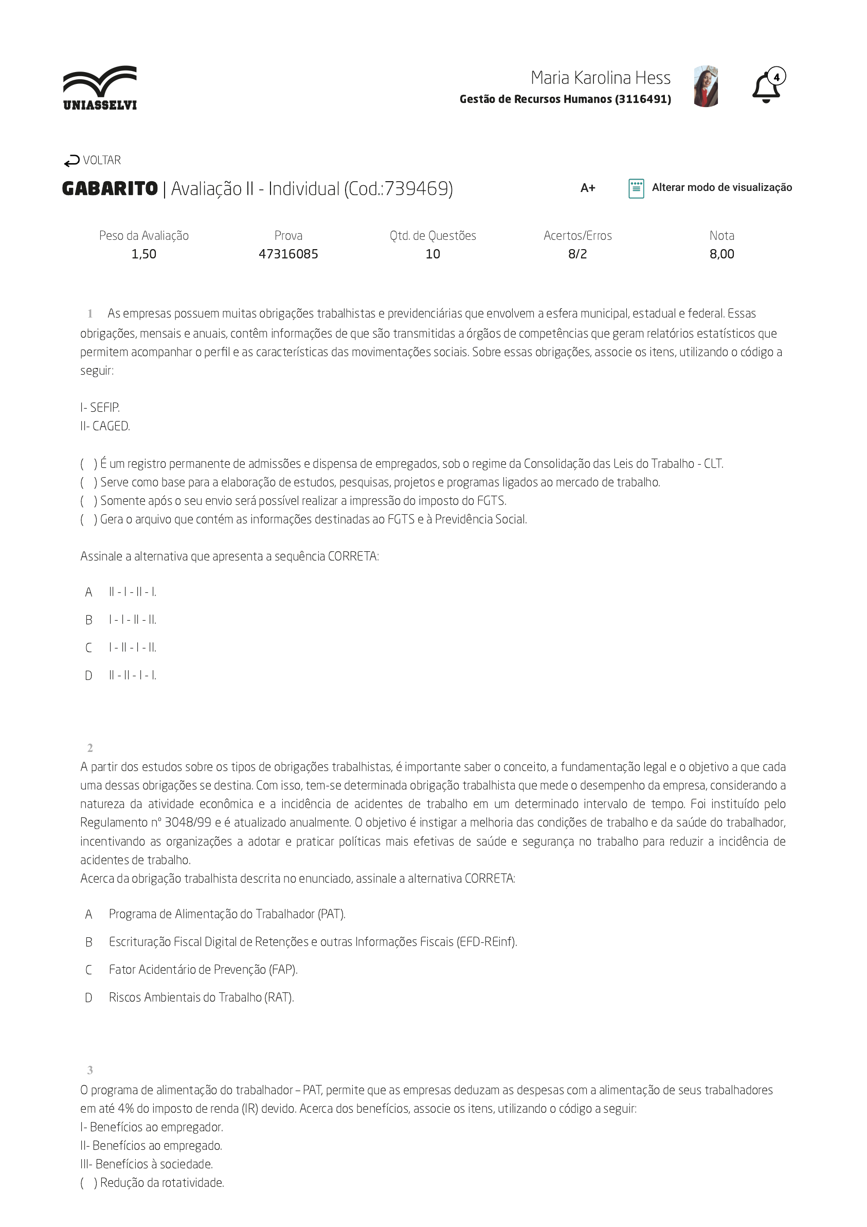 27/06/2022 12:39 AVA https://ava2.uniasselvi.com.br/subject/grades-and-tests/answer-book/eyJ0ZXN0Ijp7InRlc3RDb2RlIjoiNzM5NDY5IiwiZGVzY3JpcHRpb24iOiJBdmFsaWHDp8OjbyBJSSAtIEluZGl2aWR1YWwiLCJwYXJhbWV0ZXIiOjU… 1/4 GABARITO | Avaliação II - Individual (Cod.:739469) Peso da Avaliação 1,50 Prova 47316085 Qtd. de Questões 10 Acertos/Erros 8/2 Nota 8,00 As empresas possuem muitas obrigações trabalhistas e previdenciárias que envolvem a esfera municipal, estadual e federal. Essas obrigações, mensais e anuais, contêm informações de que são transmitidas a órgãos de competências que geram relatórios estatísticos que permitem acompanhar o perfil e as características das movimentações sociais. Sobre essas obrigações, associe os itens, utilizando o código a seguir: I- SEFIP. II- CAGED. ( ) É um registro permanente de admissões e dispensa de empregados, sob o regime da Consolidação das Leis do Trabalho - CLT. ( ) Serve como base para a elaboração de estudos, pesquisas, projetos e programas ligados ao mercado de trabalho. ( ) Somente após o seu envio será possível realizar a impressão do imposto do FGTS. ( ) Gera o arquivo que contém as informações destinadas ao FGTS e à Previdência Social. Assinale a alternativa que apresenta a sequência CORRETA: A II - I - II - I. B I - I - II - II. C I - II - I - II. D II - II - I - I. A partir dos estudos sobre os tipos de obrigações trabalhistas, é importante saber o conceito, a fundamentação legal e o objetivo a que cada uma dessas obrigações se destina. Com isso, tem-se determinada obrigação trabalhista que mede o desempenho da empresa, considerando a natureza da atividade econômica e a incidência de acidentes de trabalho em um determinado intervalo de tempo. Foi instituído pelo Regulamento nº 3048/99 e é atualizado anualmente. O objetivo é instigar a melhoria das condições de trabalho e da saúde do trabalhador, incentivando as organizações a adotar e praticar políticas mais efetivas de saúde e segurança no trabalho para reduzir a incidência de acidentes de trabalho. Acerca da obrigação trabalhista descrita no enunciado, assinale a alternativa CORRETA: A Programa de Alimentação do Trabalhador (PAT). B Escrituração Fiscal Digital de Retenções e outras Informações Fiscais (EFD-REinf). C Fator Acidentário de Prevenção (FAP). D Riscos Ambientais do Trabalho (RAT). O programa de alimentação do trabalhador – PAT, permite que as empresas deduzam as despesas com a alimentação de seus trabalhadores em até 4% do imposto de renda (IR) devido. Acerca dos benefícios, associe os itens, utilizando o código a seguir: I- Benefícios ao empregador. II- Benefícios ao empregado. III- Benefícios à sociedade. ( ) Redução da rotatividade. VOLTAR A+ Alterar modo de visualização 1 2 3 Maria Karolina Hess Gestão de Recursos Humanos (3116491) 4 27/06/2022 12:39 AVA https://ava2.uniasselvi.com.br/subject/grades-and-tests/answer-book/eyJ0ZXN0Ijp7InRlc3RDb2RlIjoiNzM5NDY5IiwiZGVzY3JpcHRpb24iOiJBdmFsaWHDp8OjbyBJSSAtIEluZGl2aWR1YWwiLCJwYXJhbWV0ZXIiOjU… 2/4 ( ) Redução de riscos de acidentes de trabalho. ( ) Redução de despesas e investimentos na área da saúde. ( ) Melhoria de suas condições nutricionais e qualidade de vida.Assinale a alternativa que apresenta a sequência CORRETA: A I - II - III - II. B I - II - III - III. C II - III - III - I. D III - I - II - II. Existe uma obrigação tributária para as empresas que registrarem maior número de acidentes ou doenças ocupacionais, elas pagam mais, já aquelas que registram acidentalidade menor, terão uma redução no valor de contribuição. No caso de nenhum evento de acidente de trabalho, a empresa é bonificada com a redução de 50% da alíquota. A que se refere essa descrição? FONTE: . Acesso em: 9 out. 2018. A PAT. B FAP. C CAT. D RAT. O Cadastro Geral de Empregados e Desempregados (CAGED) foi criado como registro permanente de admissões e dispensa de empregados, sob o regime da Consolidação das Leis do Trabalho (CLT). É utilizado pelo Programa de Seguro-Desemprego, para conferir os dados referentes aos vínculos trabalhistas, além de outros programas sociais. Sobre o CAGED, analise as sentenças a seguir: I- As informações adquiridas por meio da CAGED servem de base para projetos e programas voltados para o mercado de trabalho. II- Somente após o envio do CAGED, a empresa conseguirá gerar a guia para o recolhimento do imposto do FGTS. III- O prazo para o envio do CAGED é até o dia 15 do mês seguinte do qual houve alguma movimentação de funcionários na empresa. IV- Diante da reforma trabalhista de 2017, a única mudança no preenchimento do CAGED refere-se a tipos de admissões. Assinale a alternativa CORRETA: FONTE: . Acesso em: 8 out. 2018. A As sentenças I, III e IV estão corretas. B Somente a sentença I está correta. C As sentenças I, II e III estão corretas. D As sentenças II, III e IV estão corretas. Para as formas de tributação na área trabalhista é fundamental que o profissional conheça os impostos incidentes sobre a folha de pagamento, como também deve compartilhar e absorver com os demais departamentos da empresa informações sobre a atividade e o regime de tributação para a composição das alíquotas de impostos do INSS. Acerca do Regulamento de Imposto de Renda – RIR , em seu Decreto nº 3.000/99a e quanto aos regimes que podem tributar as pessoas jurídicas, assinale a alternativa CORRETA: A O Lucro Real e o Lucro Arbitrado. Além disso, adota-se mais um regime de tributação previsto na Lei Complementar nº 123/2006: Simples Nacional. B O Lucro Arbitrado. Além disso, adota-se mais um regime de tributação previsto na Lei Complementar nº 123/2006: Simples Nacional. C O Lucro Real; Lucro Presumido; Lucro Arbitrado. Além disso, adota-se mais um regime de tributação previsto na Lei Complementar nº 123/2006: Simples Nacional. 4 5 6 Maria Karolina Hess Gestão de Recursos Humanos 