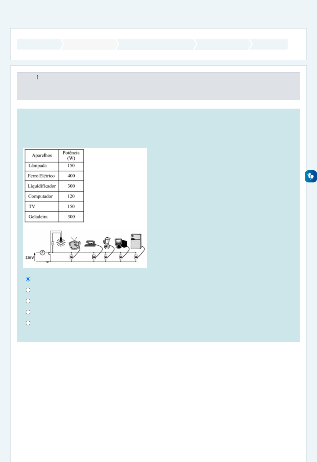 Página inicial Minhas disciplinas 2022/2 - Eletricidade Básica Avaliação Regular Avaliação Questão 1 Resposta salva Vale 0,60 ponto(s). A figura abaixo representa parte de um circuito elétrico de uma residência, com alguns componentes eletrodomésticos identificados com suas respectivas potências (tabela abaixo). A instalação elétrica desta residência está ligada a uma rede monofásica de 220 V e protegida por um disjuntor ou Fusível F. Considerando que todos os equipamentos estejam ligados ao mesmo tempo, o consumo de energia elétrica da residência, em kWh, durante 120 minutos, é: a. 2,84 b. 3,52 c. 6,32 d. 5,34 e. 4,56 Limpar minha escolha https://ambienteonline.uninga.br/ https://ambienteonline.uninga.br/course/view.php?id=11909 https://ambienteonline.uninga.br/course/view.php?id=11909§ion=10 https://ambienteonline.uninga.br/mod/quiz/view.php?id=298642 Questão 2 Resposta salva Vale 0,60 ponto(s). Questão 3 Resposta salva Vale 0,60 ponto(s). A resistência total e corrente total do circuito abaixo é, respectivamente: Dados: R1= 12 Ω, R2= 6 Ω, R3= 4 Ω, R4= 2 Ω, V1= 75 V. a. 24 Ω e 3 A b. 25 Ω e 10 A c. 15 Ω e 5 A d. Nenhuma das alternativas e. 12 Ω e 6 A Limpar minha escolha Sobre a corrente elétrica, é correto afirmar: I. Conceitua-se como o fluxo ordenado de cargas por unidade de tempo. II. Pode variar com relação ao tempo, denominando-se corrente contínua. III. Possui sentido real e convencional. Sendo que o sentido real segue o fluxo dos elétrons, indo do polo negativo para o polo positivo de uma bateria e, o no sentido convencional adota-se o fluxo do polo positivo para o polo negativo de uma bateria. IV. Possui sentido real e convencional. Sendo que o sentido real segue o fluxo dos elétrons, indo do polo positivo para o polo negativo de uma bateria e, o no sentido convencional adota-se o fluxo do polo negativo para o polo positivo de uma bateria. Assinale a alternativa correta: a. Apenas I b. Apenas III c. I, II e III d. I e IV e. I e III Limpar minha escolha Questão 4 Resposta salva Vale 0,60 ponto(s). Questão 5 Resposta salva Vale 0,60 ponto(s). A corrente i do circuito a seguir, vale: a. 12 A b. 40 A c. 6 A d. 24 A e. 32 A Limpar minha escolha Analise as alternativas sobre o circuito mostrado abaixo, verifique quais são verdadeiras e marque a opção correta: I – A resistência equivalente do circuito é de 6kΩ. II – A tensão no bloco B (resistor de 12 kΩ) é 46,3V. III – A tensão no bloco B (resistor de 12 kΩ) e no bloco C (resistor de 6 kΩ) é a mesma. IV – A corrente no bloco B (resistor de 12 kΩ) e no bloco C (resistor de 6 kΩ) são numericamente iguais. V – É possível determinar e usando o método do divisor de corrente. São corretas: a. I, III e V b. Apenas I c. I e V d. II e IV e. II, III e IV Limpar minha escolha IB IC IB IC Questão 6 Resposta salva Vale 0,60 ponto(s). Questão 7 Resposta salva Vale 0,60 ponto(s). Sobre circuitos em série, analise as afirmações abaixo, verifique quais são verdadeiras e marque a opção correta: I - Dois elementos estão em série se possuem dois terminais em comum. II - Dois elementos conectados em série podem ter seu ponto comum conectado a um terceiro elemento percorrido por corrente que, mesmo assim, continuarão a estar conectados em série. III - A corrente que flui em dois componentes conectados em série de um circuito série é a mesma. IV - A resistência equivalente de uma associação de resistores em série é a soma algébrica simples dos valores nominais desses resistores. V- A resistência total dos resistores em série sofre variação caso a ordem de conexão das resistências sejam modificadas. São corretas: a. II e IV b. III e V c. Apenas II d. I e III e. III e IV Limpar minha escolha Assinale a alternativa que define a Lei dos Nós, também chamada de primeira lei de Kirchhoff. a. A lei dos Nós indica que a soma das correntes que chegam em um nó é igual a soma das correntes que saem do nó adjacente ao nó em análise. b. A lei dos Nós indica que a soma das correntes que saem de um nó é igual a 0. c. A lei dos Nós indica que a soma das correntes que chegam em um nó é igual a soma das correntes que saem desse mesmo nó. d. A lei dos Nós indica que a soma das tensões que chegam em um nó é igual a soma das tensões que saem desse mesmo nó. e. A lei dos Nós indica que a soma das correntes que chegam em um nó é igual a 0. Limpar minha escolha Questão 8 Resposta salva Vale 0,60 ponto(s). Questão 9 Resposta salva Vale 0,60 ponto(s). Sobre conexão entre fontes de corrente, analise as afirmações abaixo, verifique quais são verdadeiras e marque a opção correta: I. Ao conectar duas fontes de tensão em paralelo com valores iguais e corrente para cada fonte, a corrente resultante desta associação será 2l. II. Segundo aplicação da Lei de Kirchhoff das correntes, não é possível conectar fontes de corrente em paralelo. III. Não é possível conectar fontes de tensão em série. IV. Fontes de corrente com intensidades diferentes não podem ser associadas em série, pois contrariam a Lei de Kirchoff para as correntes V. Fontes de tensão nunca podem ser conectadas em paralelo. São corretas: a. I e IV. b. Apenas IV. c. Apenas II. d. IV e V. e. III e IV. Limpar minha escolha A corrente através do resistor de 9 Ω, vale: a. 68,9 mA b. 30 mA c. 52 mA d. 75 mA e. 60 mA Limpar minha escolha Questão 10 Resposta salva Vale 0,60 ponto(s). Calcule a corrente que passa no resistor R3, para o circuito a seguir: a. 0,20 A b. -0,20 A c. 4 A d. -4,20 A e. -3,8 A Limpar minha escolha Atividade anterior ← Avalie a sua disciplina Seguir para... Próxima atividade Prova de Exame → Manter contato UNINGÁ https://www.uninga.br Mobile : 0800 800 5009 Obter o aplicativo para dispositivos móveis Mudar para o tema padrão https://ambienteonline.uninga.br/mod/feedback/view.php?id=298641&forceview=1 https://ambienteonline.uninga.br/mod/quiz/view.php?i