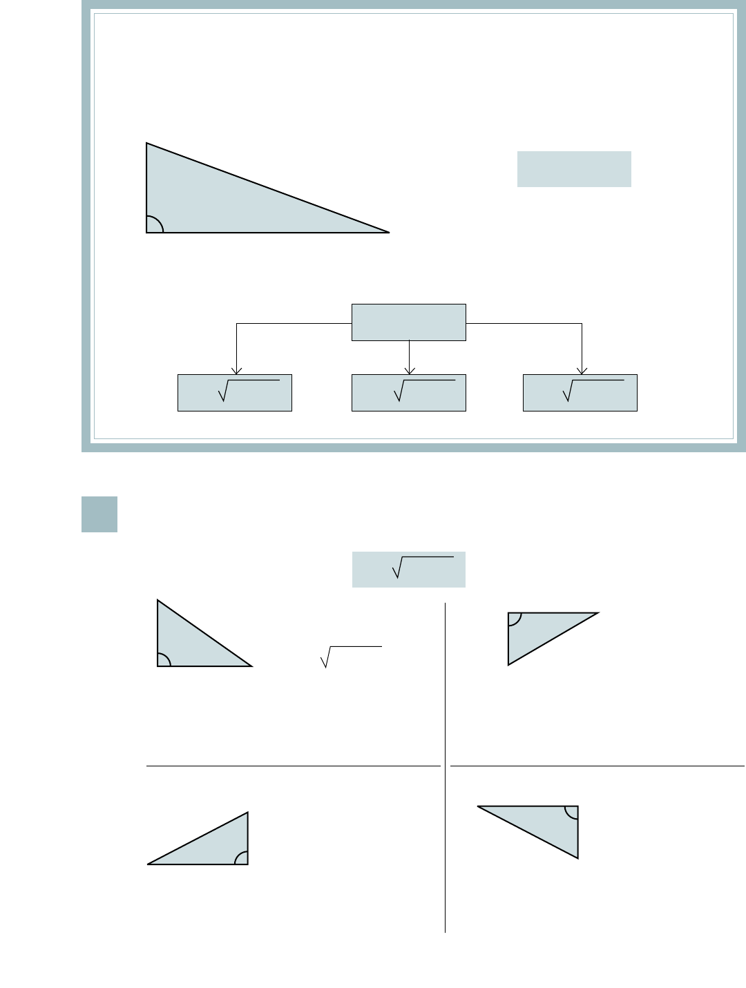 Teorema de Pitágoras 1 TEOREMA DE PITÁGORAS En un triángulo rectángulo, el cuadrado de la hipotenusa es igual a la suma de los cuadrados de los catetos. De esta fórmula se obtienen las siguientes: a = 5 cm 4 cm 3 cm a a = a = a = a2 = b2 + c2 a2 = b2 + c2 b = a2 - c2 c = a2 - b2a = b2 + c2 Calcula la hipotenusa de los siguientes triángulos rectángulos. www.indexnet.santillana.es © Santillana Pág. 1 C cA a B b a = b2 + c2 a = 32 + 42 12 cm 9 cm a 15 m 8 ma 24 dm 20 d m a 2 8 cm 30 dm 34 dm 10 cm b b b Calcula el cateto que falta en cada triángulo rectángulo. 3 Calcula en cada triángulo rectángulo el lado que falta. www.indexnet.santillana.es © Santillana Pág. 2 b = a2 - c2 b = 102 - 82 c = a2 - b2 c = 132 - 52 b = c = b = c = 16 m 12 m a 18 dm 30 dm 27 m 45 m 5 cm 13 cm c c c b =a = c = 28 cm 35 cm b 52 m 48 m c 39 dm 15 dm PROBLEMAS DE APLICACIÓN DEL TEOREMA DE PITÁGORAS 1 Calcula la altura de un triángulo equilátero de 14 cm de lado. 2 Calcula la diagonal de un cuadrado de 9 cm de lado. 3 Calcula la altura de un rectángulo cuya diagonal mide 6,8 cm y la base 6 cm. 4 Calcula el lado de un rombo cuyas diagonales miden 32 mm y 24 mm. www.indexnet.santillana.es © Santillana Pág. 3 24mm 6 cm 9 cm 14 cm 6,8 cm h h d 32 m m 5 Una escalera de 65 dm de longitud está apoyada sobre la pared. El pie de la escalera dista 25 dm de la pared. a) ¿A qué altura se apoya la parte superior de la escalera en la pared? 6 Calcula los centímetros de cuerda que se necesitan para formar las letras N, Z y X de las siguientes dimensiones. b) ¿A qué distancia de la pared habrá que colocar el pie de esta misma escalera para que la parte superior se apoye en la pared a una altura de 52 dm? www.indexnet.santillana.es © Santillana Pág. 4 h 65 dm 25 dm 52 dm 15 cm 20 cm 65 dm d Se necesitan cm. Se necesitan cm. Se necesitan cm. 10 cm 24 cm 16 cm 30 cm