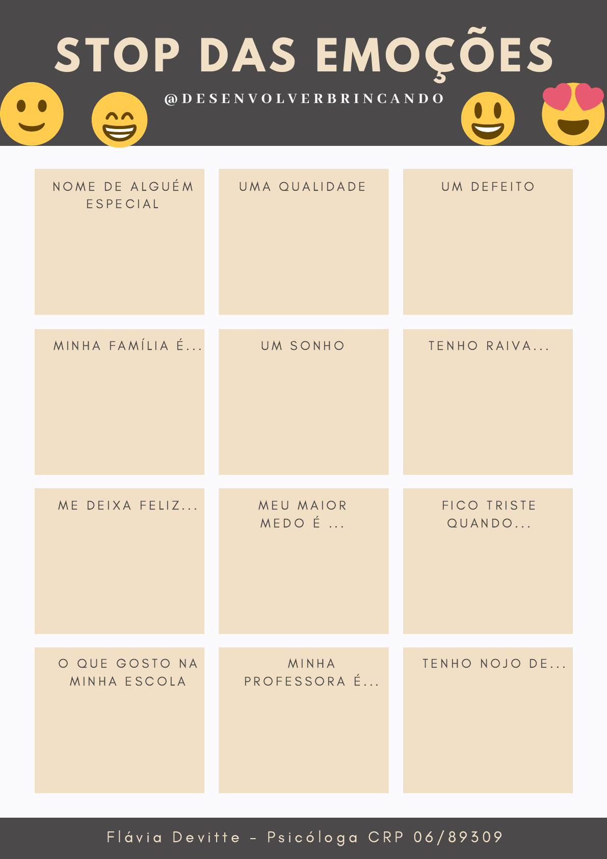 N O M E D E A L G U É M E S P E C I A L U M A Q U A L I D A D E U M D E F E I T O M I N H A F A M Í L I A É . . . U M S O N H O T E N H O R A I V A . . . M E D E I X A F E L I Z . . . M E U M A I O R M E D O É . . . F I C O T R I S T E Q U A N D O . . . O Q U E G O S T O N A M I N H A E S C O L A M I N H A P R O F E S S O R A É . . . T E N H O N O J O D E . . . STOP DAS EMOÇÕES @ D E S E N V O L V E R B R I N C A N D O F l á v i a D e v i t t e - P s i c ó l o g a C R P 0 6 / 8 9 3 0 9