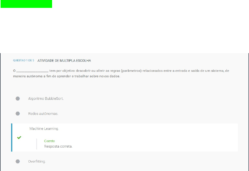 QUESTAO 1 DE 5 ATIVIDADE DE MULTIPLA ESCOLHA O ____________________ tem por objetivo descobrir ou aferir as regras (parâmetros) relacionados entre a entrada e saída de um sistema, de maneira autônoma a fim de aprender e trabalhar sobre novos dados. I Machine Learning. II Redes autônomas. III Algoritmo BubbleSort. IV Overfitting. QUESTAO 2 DE 5 ATIVIDADE DE MULTIPLA ESCOLHA Um dos principais motivos da escolha de técnicas que utilizam este método é a ausência da rotulação dos dados. Apesar de existirem instâncias que necessitam ser analisadas a variável alvo não é conhecida. Analisando as características e padrões semelhantes, os algoritmos __________ deduzem a organização dos dados, que posteriormente deve ser confirmada por um especialista no problema proposto. Esta motivação se relaciona com qual algoritmo? I Aprendizado por Reforço. II Aprendizado por análise. III Aprendizado Não Supervisionado. IV Aprendizado Supervisionado. QUESTAO 3 DE 5 ATIVIDADE DE MULTIPLA ESCOLHA Quanto aos treinamentos de modelos supervisionados podemos indicar: Este efeito ocorre quando o modelo acerta a classificação durante a fase de treinamento, mas não possui uma boa acurácia quando novas instâncias são apresentadas. Esta afirmação corresponde a qual alternativa? I Overfitting. II Viés. III Underfitting. IV Nota de corte. QUESTAO 4 DE 5 ATIVIDADE DE MULTIPLA ESCOLHA O processo de _________________ é um processo de controle estocástico, em tempo discreto, onde sua estrutura modela matematicamente a tomada de decisão onde os casos apresentem resultados parcialmente aleatórios. Complete a frase: I Clustering. II Redes neurais Artificias. III Q-Learning. IV Decisão de Markov. QUESTAO 5 DE 5 ATIVIDADE DE MULTIPLA ESCOLHA Requer a interação com um objetivo, ou seja, o algoritmo "enfrenta" um desafio e por meio da tentativa, erro e recompensa ele encontra uma melhor solução, relativamente proporcional a sua quantidade e qualidade de treinamento. Estamos falando de qual tipo de aprendizado? I Aprendizado não supervisionado. II Aprendizado por reforço. III Aprendizado supervisionado. IV Aprendizado por erro. QUESTAO 1 DE 5 ATIVIDADE DE MULTIPLA ESCOLHA O ____________________ tem por objetivo descobrir ou aferir as regras (parâmetros) relacionados entre a entrada e saída de um sistema, de maneira autô noma a fim de aprender e trabalhar sobre novos dados. I Machine Learning. II Redes autônomas. III Algoritmo BubbleSort. IV Overfitting. QUESTAO 1 DE 5 ATIVIDADE DE MULTIPLA ESCOLHA O ____________________ tem por objetivo descobrir ou aferir as regras (parâmetros) relacionados entre a entrada e saída de um sistema, de maneira autônoma a fim de aprender e trabalhar sobre novos dados. I Machine Learning. II Redes autônomas. III Algoritmo BubbleSort. IV Overfitting.
