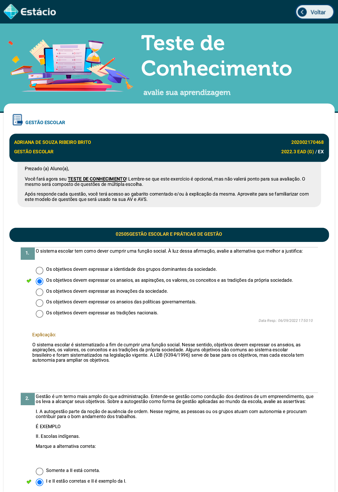 Teste de Conhecimento avalie sua aprendizagem O sistema escolar tem como dever cumprir uma função social. À luz dessa afirmação, avalie a alternativa que melhor a justifica: Gestão é um termo mais amplo do que administração. Entende-se gestão como condução dos destinos de um empreendimento, que os leva a alcançar seus objetivos. Sobre a autogestão como forma de gestão aplicadas ao mundo da escola, avalie as assertivas: I. A autogestão parte da noção de ausência de ordem. Nesse regime, as pessoas ou os grupos atuam com autonomia e procuram contribuir para o bom andamento dos trabalhos. É EXEMPLO II. Escolas indígenas. Marque a alternativa correta: GESTÃO ESCOLAR ADRIANA DE SOUZA RIBEIRO BRITO 202002170468 GESTÃO ESCOLAR 2022.3 EAD (G) / EX Prezado (a) Aluno(a), Você fará agora seu TESTE DE CONHECIMENTO! Lembre-se que este exercício é opcional, mas não valerá ponto para sua avaliação. O mesmo será composto de questões de múltipla escolha. Após responde cada questão, você terá acesso ao gabarito comentado e/ou à explicação da mesma. Aproveite para se familiarizar com este modelo de questões que será usado na sua AV e AVS. 02505GESTÃO ESCOLAR E PRÁTICAS DE GESTÃO 1. Os objetivos devem expressar a identidade dos grupos dominantes da sociedade. Os objetivos devem expressar os anseios, as aspirações, os valores, os conceitos e as tradições da própria sociedade. Os objetivos devem expressar as inovações da sociedade. Os objetivos devem expressar os anseios das políticas governamentais. Os objetivos devem expressar as tradições nacionais. Data Resp.: 06/09/2022 17:50:10 Explicação: O sistema escolar é sistematizado a fim de cumprir uma função social. Nesse sentido, objetivos devem expressar os anseios, as aspirações, os valores, os conceitos e as tradições da própria sociedade. Alguns objetivos são comuns ao sistema escolar brasileiro e foram sistematizados na legislação vigente. A LDB (9394/1996) serve de base para os objetivos, mas cada escola tem autonomia para ampliar os objetivos. 2. Somente a II está correta. I e II estão corretas e II é exemplo da I. javascript:voltar(); javascript:voltar(); (FGV -Diretor de Unidade Escolar, Paulínia, 2016) Leia o fragmento a seguir: O diretor de uma escola da rede municipal de Paulínia considera sua gestão bastante democrática. Sempre convoca representantes da comunidade, professores, alunos e funcionários para participarem de reuniões e debates, procurando ouvir suas opiniões sobre temas de interesse da escola. As decisões, porém, são tomadas de forma isolada, quando ele considera apenas suas próprias impressões sobre o tema. Com base nessa situação hipotética, analise as afirmativas a seguir: I. A lógica da participação não garante, por si só, a gestão democrática na escola. II. A participação de todos os segmentos da escola nos processos de discussão e reflexão caracteriza a gestão da unidade como democrática. III. O processo de gestão democrática não envolve participação nas decisões. Está correto o que se afirma em: (IDECAN/2019- Adaptada) De acordo com o processo de formação, a autonomia, responsabilidade e a capacitação são características tradicionalmente associadas a valores profissionais que deveriam ser indiscutíveis na profissão docente. Neste sentido, avalie as assertivas: I- A profissionalidade docente se refere às qualidades da prática profissional dos professores em função do que requer o trabalho educativo. Dessa forma, a profissionalidade não consiste apenas ensinar, mas engloba todos os valores e pretensões que o docente deseja alcançar na profissão. II- A educação envolve outras esferas, sejam elas de determinações políticas, econômicas ou culturais e isso faz com que os professores não tenham domínio total sobre a prática, uma vez que tais setores interferem na vida escolar. III- A profissão de professor, como as demais, emerge num dado momento e contexto histórico como resposta às necessidades que foram postas pelas sociedades, adquirindo estatuto próprio e legalidade. IV- No caso da educação escolar, constata-se que no mundo contemporâneo o crescimento quantitativo dos sistemas de ensino tem correspondido há um resultado formativo (qualitativo) adequado às exigências da população envolvida, e às exigências das demandas sociais, passando a exigir uma nova identidade profissional do professor. Marque a alternativa correta: I e II estão corretas, mas II não é exemplo da I. I e II não estão corretas. Somente a I está correta. Data Resp.: 06/09/2022 17:53:11 Explicação: A autogestão parte da ideia de anarquia, como ausência de ordem. No regime de autogestão, as pessoas atuam com autonomia e procuram contribuir para o bom andamento dos trabalhos, sua agência dá-se pela convicção. Um exemplo desta forma de administração são as escolas indígenas, como projeto fomentado pela implementação de modelos e senso de valor. 3. I, apenas I, II e III III, apenas I e II, apenas I e III, apenas Data Resp.: 06/09/2022 17:54:17 Explicação: A Lei de Diretrizes e Bases da Educação Nacional (9394/1996) trata da gestão democrática escolar nos seguistes termos, ipsis litteris: I- participação dos profissionais da educação na elaboração do projeto pedagógico da escola; II- participação das comunidades escolar e local em conselhos escolares ou equivalentes. Uma gestão educacional democrática, portanto, é um compromisso da comunidade escolar. 02216A ESTRUTURA ORGANIZACIONAL DE UMA ESCOLA. 4. Somente I está correta Somente I e IV estão corretas Somente II e III estão corretas (Prefeitura de São Bernardino/SC ¿ 2021) De acordo com a LDB ¿ Lei de Diretrizes e Bases, em seu Art. 13. Os docentes incumbir-se-ão de: I - participar da elaboração da proposta pedagógica do estabelecimento de ensino; II - elaborar e cumprir plano de trabalho, segundo a proposta pedagógica do estab