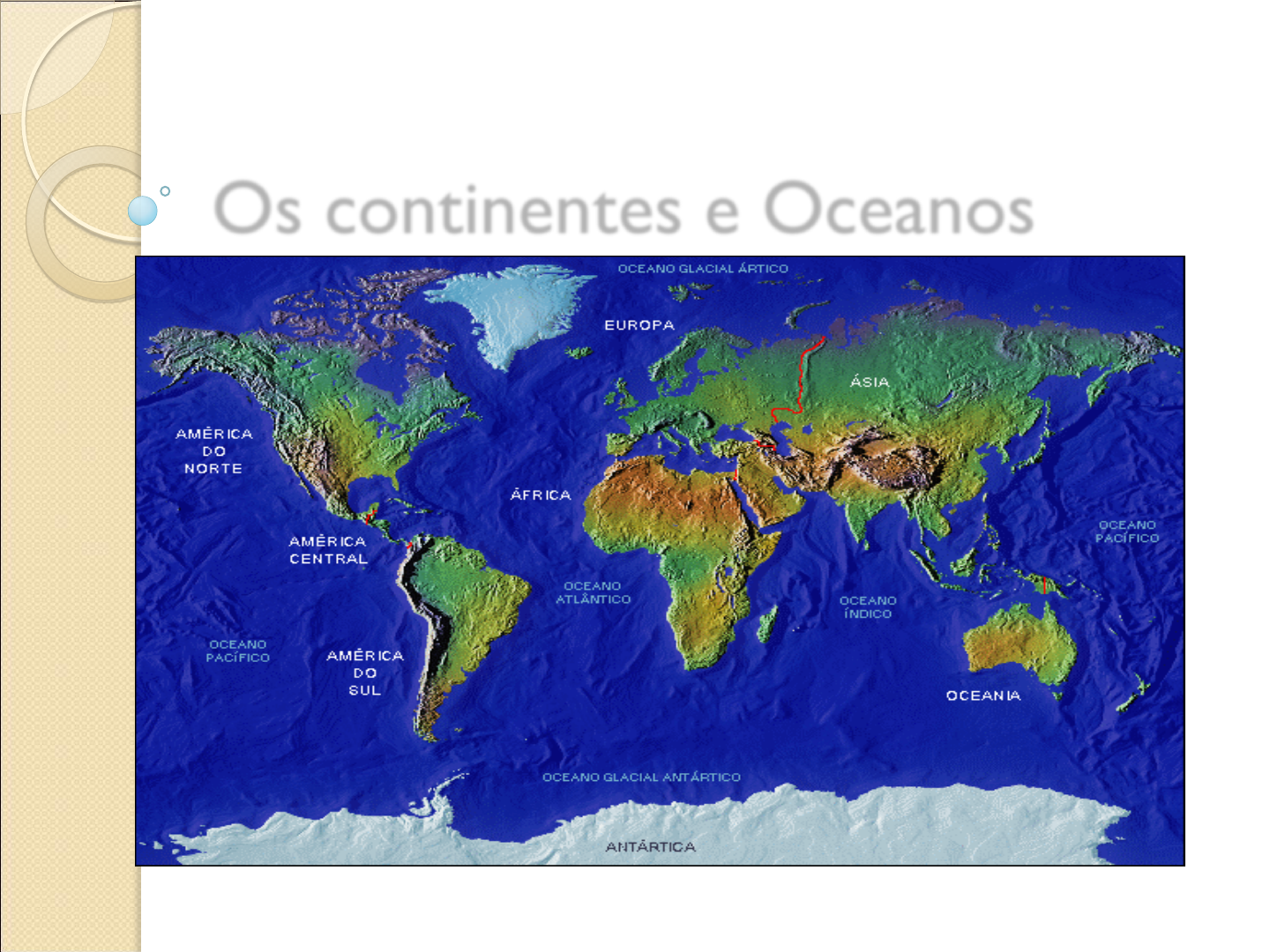 Os continentes e Oceanos Os oceanos •O oceano é uma grande massa de água salgada que cobre a maior parte da superfície terrestre. •Essa grande massa de água é dividida em cinco oceanos. O Oceano Pacífico Localizado entre a Ásia, a América e a Oceania, é o mais extenso e profundo dos oceanos. Fossa das Marianas no Pacífico Sua maior profundidade é de 11.500 metros. Oceano Atlântico Localiza-se entre a América, Europa e África. Importância do Atlântico É o oceano mais importante economicamente, devido ao grande fluxo de navegação e comunicação entre Europa e Américas. Navio cargueiro Navio cruzeiro Oceano Índico Localizado no Hemisfério Sul, fica situado entre a Ásia, a África e a Oceania. Ilhas Seychelles Oceano Glacial Ártico Banha o Norte da Europa, Ásia e da América. Águas com baixas temperaturas e presença de icebergs. Ártico Oceano Glacial Antártico Formado pelo encontro das águas do Pacífico, Atlântico e Índico. Apresenta águas congeladas durante grande parte do ano. Antártida Os continentes O planeta possui seis continentes: África, América, Antártica, Ásia, Europa e Oceania. Essas grandes porções de terras emersas, limitadas por oceanos, mares e montanhas, possuem extensão territorial de 149.440.850 quilômetros quadrados, correspondendo a aproximadamente 29% da superfície terrestre. Ásia Esse é o maior e mais populoso continente terrestre. Sua área é de 44,9 milhões de quilômetros quadrados, correspondendo a 30% das áreas emersas do globo. O contingente populacional asiático é de 4,1 bilhões de habitantes (60% da população mundial). O continente está dividido em 45 países, sendo a China o maior e mais habitado (1,3 bilhão de habitantes). América O continente americano possui uma área superior a 42 milhões de quilômetros quadrados; Está dividida em América do Norte (23,4 milhões de km²), América Central (735,6 mil km²) e América do Sul (17,8 milhões de km²). A América é formada por 35 países, e sua população é de 934,3 milhões de habitantes. África Com extensão territorial de 30.198.835 quilômetros quadrados, o continente africano abriga aproximadamente 1,1 bilhão de habitantes, distribuídos em 53 países, sendo a Nigéria o mais populoso. Os países desse continente apresentam vários problemas socioeconômicos; Por outro lado, a África apresenta a maior diversidade cultural, além de abrigar belas paisagens naturais. Antártida Aproximadamente 90% das geleiras estão localizadas nesse continente. Sua extensão territorial é de 13,2 milhões de quilômetros quadrados, porém, no inverno, com o congelamento da água; A Antártica pode atingir até 26 milhões de km². Ele é habitado por pesquisadores de 27 nações. Europa Possui 49 países distribuídos em uma área de 10,3 milhões de quilômetros quadrados. Com 749,6 milhões de habitantes, a Europa apresenta o menor crescimento populacional: 0,1% ao ano. Esse continente detém os melhores indicadores socioeconômicos do planeta. Oceania Menor porção continental, possui extensão territorial de 8,5 milhões de quilômetros quadrados, onde residem 37,1 milhões de habitantes, distribuídos em 14 nações. Com exceção da Austrália e Nova Zelândia, os países desse continente apresentam diversos problemas econômicos.