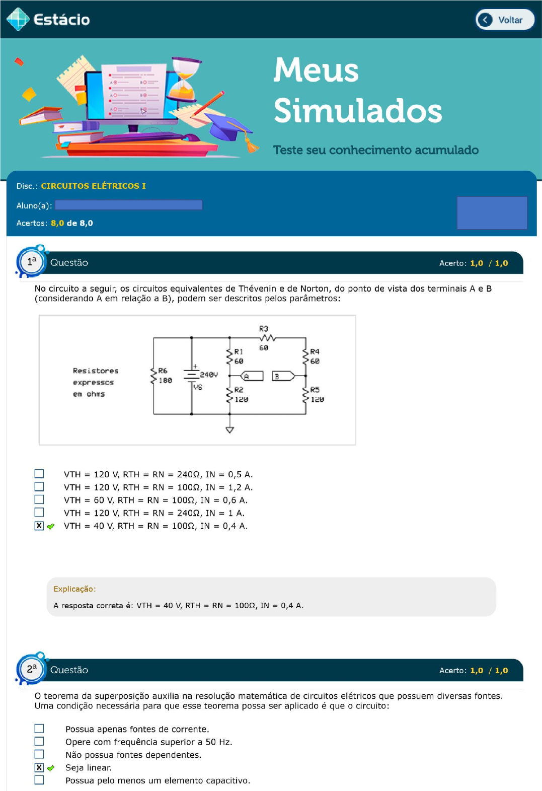 1/4 2/4 (FCC, 2010) Três capacitores estão associados em série, sendo C1 = 60 µF, C2 = 100 µF e C3 = ? A capacitância equivalente vale Ceq = 100/3 µF. Nesse caso, C3 vale: 300 µF 200 µF 180 µF 80 µF 360 µF Respondido em 31/10/2022 18:23:00 (Unifenas, 2014) Três capacitores idênticos estão associados em série. Suas capacitâncias são iguais a 6.10- 6 F. A associação está submetida a uma tensão de 100 V. Qual é a carga equivalente do conjunto? 3.10-5 Coulombs 4.10-5 Coulombs 6.10-6 Coulombs 5.10-5 Coulombs 2.10-4 Coulombs Respondido em 31/10/2022 18:25:13 Considere um circuito RC, onde: R=5Ω C=2F O capacitor deste circuito está sendo carregado. Qual o tempo necessário para que o circuito atinja 63,2% do carregamento? 10s 5s 15s 2s 2,5s Explicação: A resposta correta é: Seja linear. Acerto: 1 , 0 / 1 , 0 Explicação: A resposta certa é: 300 µF Acerto: 1 , 0 / 1 , 0 Explicação: A resposta certa é: 2.10 -4 Coulombs Acerto: 1 , 0 / 1 , 0 3/4 Considere um circuito RC, cujos valores para os componentes são: R=5Ω C=0,1F Qual o valor da constante de tempo desse circuito? 1. 50. 0,05. 5. 0,02. Respondido em 31/10/2022 18:26:28 (CESGRANRIO - 2014) Considere que o circuito da Figura abaixo está inicialmente operando em regime permanente com a chave S1 aberta e o capacitor C completamente descarregado. Figura Q8 complementar ao exercício - Fonte: CESGRANRIO, 2014. Dessa forma, qual deve ser o valor da resistência elétrica de R2, em ohms, para que a corrente iC no capacitor seja de 5,0 mA, imediatamente após o fechamento da chave ideal S1? 1.000 600 6.000 400 10.000 Respondido em 31/10/2022 18:27:45 Explicação: A resposta certa é: 10s Acerto: 1 , 0 / 1 , 0 Explicação: A resposta certa é: 0,05. Acerto: 1 , 0 / 1 , 0 Explicação: A resposta certa é: 400 4/4 (FGV - 2014) O circuito a seguir é composto por um resistor, um indutor e um capacitor em paralelo. Sabe- se que o resistor é de 10Ω, o indutor de 100 mH e o capacitor de 100 µF. Figura Q14 complementar ao exercício - Fonte: FGV, 2014. A respeito desse circuito, pode-se dizer que se trata de um circuito: Criticamente amortecido. Estável. Subamortecido. Sem perdas. Superamortecido. Respondido em 31/10/2022 18:29:06 Acerto: 1 , 0 / 1 , 0 Explicação: A resposta certa é: Superamortecido.