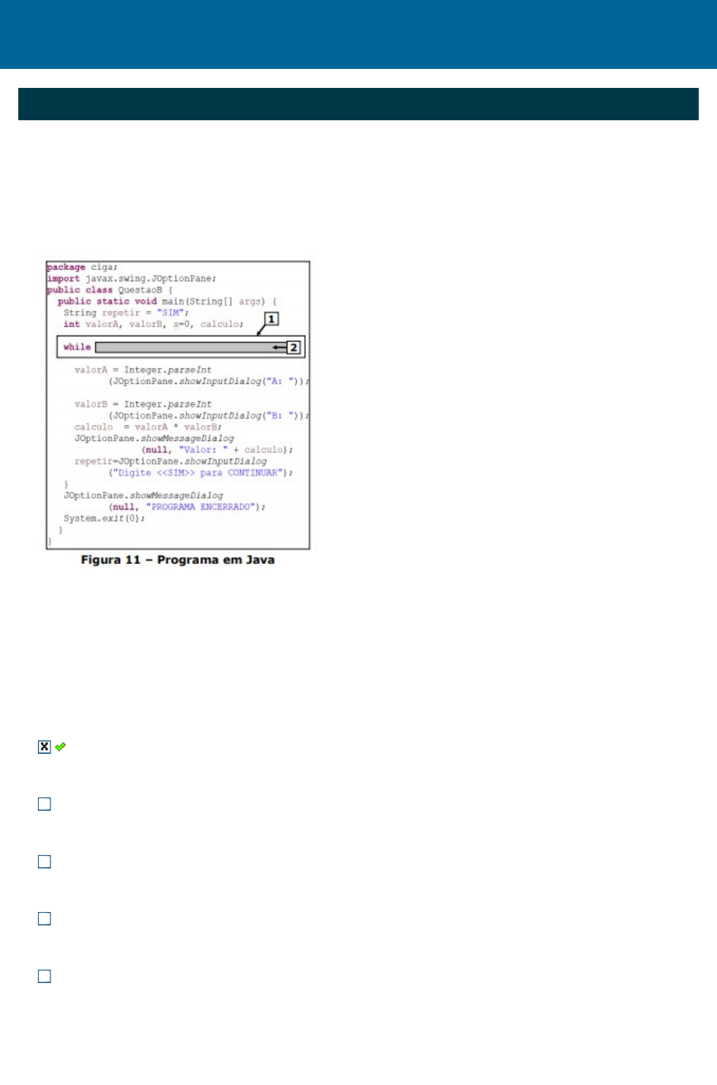A Figura 11 mostra um programa em Java que permite realizar, repetidamente, determinada multiplicação e apresentar o seu resultado, enquanto o conteúdo da variável "repetir" for "SIM". Para que esse programa funcione adequadamente e possa ser encerrado corretamente, basta que no local apontado pela seta nº 1 exista, apenas, o seguinte código fonte: I. while (repetir == "SIM") { II. while (repetir.equalsIgnoreCase("SIM")) { III. while (repetir.equals("SIM")) {