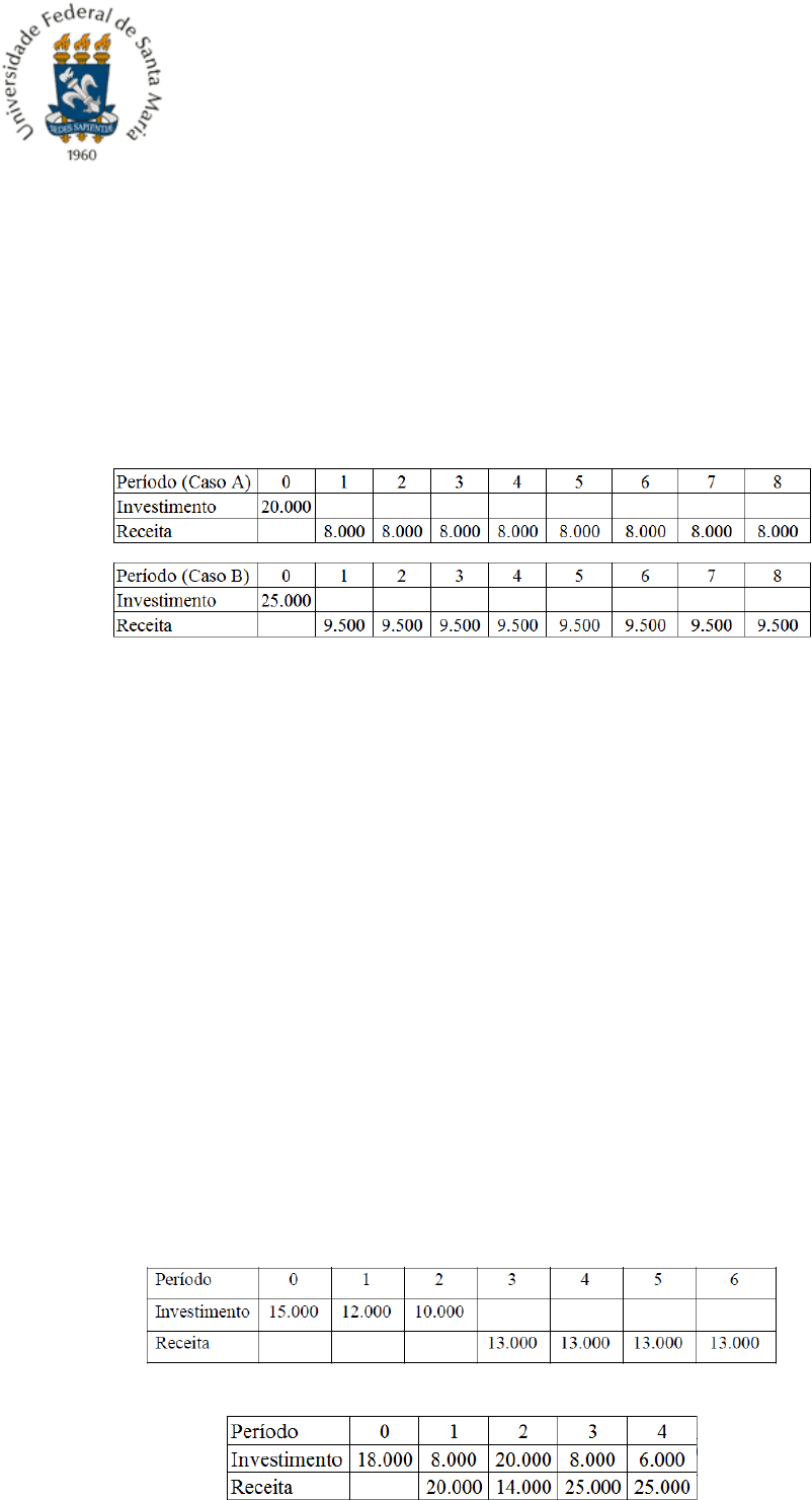 UNIVERSIDADE FEDERAL DE SANTA MARIA CENTRO DE TECNOLOGIA DEPARTAMENTO DE ENGENHARIA DE PRODUÇÃO E SISTEMAS LISTA 8: MÉTODOS DETERMINISTICOS DE ANÁLISE DE INVESTIMENTOS: 1) A projeção do fluxo de caixa de um projeto com investimento inicial de R$ 35.000,00 indica a obtenção de lucros de R$ 1.250,00 durante 24 meses, com três entradas de caixa extras no nono mês, décimo quinto mês e vigésimo mês de R$ 3.000,00. Determine se o projeto é viável através da TIR e do IBC. (TMA: 0,8% ao mês). R.: TIR = 0,85% a.m.; IBC = 1,006. 2) Considere os projetos abaixo, para uma TMA igual a 30% a.p. a) Determine a TIR individual de cada caso, verificando se os projetos são viáveis ou não. R.: TIRA = 37,14% a.p.; TIRB = 34,93% a.p. b) Identifique através da TIR qual dos projetos é mais viável. (análise incremental) R.: TIRincr = 25,06% a.p. c) No caso da TMA considerada ser de 28% a.p., qual projeto é mais viável? E para uma TMA de 20% a.p.? d) Identifique, pelos métodos VPL e VAUE, qual dos projetos é mais viável. R.: VPLA = $3397,61; VPLB = $2784,67; VAUEA = $1161,70; VAUEB = $ 952,12. e) Determine o IBC individual e o payback descontado de cada projeto. R.: IBCA = 1,17; IBCB = 1,11; PBDA = 6 períodos; PBDB = 6 períodos. f) Identifique através do IBC qual dos projetos é mais viável. (análise incremental) R.: IBCincr = 0,88. 3) Os fluxos de caixa abaixo representam os investimentos e recebimentos possíveis relativos as opções existentes no mercado para a construção e posterior aluguel de uma casa pré-fabricada pequena, em períodos trimestrais, para uma taxa TMA de 8% a.t.. Investimento A: Investimento B: a) Determine o VPL e o VAUE de cada investimento, indicando qual é o mais viável, caso os investimentos não possam ser repetidos e que não haja possibilidade de reinvestimento da casa. R.: VPLA = $2230,49; VPLB = $15427,80; VAUEA = $482,49; VAUEB = $3337,34. b) Determine o VPL e o VAUE de cada investimento, indicando qual é o mais viável, caso os investimentos possam ser repetidos e que haja possibilidade de reinvestimento da casa. R.: VPLA = $3636,09; VPLB = $35102,83; VAUEA = $482,51; VAUEB = $4657,97. c) Qual é a TIR e o IBC para cada investimento, de maneira isolada (sem a análise incremental)? R.: TIRA = 9,89% a.t.; TIRB = $35,69% a.t.; IBCA = 1,06; IBCB = 1,67. d) Qual é o payback descontado de cada investimento? R.: PBDA = 6 trimestres; PBDB = 3 trimestres.