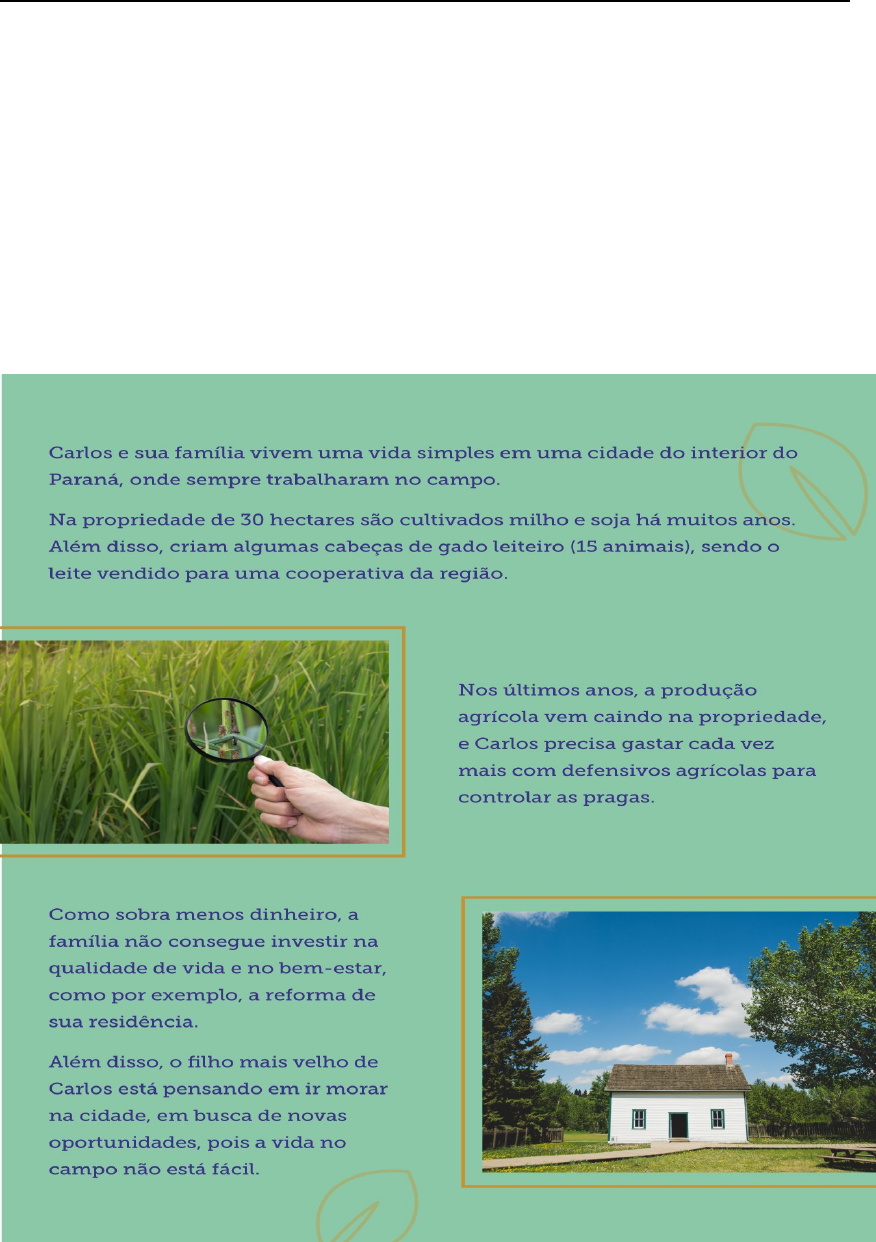 Parte superior do formulário Desafio Os fantásticos aumentos de produtividade na agricultura convencional têm sido acompanhados, na maioria das vezes, pelo uso excessivo de recursos naturais que levam à degradação ambiental (erosão do solo, poluição com pesticidas, salinização, etc.) e pelos problemas sociais, principalmente em relação ao êxodo rural. Logo, incentivar práticas agrícolas mais sustentáveis vem ganhando força nos últimos anos. A agricultura sustentável consiste no manejo e na utilização do ecossistema agrícola, a fim de manter sua diversidade biológica, produtividade, capacidade regenerativa, vitalidade e habilidade de funcionamento para que possa preservar, agora e no futuro, significantes funções ecológicas, econômicas e sociais nas esferas local, nacional e global, não causando danos em outros ecossistemas. Você, após prestar um concurso público, é o mais novo extensionista rural da Emater e sua tarefa é ajudar a família de Carlos. Assim, responda: 1 - Como Carlos poderia aumentar a produção agrícola e ao mesmo tempo diminuir o uso de defensivos agrícolas? Essas medidas podem ser consideradas como práticas agroecológicas? 2 - Existe alguma ação desenvolvida pela Emater que poderia ajudar a família de Carlos em relação à construção de uma nova moradia? 3 - Em relação ao êxodo rural (saída de jovens do campo para as cidades), como a Emater poderia intervir, incentivando os jovens a permanecerem no campo? Justifique suas respostas. Padrão de resposta esperado 1 -Carlos, durante muitos anos, vem plantando apenas milho e soja em sua propriedade. Dessa forma, o solo provavelmente está pobre em nutrientes. Como as plantas não têm a quantidade mínima de nutrientes, elas ficam fracas e vulneráveis ao ataque de pragas. Logo, para fazer o controle das pragas, Carlos intensifica o uso de defensivos agrícolas, o que acarreta em custos extras. A Emater realiza diversas ações que objetivam melhorar e aumentar a qualidade da produção, diminuir custos e, principalmente, respeitar o meio ambiente. Entre essas ações, está o incentivo à rotação de culturas, o que evita a perda de nutrientes no solo. Além disso, Carlos deve investir no plantio direto, ou seja, deixar a cobertura morta (como palha) de uma lavoura para outra, pois além de garantir os nutrientes no solo, essa palha mantém a umidade do solo. Por fim, o produtor rural deve fazer uso de dejetos de animais (vacas leiteiras) e aplicar sobre o solo. Todas essas medidas são consideradas práticas agroecológicas, pois garantem a produção agrícola, mas sem causar impacto ao ambiente. 2 -Sim. As regionais da Emater, localizadas em diversos estados brasileiros (incluindo o Paraná), têm programas que garantem melhoria da qualidade de vida, viabilizando a aquisição de moradias dignas e sustentáveis, estimulando a agricultura familiar e diminuindo o êxodo para a área urbana. O Programa Minha Casa Minha Vida é um exemplo pelo qual a Emater auxilia os produtores na obtenção de financiamento para a construção de residências, com taxas de juros abaixo do mercado. 3 - Sim. O êxodo rural é um grande problema que o Brasil enfrenta, nos mais diversos estados brasileiros. Para tentar resolver esse problema, a Emater incentiva e auxilia os jovens em diferentes ações, como por exemplo, na abertura de agroindústrias, na construção de escolas-polos e no fornecimento de conhecimentos técnico e prático sobre as necessidades do campo. Além disso, várias sucursais da Emater estão voltadas para localizar médicos e garantir atendimento odontológico, visando melhorar a saúde dos trabalhadores do campo. Ainda, a assistência técnica e a extensão rural incentivam o associativismo, o cooperativismo e o sindicalismo entre os jovens, pois quanto mais unidos os trabalhadores forem, mais fortes eles serão.