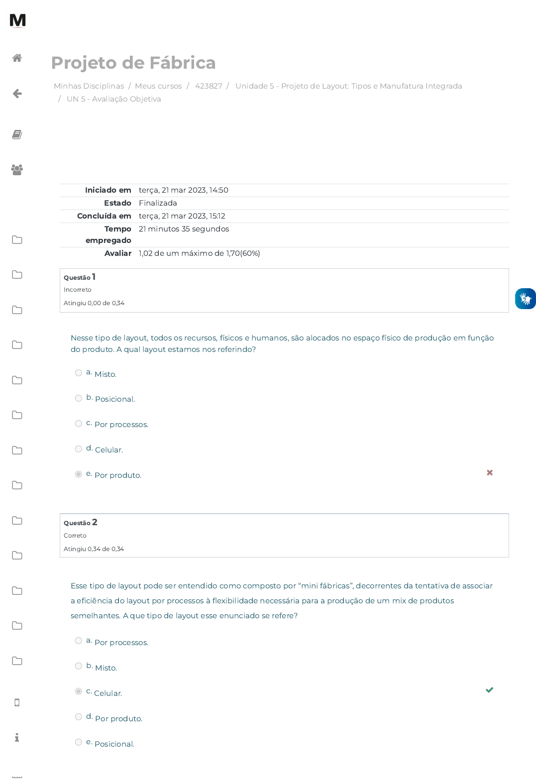 Minhas Disciplinas / Meus cursos / 423827 / Unidade 5 - Projeto de Layout: Tipos e Manufatura Integrada / UN 5 - Avaliação Objetiva Projeto de Fábrica Iniciado em terça, 21 mar 2023, 14:50 Estado Finalizada Concluída em terça, 21 mar 2023, 15:12 Tempo empregado 21 minutos 35 segundos Avaliar 1,02 de um máximo de 1,70(60%) Questão 1 Incorreto Atingiu 0,00 de 0,34 Questão 2 Correto Atingiu 0,34 de 0,34 Nesse tipo de layout, todos os recursos, físicos e humanos, são alocados no espaço físico de produção em função do produto. A qual layout estamos nos referindo? a. Misto. b. Posicional. c. Por processos. d. Celular. e. Por produto. Esse tipo de layout pode ser entendido como composto por “mini fábricas”, decorrentes da tentativa de associar a e�ciência do layout por processos à �exibilidade necessária para a produção de um mix de produtos semelhantes. A que tipo de layout esse enunciado se refere? a. Por processos. b. Misto. c. Celular. d. Por produto. e. Posicional. https://avap.multivix.edu.br/my/ https://avap.multivix.edu.br/course/view.php?id=20448 https://avap.multivix.edu.br/course/view.php?id=20448§ion=6 https://avap.multivix.edu.br/mod/quiz/view.php?id=1307117 https://avap.multivix.edu.br/my/ https://avap.multivix.edu.br/course/view.php?id=20448 https://avap.multivix.edu.br/user/index.php?id=20448 https://avap.multivix.edu.br/course/view.php?id=20448§ion=1 https://avap.multivix.edu.br/course/view.php?id=20448§ion=2 https://avap.multivix.edu.br/course/view.php?id=20448§ion=3 https://avap.multivix.edu.br/course/view.php?id=20448§ion=4 https://avap.multivix.edu.br/course/view.php?id=20448§ion=5 https://avap.multivix.edu.br/course/view.php?id=20448§ion=6 https://avap.multivix.edu.br/course/view.php?id=20448§ion=7 https://avap.multivix.edu.br/course/view.php?id=20448§ion=8 https://avap.multivix.edu.br/course/view.php?id=20448§ion=9 https://avap.multivix.edu.br/course/view.php?id=20448§ion=10 https://avap.multivix.edu.br/course/view.php?id=20448§ion=11 https://avap.multivix.edu.br/course/view.php?id=20448§ion=12 https://avap.multivix.edu.br/course/view.php?id=20448§ion=13 https://avap.multivix.edu.br/hooks/portal/ https://avap.multivix.edu.br/mod/page/view.php?id=1252%2F%22%20target%3D%22_blank https://avap.multivix.edu.br/calendar/view.php/ https://avap.multivix.edu.br/ Questão 3 Incorreto Atingiu 0,00 de 0,34 Questão 4 Correto Atingiu 0,34 de 0,34 Também chamado de layout em linha, esse tipo de layout é comumente empregado em situações em que há produção em grandes volumes de um único produto ou de produtos muito semelhantes. Estamos nos referindo a qual tipo de layout? a. Por processos. b. Por produto. c. Celular. d. Misto. e. Posicional. Também denominado layout híbrido, representa a consequência da utilização associada de dois ou mais dos tipos clássicos de layout. São comumente adotados e empregados em consequência de mudanças e alterações no processo produtivo originalmente concebido, de emprego e adequação de novas tecnologias, de adaptação do processo produtivo às demandas e de especi�cidades dos produtos. Esse tipo de layout é: a. Misto. b. Posicional. c. Celular. d. Por produto. e. Por processos. https://avap.multivix.edu.br/my/ https://avap.multivix.edu.br/course/view.php?id=20448 https://avap.multivix.edu.br/user/index.php?id=20448 https://avap.multivix.edu.br/course/view.php?id=20448§ion=1 https://avap.multivix.edu.br/course/view.php?id=20448§ion=2 https://avap.multivix.edu.br/course/view.php?id=20448§ion=3 https://avap.multivix.edu.br/course/view.php?id=20448§ion=4 https://avap.multivix.edu.br/course/view.php?id=20448§ion=5 https://avap.multivix.edu.br/course/view.php?id=20448§ion=6 https://avap.multivix.edu.br/course/view.php?id=20448§ion=7 https://avap.multivix.edu.br/course/view.php?id=20448§ion=8 https://avap.multivix.edu.br/course/view.php?id=20448§ion=9 https://avap.multivix.edu.br/course/view.php?id=20448§ion=10 https://avap.multivix.edu.br/course/view.php?id=20448§ion=11 https://avap.multivix.edu.br/course/view.php?id=20448§ion=12 https://avap.multivix.edu.br/course/view.php?id=20448§ion=13 https://avap.multivix.edu.br/hooks/portal/ https://avap.multivix.edu.br/mod/page/view.php?id=1252%2F%22%20target%3D%22_blank https://avap.multivix.edu.br/calendar/view.php/ Questão 5 Correto Atingiu 0,34 de 0,34 Tipo de layout, também conhecido como funcional ou por job, é comumente empregado em produções de baixo volume e tem por característica principal a alocação dos recursos físicos e humanos com base nos processos a serem executados. A qual tipo de layout estamos nos referindo? a. Posicional. b. Celular. c. Misto. d. Por produto. e. Por processos. ◄ Conteúdo online Seguir para... Conteúdo online ► https://avap.multivix.edu.br/mod/scorm/view.php?id=1307116&forceview=1 https://avap.multivix.edu.br/mod/scorm/view.php?id=1307118&forceview=1 https://avap.multivix.edu.br/my/ https://avap.multivix.edu.br/course/view.php?id=20448 https://avap.multivix.edu.br/user/index.php?id=20448 https://avap.multivix.edu.br/course/view.php?id=20448§ion=1 https://avap.multivix.edu.br/course/view.php?id=20448§ion=2 https://avap.multivix.edu.br/course/view.php?id=20448§ion=3 https://avap.multivix.edu.br/course/view.php?id=20448§ion=4 https://avap.multivix.edu.br/course/view.php?id=20448§ion=5 https://avap.multivix.edu.br/course/view.php?id=20448§ion=6 https://avap.multivix.edu.br/course/view.php?id=20448§ion=7 https://avap.multivix.edu.br/course/view.php?id=20448§ion=8 https://avap.multivix.edu.br/course/view.php?id=20448§ion=9 https://avap.multivix.edu.br/course/view.php?id=20448§ion=10 https://avap.multivix.edu.br/course/view.php?id=20448§ion=11 https://avap.multivix.edu.br/course/view.php?id=20448§ion=12 https://avap.multivix.edu.br/course/view.php?id=20448§ion=13 https://avap.multivix.edu.br/hooks/portal/ https://avap.multivix.edu.br/mod/page/view.php?id=1252%2F%22%20target%3D%22_bla