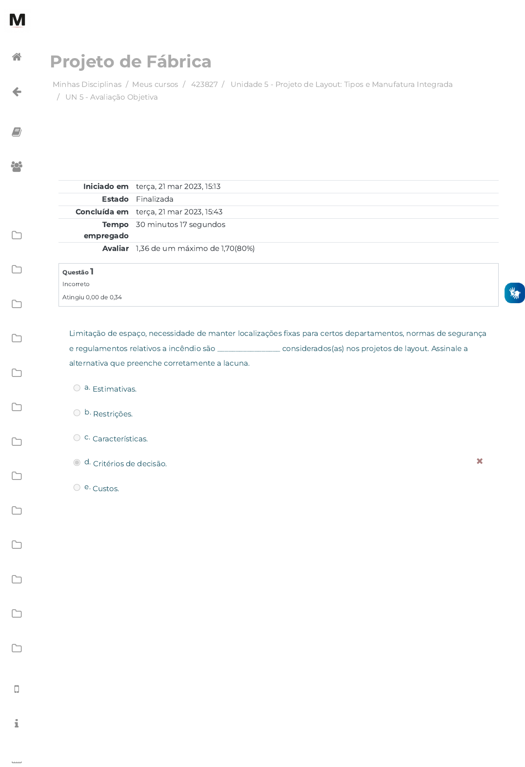 Minhas Disciplinas / Meus cursos / 423827 / Unidade 5 - Projeto de Layout: Tipos e Manufatura Integrada / UN 5 - Avaliação Objetiva Projeto de Fábrica Iniciado em terça, 21 mar 2023, 15:13 Estado Finalizada Concluída em terça, 21 mar 2023, 15:43 Tempo empregado 30 minutos 17 segundos Avaliar 1,36 de um máximo de 1,70(80%) Questão 1 Incorreto Atingiu 0,00 de 0,34 Limitação de espaço, necessidade de manter localizações �xas para certos departamentos, normas de segurança e regulamentos relativos a incêndio são _________________ considerados(as) nos projetos de layout. Assinale a alternativa que preenche corretamente a lacuna. a. Estimativas. b. Restrições. c. Características. d. Critérios de decisão. e. Custos. https://avap.multivix.edu.br/my/ https://avap.multivix.edu.br/course/view.php?id=20448 https://avap.multivix.edu.br/course/view.php?id=20448§ion=6 https://avap.multivix.edu.br/mod/quiz/view.php?id=1307117 https://avap.multivix.edu.br/my/ https://avap.multivix.edu.br/course/view.php?id=20448 https://avap.multivix.edu.br/user/index.php?id=20448 https://avap.multivix.edu.br/course/view.php?id=20448§ion=1 https://avap.multivix.edu.br/course/view.php?id=20448§ion=2 https://avap.multivix.edu.br/course/view.php?id=20448§ion=3 https://avap.multivix.edu.br/course/view.php?id=20448§ion=4 https://avap.multivix.edu.br/course/view.php?id=20448§ion=5 https://avap.multivix.edu.br/course/view.php?id=20448§ion=6 https://avap.multivix.edu.br/course/view.php?id=20448§ion=7 https://avap.multivix.edu.br/course/view.php?id=20448§ion=8 https://avap.multivix.edu.br/course/view.php?id=20448§ion=9 https://avap.multivix.edu.br/course/view.php?id=20448§ion=10 https://avap.multivix.edu.br/course/view.php?id=20448§ion=11 https://avap.multivix.edu.br/course/view.php?id=20448§ion=12 https://avap.multivix.edu.br/course/view.php?id=20448§ion=13 https://avap.multivix.edu.br/hooks/portal/ https://avap.multivix.edu.br/mod/page/view.php?id=1252%2F%22%20target%3D%22_blank https://avap.multivix.edu.br/calendar/view.php/ https://avap.multivix.edu.br/ Questão 2 Correto Atingiu 0,34 de 0,34 Questão 3 Correto Atingiu 0,34 de 0,34 Seja para o rearranjo de processos existentes ou para a de�nição de novos processos, a de�nição do layout é o principal produto da engenharia de ____________, por meio do qual se integram os cinco fatores de gestão industrial: homem, material, dinheiro, máquinas e mercado. Assinale a alternativa que preenche corretamente a lacuna. a. Produção. b. Produto. c. Econômica. d. Mecânica. e. De controle e automação. Tipo de layout, também conhecido como funcional ou por job, é comumente empregado em produções de baixo volume e tem por característica principal a alocação dos recursos físicos e humanos com base nos processos a serem executados. A qual tipo de layout estamos nos referindo? a. Por produto. b. Misto. c. Por processos. d. Celular. e. Posicional. https://avap.multivix.edu.br/my/ https://avap.multivix.edu.br/course/view.php?id=20448 https://avap.multivix.edu.br/user/index.php?id=20448 https://avap.multivix.edu.br/course/view.php?id=20448§ion=1 https://avap.multivix.edu.br/course/view.php?id=20448§ion=2 https://avap.multivix.edu.br/course/view.php?id=20448§ion=3 https://avap.multivix.edu.br/course/view.php?id=20448§ion=4 https://avap.multivix.edu.br/course/view.php?id=20448§ion=5 https://avap.multivix.edu.br/course/view.php?id=20448§ion=6 https://avap.multivix.edu.br/course/view.php?id=20448§ion=7 https://avap.multivix.edu.br/course/view.php?id=20448§ion=8 https://avap.multivix.edu.br/course/view.php?id=20448§ion=9 https://avap.multivix.edu.br/course/view.php?id=20448§ion=10 https://avap.multivix.edu.br/course/view.php?id=20448§ion=11 https://avap.multivix.edu.br/course/view.php?id=20448§ion=12 https://avap.multivix.edu.br/course/view.php?id=20448§ion=13 https://avap.multivix.edu.br/hooks/portal/ https://avap.multivix.edu.br/mod/page/view.php?id=1252%2F%22%20target%3D%22_blank https://avap.multivix.edu.br/calendar/view.php/ Questão 4 Correto Atingiu 0,34 de 0,34 Questão 5 Correto Atingiu 0,34 de 0,34 Também chamado de layout em linha, esse tipo de layout é comumente empregado em situações em que há produção em grandes volumes de um único produto ou de produtos muito semelhantes. Estamos nos referindo a qual tipo de layout? a. Misto. b. Por processos. c. Posicional. d. Por produto. e. Celular. Também denominado layout híbrido, representa a consequência da utilização associada de dois ou mais dos tipos clássicos de layout. São comumente adotados e empregados em consequência de mudanças e alterações no processo produtivo originalmente concebido, de emprego e adequação de novas tecnologias, de adaptação do processo produtivo às demandas e de especi�cidades dos produtos. Esse tipo de layout é: a. Posicional. b. Celular. c. Por produto. d. Por processos. e. Misto. ◄ Conteúdo online Seguir para... Conteúdo online ► https://avap.multivix.edu.br/mod/scorm/view.php?id=1307116&forceview=1 https://avap.multivix.edu.br/mod/scorm/view.php?id=1307118&forceview=1 https://avap.multivix.edu.br/my/ https://avap.multivix.edu.br/course/view.php?id=20448 https://avap.multivix.edu.br/user/index.php?id=20448 https://avap.multivix.edu.br/course/view.php?id=20448§ion=1 https://avap.multivix.edu.br/course/view.php?id=20448§ion=2 https://avap.multivix.edu.br/course/view.php?id=20448§ion=3 https://avap.multivix.edu.br/course/view.php?id=20448§ion=4 https://avap.multivix.edu.br/course/view.php?id=20448§ion=5 https://avap.multivix.edu.br/course/view.php?id=20448§ion=6 https://avap.multivix.edu.br/course/view.php?id=20448§ion=7 https://avap.multivix.edu.br/course/view.php?id=20448§ion=8 https://avap.multivix.edu.br/course/view.php?id=20448§ion=9 https://avap.multivix.edu.br/course/view.php?id=20448§ion=10 https://avap.multivix.edu.br/course/view.php?id=20448§ion=11 https://avap.multivix.edu.br/course/view.php?i