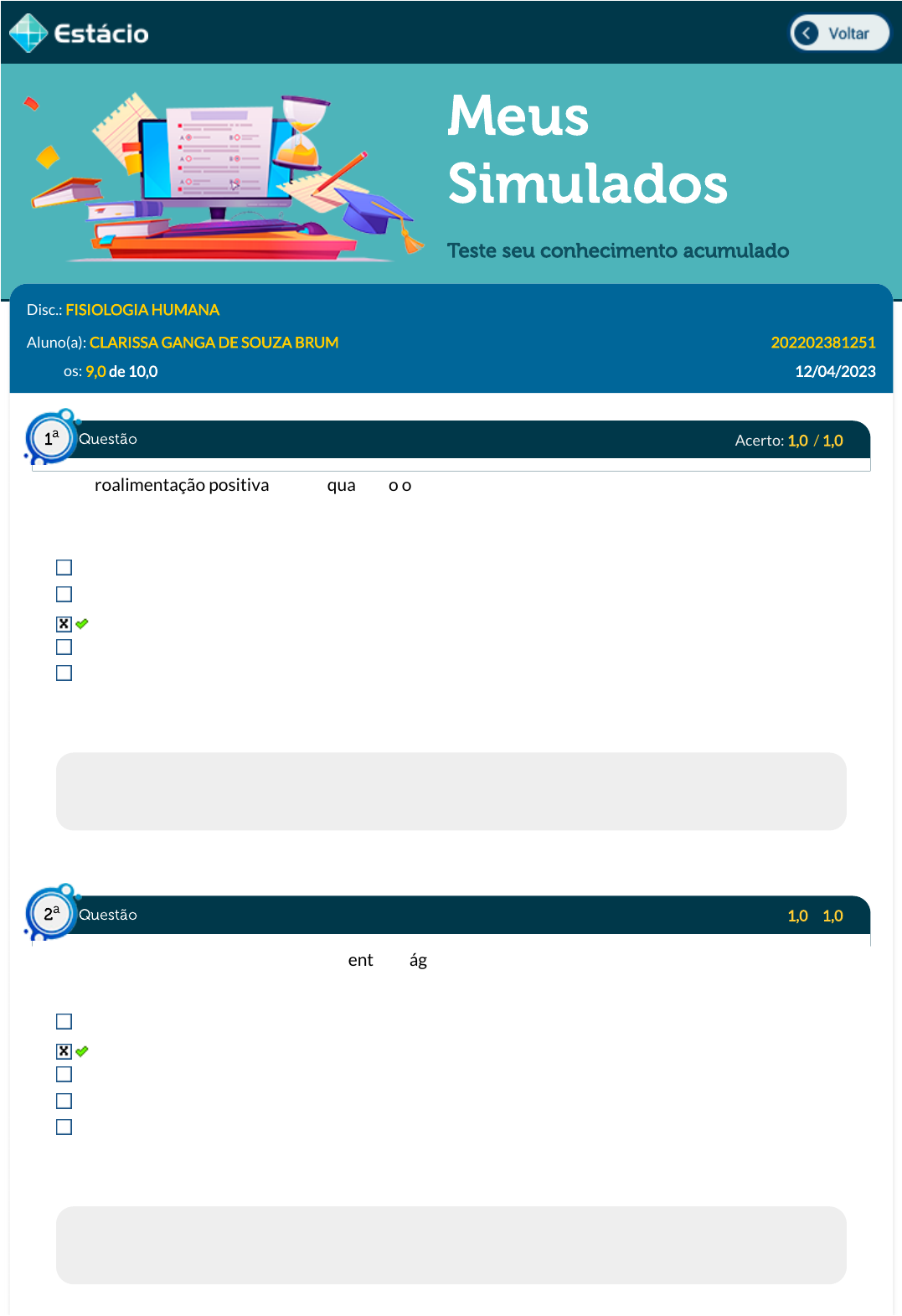12/04/2023 11:19 Estácio: Alunos https://simulado.estacio.br/alunos/ 1/5 Meus Simulados Teste seu conhecimento acumulado Disc.: FISIOLOGIA HUMANA Aluno(a): CLARISSA GANGA DE SOUZA BRUM 202202381251 Acertos: 9,0 de 10,0 12/04/2023 Acerto: 1,0 / 1,0 A retroalimentação positiva ocorre quando o organismo provoca uma alteração em um determinado parâmetro �siológico no mesmo sentido que estava ocorrendo. Esse sistema de controle homeostático só ocorre em situações muito especí�cas como: Alimentação Controle da glicemia. Despolarização da membrana Sono Controle da pressão arterial. Respondido em 12/04/2023 11:11:22 Explicação: A resposta correta é: Despolarização da membrana Acerto: 1,0 / 1,0 Marque a opção correta. O compartimento de água do corpo humano que contém 2/3 da água corporal total é: Plasma Líquido intracelular Líquido extracelular Líquido intersticial Linfa Respondido em 12/04/2023 11:11:53 Explicação: A resposta correta é: Líquido intracelular Questão1 a Questão2 a https://simulado.estacio.br/alunos/inicio.asp javascript:voltar(); 12/04/2023 11:19 Estácio: Alunos https://simulado.estacio.br/alunos/ 2/5 Acerto: 1,0 / 1,0 O tato inicialmente foi descrito por Aristóteles como sendo um sentido especial. Mas, atualmente ele é considerado um sentido somatossensorial. A detecção das cócegas e do prurido é feita por: Corpúsculos de Pacini. Corpúsculos de Meissner. Fuso muscular. Terminações nervosas livres. Discos de Merkel. Respondido em 12/04/2023 11:11:56 Explicação: A resposta correta é: Terminações nervosas livres. Acerto: 1,0 / 1,0 Uma das funções do sistema digestório é fornecer nutrientes ao organismo. Qual é o órgão do sistema digestório que se divide em duodeno, jejuno e íleo? Esôfago Intestino grosso Faringe Estômago Intestino delgado Respondido em 12/04/2023 11:12:25 Explicação: A resposta correta é: Intestino delgado Acerto: 1,0 / 1,0 Uma das principais recomendações para manter os rins saudáveis é beber muita água. Quando se bebe pouca água, pode ocorrer a formação de cristais, que �cam aderidos no tecido renal, causando muita dor. Esse problema é conhecido como: câncer renal. cisto renal. infecção urinária. pielonefrite. cálculo renal. Respondido em 12/04/2023 11:13:58 Explicação: Questão3 a Questão4 a Questão5 a 12/04/2023 11:19 Estácio: Alunos https://simulado.estacio.br/alunos/ 3/5 O rim é inervado por ramos do nervo simpático toracolombar, provenientes dos segmentos entre a quarta vértebra dorsal e a quarta vértebra lombar. As �bras simpáticas se distribuem pelas artérias, arteríolas e pelos túbulos proximais. No cálculo renal há uma obstrução causando muita dor. Isso ocorre porque a cápsula que envolve o rim é altamente inervada e inextensível. Com a obstrução do �uxo da urina dentro do rim, em razão do cálculo, o parênquima renal não á capaz de eliminar a urina produzida, aumentando de volume. Com a expansão do tecido em direção à cápsula inervada, sem que essa se estenda da mesma forma, ocorre compressão das terminações nervosas e dor. Acerto: 1,0 / 1,0 Os rins são órgãos que tem o formato de um feijão com duas regiões visíveis conhecidas como córtex e a medula. Sua principal função é a formação de urina que é decorrente de outras funções renais. Analise abaixo as funções renais que estão ligadas com a formação da urina: I. Controle do balanço de eletrólitos. II. Regulação do equilíbrio ácido-base. III. Regulação da pressão arterial. IV. Regulação Hormonal. É correto o que se a�rmar: I e II apenas. I, II e III, apenas. IV apenas. II e III apenas II e IV apenas. Respondido em 12/04/2023 11:14:41 Explicação: Os rins possuem diversas funções, como regulação do volume de água do organismo, controle do balanço eletrolítico, regulação do equilíbrio ácido-base, conservação de nutrientes, excreção de resíduos metabólicos, regulação da hemodinâmica sistêmica, regulação da pressão arterial, produção de hormônios, gliconeogênese e produção de vitamina D. Acerto: 0,0 / 1,0 Com relação ao re�exo patelar, que é uma resposta involuntária a um estímulo sensorial, analise as a�rmativas abaixo. I. No re�exo patelar, apenas dois tipos de neurônios estão envolvidos: o sensorial, transmissor do impulso para a medula espinal; e o motor, que traz o impulso medular até o músculo da coxa, provocando a contração. II. Na avaliação do re�exo patelar, ao bater-se com um martelo no joelho, os axônios dos neurônios sensoriais são excitados e, portanto, os dendritos conduzem o impulso até à medula espinal. III. Se a raiz ventral do nervo espinal for seccionada, a pessoa sente a batida no joelho, mas não move a perna. Assinale a alternativa que apresenta somente a�rmativas corretas. I e II I, II e III Questão6 a Questão7 a 12/04/2023 11:19 Estácio: Alunos https://simulado.estacio.br/alunos/ 4/5 Nenhuma das opções são corretas. II e III I e III Respondido em 12/04/2023 11:15:22 Explicação: A resposta correta é: I e III. Acerto: 1,0 / 1,0 A natureza química dos hormônios determina a classi�cação dessas moléculas. Sobre os hormônios peptídicos escolha a alternativa verdadeira: São hormônios derivados do colesterol. Atuam sobre receptores intracelulares. São hormônios lipossolúveis. São pequenas sequências de aminoácidos. Na corrente sanguínea, se associam a proteínas de transporte. Respondido em 12/04/2023 11:18:08 Explicação: A resposta correta é: São pequenas sequências de aminoácidos. Acerto: 1,0 / 1,0 O coração possui células autoexcitáveis responsáveis pelo controle intrínseco da ritmicidade cardíaca, além disso, pode ser considerado um sincício funcional devido a características especí�cas. Entre as opções abaixo, marque a que justi�que o fato pelo qual o coração é considerado um sincício funcional: Pela sua capacidade intr