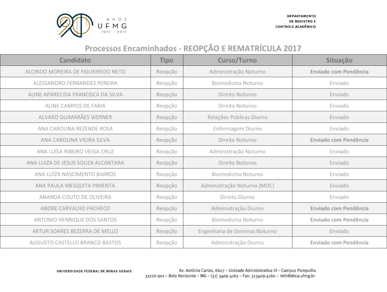 Processos Encaminhados - REOPÇÃO E REMATRÍCULA 2017 Candidato Tipo Curso/Turno Situação ALCINDO MOREIRA DE FIGUEIREDO NETO Reopção Administração Noturno Enviado com Pendência ALESSANDRO FERNANDES PEREIRA Reopção Biomedicina Noturno Enviado ALINE APARECIDA FRANCISCA DA SILVA Reopção Direito Noturno Enviado ALINE CAMPOS DE FARIA Reopção Direito Noturno Enviado ALVARO GUIMARÃES WERNER Reopção Relações Públicas Diurno Enviado ANA CAROLINA REZENDE ROSA Reopção Enfermagem Diurno Enviado ANA CAROLINA VIEIRA SILVA Reopção Direito Noturno Enviado com Pendência ANA LUÍSA RIBEIRO VEIGA CRUZ Reopção Administração Noturno Enviado ANA LUIZA DE JESUS SOUZA ALCANTARA Reopção Direito Noturno Enviado ANA LUÍZA NASCIMENTO BARROS Reopção Biomedicina Noturno Enviado ANA PAULA MESQUITA PIMENTA Reopção Administração Noturno (MOC) Enviado ANANDA COUTO DE OLIVEIRA Reopção Direito Diurno Enviado ANDRE CARVALHO PACHECO Reopção Administração Diurno Enviado com Pendência ANTONIO HENRIQUE DOS SANTOS Reopção Biomedicina Noturno Enviado com Pendência ARTUR SOARES BEZERRA DE MELLO Reopção Engenharia de Sistemas Noturno Enviado AUGUSTO CASTELLO BRANCO BASTOS Reopção Administração Diurno Enviado com Pendência Processos Encaminhados - REOPÇÃO E REMATRÍCULA 2017 Candidato Tipo Curso/Turno Situação BARBARA RAISSA VITORIANO REIS Reopção Biomedicina Noturno Enviado BRUNO MALAGOLI Reopção Engenharia de Sistemas Noturno Enviado CAMILA LUIZA DORNAS DE OLIVEIRA Reopção Biomedicina Noturno Enviado com Pendência CAROLINA DANIELA DA SILVA BRAZIL DO COUTO Rematrícula Química Noturno Enviado CAROLINE FERREIRA MANSUR Reopção Direito Noturno Enviado com Pendência CAROLINE MENDES SOUZA Reopção Administração Diurno Enviado CASSIO FERNANDES LIMA ALVES PINTO Reopção Jornalismo Noturno Enviado CINARA KELLY ALVES CRUZ Rematrícula Letras Noturno Enviado CLARICE CRISTINE FERREIRA MENEZES Rematrícula Letras Diurno Enviado com Pendência CLÁUDIA MÁRCIA MOTA AMORIM Reopção Direito Noturno Enviado com Pendência CRISTINA DE JESUS GONÇALVES Reopção Fonoaudiologia Diurno Enviado com Pendência CYNTIA CHRISTINA MASSOTE Reopção Direito Noturno Enviado DANIEL FERNANDO MOREIRA VARGAS Reopção Matemática Diurno Enviado DANIELLE DE CARVALHO CAMPOS FERREIRA Reopção Direito Noturno Enviado DAVI MICHEL AZEVEDO PEIXE Reopção Direito Diurno Enviado DEBORA CAROLINE NUNES DA SILVA Reopção Química Tecnológica Noturno Enviado Processos Encaminhados - REOPÇÃO E REMATRÍCULA 2017 Candidato Tipo Curso/Turno Situação DESIREE KINOSHITA RIBEIRO DE OLIVEIRA Reopção Letras Noturno Enviado DESIREE NONATO BRAGA Reopção Administração Diurno Enviado DIANA MARQUES PYLÓ Reopção Administração Diurno Enviado DIEGO SANTOS LIMA Rematrícula Letras Noturno Enviado com Pendência EDSON GRACIANO DA ROCHA Reopção Biomedicina Noturno Enviado com Pendência EDUARDO DE BRITO MOREIRA MORAES Rematrícula Direito Diurno Enviado EDUARDO SILVA LEROY Reopção Letras Noturno Enviado EMILIANA APARECIDA DA SILVA ESTEVES Rematrícula Biblioteconomia Diurno Enviado ERICK CAMARGO DOS SANTOS Reopção Direito Noturno Enviado com Pendência FELIPE BRANDÃO GUISOLI Reopção Física Noturno Enviado com Pendência FELIPE IAGO BARBOSA DA ROCHA Reopção Engenharia de Sistemas Noturno Enviado com Pendência FELIPE LUIGI SILVA MAGALHÃES Reopção Publicidade e Propaganda Diurno Enviado FELIPE MARCELO DUARTE Reopção Publicidade e Propaganda Diurno Enviado FELIPE RIBAS MUNIZ Reopção Matemática Computacional Diurno Enviado FERNANDA LIMA ABREU Reopção Química Tecnológica Noturno Enviado com Pendência FERNANDA MUDESTO PASSOS Reopção Publicidade e Propaganda Diurno Enviado Processos Encaminhados - REOPÇÃO E REMATRÍCULA 2017 Candidato Tipo Curso/Turno Situação FERNANDA PINHEIRO DE SÁ Reopção Direito Noturno Enviado com Pendência FERNANDO CESAR DE ASSIS DIAS Rematrícula Física Noturno Enviado com Pendência FERNANDO FREIRE BASTOS XAVIER Reopção Administração Noturno Enviado FERNANDO VIEIRA DE CARVALHO Reopção Letras Noturno Enviado FLAVIO TERCIO FARIAS ALVES Reopção Direito Noturno Enviado FRANCIELY DUTRA BASTOS Reopção Química Tecnológica Noturno Enviado FREDERICO CALDEIRA DA SILVA Rematrícula Física Noturno Enviado FREDERICO ESTEVES MARTINS Reopção Engenharia de Sistemas Noturno Enviado FREDERICO PEREZ BAGNO ZAULI Reopção Administração Diurno Enviado com Pendência GABRIEL SANTANA SOUZA Reopção Matemática Diurno Enviado GABRIELA FERNANDES FERREIRA Reopção Publicidade e Propaganda Diurno Enviado GABRIELA ZARDINI ATAYDE Reopção Psicologia Diurno Enviado GEYSE JULIE MENDES Reopção Ciências Contábeis Noturno Enviado GIOVANE JANSEN DE AVELAR RIBEIRO Reopção Administração Diurno Enviado GISLEIDE DA COSTA SANTOS Reopção Psicologia Diurno Enviado GLÁUBER NARCISO CIRINO DOS SANTOS Reopção Fisioterapia Diurno Enviado Processos Encaminhados - REOPÇÃO E REMATRÍCULA 2017 Candidato Tipo Curso/Turno Situação GUILHERME BETTA REGIS Reopção Letras Noturno Enviado GUSTAVO DE LUCAS FICHE Rematrícula Direito Noturno Enviado GUSTAVO FERREIRA DE BARROS Reopção Psicologia Diurno Enviado GUSTAVO HENRIQUE FERREIRA LA FLOR Reopção Publicidade e Propaganda Diurno Enviado GUSTAVO SOUZA MAIA Reopção Direito Noturno Enviado GYSELLE LUCIENE BRANDÃO PINTO Rematrícula Pedagogia Noturno Enviado HELEN ANTONIETA DE MELO Reopção Pedagogia Noturno Enviado IARA NILZA DE LOURDES BRITTO MARQUES OLIVEIRA BOSON Reopção Física Noturno Enviado ISABELA GUEDES DE OLIVEIRA Reopção Direito Noturno Enviado com Pendência ISABELLA FERNANDES FERREIRA SOARES Reopção Direito Noturno Enviado ISADORA MOREIRA DE OLIVEIRA Reopção Gestão Pública Noturno Enviado JACKSON LIMA DE ALMEIDA Reopção Engenharia de Sistemas Noturno Enviado JEAN WALTER SOARES LOPES Reopção Engenharia Florestal Diurno Enviado JESSICA DE OLIVEIRA Reopção Administração Noturno Enviado J