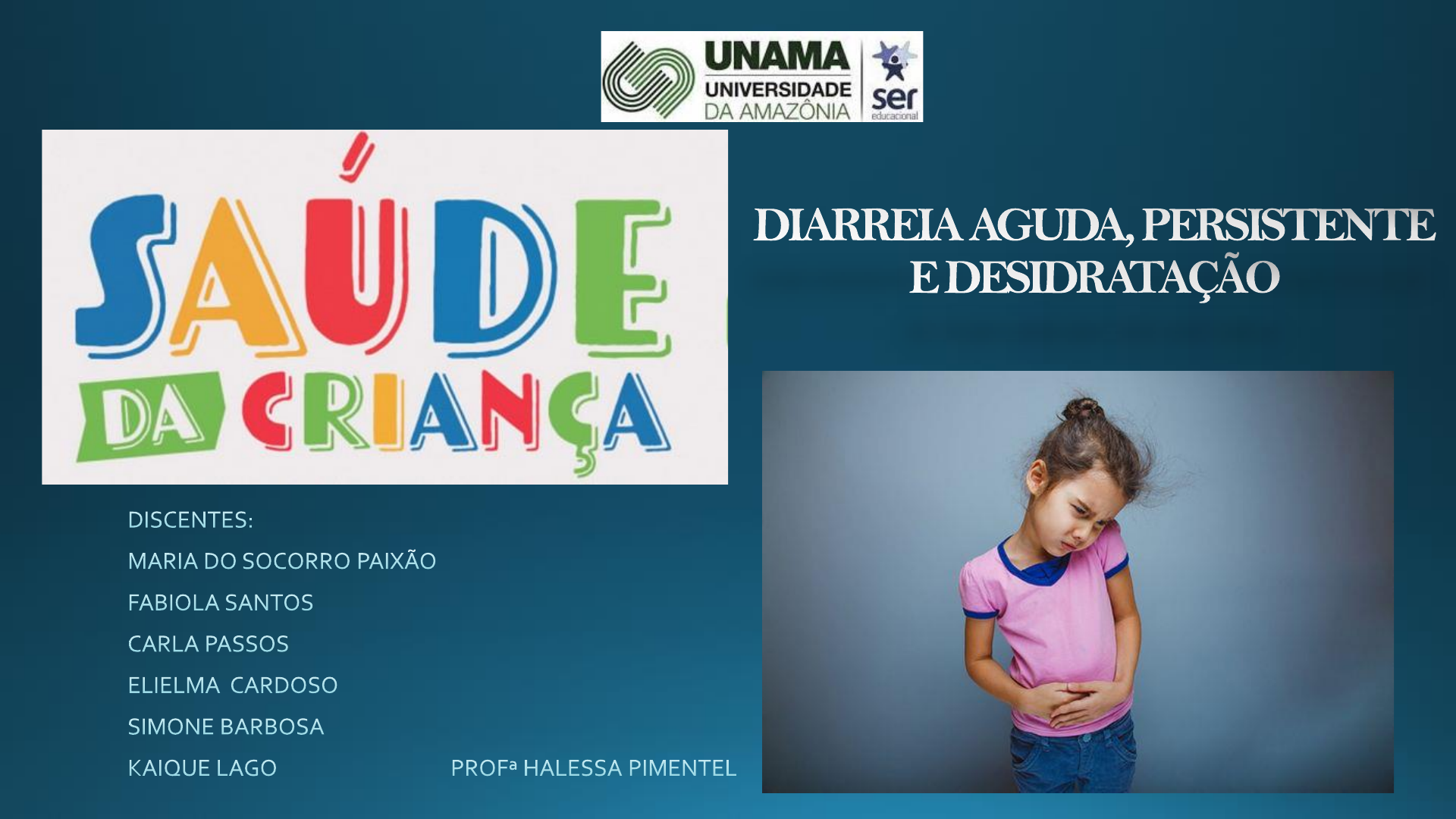 Diarreia aguda é uma doença, que ocorre devido a infecções por vírus e bactérias, caracterizada pela perda de água e eletrólitos, que resulta no aumento do volume e da frequência de evacuações e diminuição da consistência habitual das fezes, apresentando algumas vezes muco e sangue (disenteria), o que pode levar a desnutrição e desidratação. De acordo com a OMS (Organização Mundial da Saúde), a doença diarreica pode ser dívida em DIARREIA AGUDA, PERSISTENTE OU CRÔNICA: DIARREIA AGUDA: A maioria dos episódios de diarreia aguda é provocado por um agente infeccioso e dura menos de duas semanas, podendo ser classificada como: • DIARREIA AGUDA AQUOSA. • DIARREIA AGUDA COM SANGUE (DISENTERIA). DIARREIA PERSISTENTE: é quando a diarreia aguda se estende por 14 dias ou mais, podendo desenvolver complicações como desnutrição, desidratação e óbito. DIARREIA CRÔNICA: não é autolimitada, possui causas intestinais e extra intestinais e se estende por 30 dias ou pela frequência de 3 ou mais episódios de curta duração, podendo estar associado ou não com a síndrome da má absorção. Panorama Epidemiológico da Doença • Mais de 2,4 bilhões de pessoas no mundo não tem acesso as condições básicas e adequadas de saneamento. • A origem da diarreia aguda persistente e desidratação relaciona-se principalmente a condição social e de higiene inadequada, de acordo com argumentos de Paiva e Souza (2018). • No Brasil, entre os anos de 2017 e 2018, foram notificados junto ao MS cerca de 10 milhões de casos de diarreia sendo que aproximadamente 2 milhões destes acometeram menores de 5 anos de idade em todo o país (Brasil, 2018). • Nesta faixa etária, os índices de óbitos se elevam e ficam evidentes nos estados do norte do Brasil onde sabe-se que 88% das mortes por diarreia estão associadas a estrutura da rede de abastecimento e higiene precária. Etiologia As diarreias agudas estão mais associadas a gastroenterites virais, como o rotavírus, bacterianas, como E. coli, Salmonella, Aeromonas, Cólera, ou parasitas, hemintos e protozoários. • Pacientes imunocomprometidos ou em antibioticoterapia prolongada, podem ter diarreia causada por: Pseudomonas, Aereobacter, Cryptosporidium e outros agentes. • Eventualmente outras causas podem iniciar o quadro como diarreias tais como: alergia ao leite de vaca, deficiência de lactase, apendicite aguda, uso de laxantes e antibióticos, intoxicação por metais pesados. Manifestações Clínicas • Durante a diarreia aguda, ocorrem alterações no transporte de água e eletrólitos no trato digestivo, tendo como consequências distúrbios nos mecanismos digestivo, absortivo e secretório do intestino. A intensidade desses distúrbios é variável, desde leve com repercussões clínicas discretas a graves, levando à morte por desidratação. • Além da diarreia, a criança pode apresentar febre, vômitos, dores abdominais, perda ou diminuição do apetite, redução do volume urinário, enfatizando-se que, quanto menor a idade e maior o comprometimento do estado nutricional, maior será a gravidade do episódio diarreico. Diagnóstico A anamnese da criança com doença diarreica deve conter os seguintes dados: • Duração da diarreia; • Número diário de evacuações; • A presença ou não de sangue nas fezes; • Número de episódios de vômitos; • Presença de febre ou outra manifestação clinica; • praticas alimentares previas e vigentes; • Outros casos de diarreia em casa ou na escola. Ao exame físico avaliar o estado de hidratação, estado nutricional, estado de alerta, ativo, irritável, letárgico ,capacidade de beber e diurese e, o percentual de perda de peso até 5% representa a hidratação leve, entre 5% e 10% é moderada e perda de mais 10% grave. Tratamento De acordo com a OMS, 90% dos casos de desidratação por diarreia aguda em qualquer idade e por qualquer etiologia podem ser segura e efetivamente tratada com terapia de reidratação oral, quatro horas após o inicio da terapia de reidratação o paciente deve ser reavaliado , pacientes com desidratação grave devem ser tratados por via parental. A prescrição de Antimicrobianos apenas em situações como: • Diarreia com sangue, quando é indicada a ciprofloxacina durante 3 dias, ou por 5 dias com outro antimicrobiano. • Após 2 dias nas seguintes situações: quando inicialmente apresentava-se desidratada, idade inferior a 1 ano, infecção por sarampo nas últimas 6 semanas e quando não melhora Prevenção • Políticas Públicas relacionadas ao Saneamento Básico: • Uso de agua tratada; • Preparo adequado de alimentos; • Lavagem de mãos de quem prepara os alimentos e da própria criança; • O aleitamento materno, que auxilia diretamente no desenvolvimento do sistema imunológico e da flora intestinal do recém nascido; • Vacinação para rotavírus. DESIDRATAÇÃO DICA IMPORTANTE! • Departamento de Análise em Saúde e Vigilância das Doenças Não Transmissíveis - http://svs.aids.gov.br/dantps/centrais-de-conteudos/paineis-de- monitoramento/mortalidade/infantil-e-fetal/ • Resumo: Diarreia na infância | Ligas - https://www.sanarmed.com/resumo-diarreia-na- infancia-ligas • Assistência e Controle das Doenças Diarréicas - Ministério da Saúde - https://bvsms.saude.gov.br/bvs/publicacoes/partes/doencas_diarreicas1.pdf • BERHMAN, R. E.; KLIEGMAN, R. M.; JENSON, H.B. Nelson: tratado de pediatria. 20º ed, Rio de Janeiro: Elsevier, 2017. • SOCIEDADE BRASILEIRA DE PEDIATRIA. Tratado de Pediatria. 4. ed. São Paulo: Manole, 2017. • SOCIEDADE BRASILEIRA DE PEDIATRIA. Guia prático de atualização. Diarreia aguda: diagnóstico e tratamento, 2017. Slide 1: DIARREIA AGUDA, PERSISTENTE E DESIDRATAÇÃO Slide 2: Conceito Slide 3: De acordo com a OMS (Organização Mundial da Saúde), a doença diarreica pode ser dívida em DIARREIA AGUDA, PERSISTENTE OU CRÔNICA: Slide 4: Panorama Epidemiológ