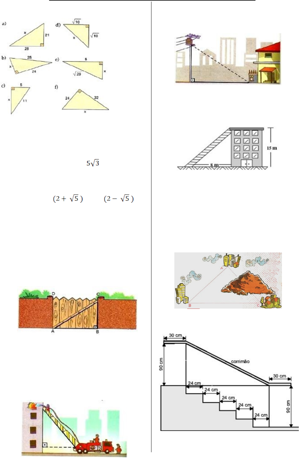 EXERCÍCIOS DE APLICAÇÃO DO TEOREMA DE PITÁGORAS 1. Aplicando o teorema de Pitágoras, determine a medida x indicada em cada um dos triângulos: 2. Os lados de um triângulo ABC medem 10cm, 24cm e 26cm. Você pode afirmar que esse triângulo é retângulo? 3. Em um triângulo retângulo, a hipotenusa mede 14 cm e um dos catetos mede cm. Determine a medida do outro cateto. 4. As medidas dos catetos de um triângulo retângulo medem cm e cm. Determine a medida da hipotenusa. 5. Um terreno triangular tem frentes de 12 m e 16 m em duas ruas que formam um ângulo de 90°. Quanto mede o terceiro lado desse terreno? 6. O portão de entrada de uma casa tem 4m de comprimento e 3m de altura. Que comprimento teria uma trave de madeira que se estendesse do ponto A até o ponto C? 7. Durante um incêndio num edifício de apartamentos, os bombeiros utilizaram uma escada Magirus de 10 m para atingir a janela do apartamento em chamas. A escada estava colocada a 1 m do chão, sobre um caminhão que se encontrava afastado 6 m do edifício. Qual é a altura do apartamento em relação ao chão? 8. Quantos metros de fio são necessários para "puxar luz" de um poste de 6 m de altura até a caixa de luz que está ao lado da casa e a 8 m da base do poste? 9. A figura mostra um edifício que tem 15 m de altura, com uma escada colocada a 8 m de sua base ligada ao topo do edifício. Qual é o comprimento da escada? 10. No mapa, as cidades A, B e C são vértices de um triângulo retângulo, sendo que o ângulo reto é Â. A estrada AB tem 40 km e a estrada BC tem 50 km. As montanhas impedem a construção de uma estrada que ligue diretamente A com C. por isso, será construída uma estrada da cidade A para a estrada BC, de modo que ela seja a mais curta possível. Qual é o comprimento da estrada que será construída? B C 11. O esquema abaixo representa o projeto de uma escada de 5 degraus com mesma altura. De acordo com os dados da figura, qual é o comprimento de todo o corrimão? 12. Uma árvore foi quebrada pelo vento e a parte do tronco que restou em pé forma um ângulo reto com o solo. Se a altura do tronco da árvore que restou em pé é de 12 m, e a ponta da parte quebrada está a 9 m da base da árvore, qual é a medida da outra parte quebrada da árvore? 13. Pedro precisa de uma tábua para fazer um reforço diagonal numa porteira de 1,5 m de altura por 2 m de comprimento. De quantos metros deverá ser essa tábua? 14. O acesso a uma garagem situada no subsolo de uma casa é feito por rampa, conforme nos mostra o desenho: Sabe-se que a rampa AC tem 10,25 metros de comprimento, e a altura BC da garagem é 2,25 metros. A distância AB entre o portão e a entrada da casa é de quantos metros? 15. Três cidades, A, B e C, são interligadas por estradas, conforme a figura abaixo. As estradas AB e BC já são asfaltadas, e AC deverá ser asfaltada em breve. Sabendo que AB tem 30 km e BC tem 17 km, quantos quilômetros precisarão ser asfaltados para asfaltar toda a estrada AC? 16. Na figura estão apresentadas três cidades, deseja-se construir uma estrada que ligue a cidade A a cidade B, com o menorcomprimento possível. Qual deverá ser o comprimento dessa estrada? 17. Utilizando o Teorema de Pitágoras, determine o valor de x nos triângulos abaixo: 18. Qual era a altura do poste/ 19. Pedro e João estão brincando de gangorra, como indica a figura: Qual é o comprimento da gangorra? 20. Qual é a distância percorrida pela bolinha? 21. A figura representa uma ilha em escala reduzida. Se o lado de cada quadradinho do mapa equivale a 1 km no tamanho real, qual é a distância, em linha reta, entre os pontos A e B? 22. Uma linha de transmissão de energia elétrica, formada de dois cabos, será construída sobre um morro, como na figura. Aproximadamente, quantos metros de cabo serão necessários nesse trecho? 23. Em um recente vendaval, um poste de luz de 9 metros de altura quebrou-se em uma ponto a uma distância x do solo. A parte do poste acima da fratura inclinou-se e sua extremidade superior encostou no solo a uma distância de 3 m do mesmo. A que altura x do solo o poste quebrou? 24. Calcule os valores de x e y na figura abaixo: 25. As extremidades de um fio de antena totalmente esticado estão presas no topo de um prédio e no topo de um poste, respectivamente, de 16 e 4 metros de altura. Considerando-se o terreno horizontal e sabendo-se que a distância entre o prédio e o poste é de 9 m. Qual é o comprimento do fio? 26. Qual deve ser a altitude do balão para que sua distância ao topo do prédio seja de 10 km? 27. Nos telhados de dois edifícios encontram-se duas pombas. É atirado um pouco de pão para o chão: ambas as pombas se lançam sobre o pão à mesma velocidade e ambas chegam no mesmo instante junto do pão. a) A que distância do edifício B caiu o pão? b) Qual a altura do edifício A? 28) Amanda saiu de casa para passear com seu cachorrinho. Como ela mora no interior, perto de uma linda floresta, nem se deu conta que tinha caminhado uma distância de 8 quilômetros! Sabendo que ela caminhou 6 km para o norte e 2 km a oeste, qual será aproximadamente a distância mínima que ela deve percorrer para voltar pra casa? (A) 8 km (B) 7 km (C) 6,3 km (D) 6,8 km 29) Qual deve ser o comprimento da peça de ligação do telhado? 30) A Torre Eiffel é uma torre treliça de ferro do século XIX localizada no Champ de Mars, em Paris, que se tornou um ícone mundial da França e uma das estruturas mais reconhecidas no mundo. Nomeada em homenagem ao seu projetista, o engenheiro Gustave Eiffel, foi construída como o arco de entrada da Exposição Universal de 1889. A torre possui 324 metros de altura. Uma pomba voou em linha reta do seu topo até o ponto M. A distância do centro da base do monumento até o ponto M é igual a 15 m, como mostra a ilustração abaixo. Qual foi a distância, em metros, percorrida por essa pomba?