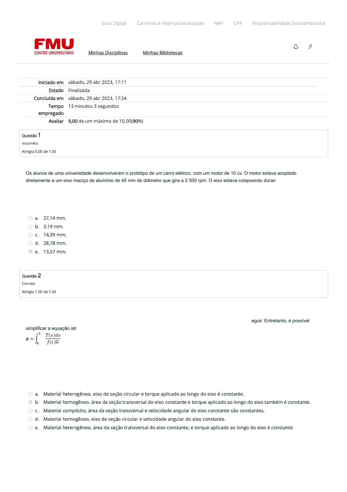 29/04/2023 17:24 Atividade 2 (A2): Revisão da tentativa https://ambienteacademico.com.br/mod/quiz/review.php?attempt=2098733&cmid=793315 1/7 Iniciado em sábado, 29 abr 2023, 17:11 Estado Finalizada Concluída em sábado, 29 abr 2023, 17:24 Tempo empregado 13 minutos 3 segundos Avaliar 9,00 de um máximo de 10,00(90%) Questão 1 Incorreto Atingiu 0,00 de 1,00 Questão 2 Correto Atingiu 1,00 de 1,00 Os alunos de uma universidade desenvolveram o protótipo de um carro elétrico, com um motor de 10 cv. O motor estava acoplado diretamente a um eixo maciço de alumínio de 45 mm de diâmetro que gira a 2 500 rpm. O eixo estava colapsando durante a operação, e os alunos necessitavam determinar se o problema era devido ao diâmetro do eixo ou devido a falhas no processo de fabricação desse eixo, que o fragilizava. Sendo a tensão de cisalhamento admissível no alumínio de 6 MPa, calcule qual é o menor diâmetro necessário ao projeto em questão. Assinale a alternativa que apresenta o valor: a. 27,14 mm. b. 3,19 mm. c. 14,39 mm. d. 28,78 mm. e. 13,57 mm. Para o correto dimensionamento de eixos é importante determinar qual o ângulo de torção que o eixo terá durante sua operação. Para qualquer eixo, sem quaisquer simplificações, o ângulo de torção é determinado pela integral apresentada a seguir. Entretanto, é possível simplificar a equação através de algumas considerações simplificadoras. Fonte: HIBBELER, R. C. Resistência dos materiais. 7. ed. São Paulo: Pearson, 2011. p.140. Nesse contexto, assinale a alternativa que apresenta as simplificações necessárias para que a utilização da equação seja facilitada: a. Material heterogêneo, eixo de seção circular e torque aplicado ao longo do eixo é constante. b. Material homogêneo, área da seção transversal do eixo constante e torque aplicado ao longo do eixo também é constante. c. Material compósito, área da seção transversal e velocidade angular do eixo constante são constantes. d. Material homogêneo, eixo de seção circular e velocidade angular do eixo constante. e. Material heterogêneo, área da seção transversal do eixo constante, e torque aplicado ao longo do eixo é constante. Guia Digital Carreiras e Internacionalização NAP CPA Responsabilidade Socioambiental Minhas Disciplinas Minhas Bibliotecas jf https://codely-fmu-content.s3.amazonaws.com/Moodle/GuiaDigital/Guia+digital/index.html https://carreiras.fmu.br/ https://codely-fmu-content.s3.amazonaws.com/Moodle/NAP/inicial/nap/fmu/index.html https://codely-fmu-content.s3.amazonaws.com/Moodle/CPA/landing_CPA/index.html https://portal.fmu.br/sustentabilidade https://ambienteacademico.com.br/ https://ambienteacademico.com.br/ https://ambienteacademico.com.br/course/view.php?id=236 29/04/2023 17:24 Atividade 2 (A2): Revisão da tentativa https://ambienteacademico.com.br/mod/quiz/review.php?attempt=2098733&cmid=793315 2/7 Questão 3 Correto Atingiu 1,00 de 1,00 Diagramas de esforço cortante e momento fletor são muito utilizados por apresentar várias informações de forma visual e rapidamente. As afirmativas abaixo apresentam uma estrutura com vínculos estruturais e forças atuantes, seguido de um esboço do diagrama de esforços internos (esforço cortante – DEC, ou momento fletor - DMF) referente a essa estrutura. Analise as afirmativas apresentadas e assinale V para a(s) afirmativa(s) verdadeira(s) e F para a(s) afirmativa(s) falsa(s). I. ( ) Fonte: Elaborada pelo autor. II. ( ) Fonte: Elaborada pelo autor. III. ( ) Fonte: Elaborada pelo autor. IV. ( ) Fonte: Elaborada pelo autor. Assinale a alternativa que apresenta a sequência correta: a. F, V, V, V. b. F, F, V, V. c. V, V, F, F. d. V, V, F, V. e. F, V, F, F. Guia Digital Carreiras e Internacionalização NAP CPA Responsabilidade Socioambiental Minhas Disciplinas Minhas Bibliotecas jf https://codely-fmu-content.s3.amazonaws.com/Moodle/GuiaDigital/Guia+digital/index.html https://carreiras.fmu.br/ https://codely-fmu-content.s3.amazonaws.com/Moodle/NAP/inicial/nap/fmu/index.html https://codely-fmu-content.s3.amazonaws.com/Moodle/CPA/landing_CPA/index.html https://portal.fmu.br/sustentabilidade https://ambienteacademico.com.br/ https://ambienteacademico.com.br/ https://ambienteacademico.com.br/course/view.php?id=236 29/04/2023 17:24 Atividade 2 (A2): Revisão da tentativa https://ambienteacademico.com.br/mod/quiz/review.php?attempt=2098733&cmid=793315 3/7 Questão 4 Correto Atingiu 1,00 de 1,00 Questão 5 Correto Atingiu 1,00 de 1,00 Materiais com alta ductilidade são encontrados com grande frequência em aplicações de engenharia, visto que esses materiais apresentam propriedades muito úteis em diversos setores da indústria e da construção civil. Esses materiais têm a capacidade de responder de maneiras distintas, dependendo de qual a carga aplicada. Analise as afirmativas e assinale V para a(s) afirmativa(s) verdadeira(s) e F para a(s) afirmativa(s) falsa(s). I. ( ) Diz-se comportamento plástico quando um material dúctil ao ser solicitado apresentar deformações permanentes. II. ( ) Um elemento ao sofrer deformações permanentes devido ao carregamento, não retornará à sua condição inicial, devido à inexistência de tensão residual. III. ( ) Um elemento ao sofrer deformações permanentes devido ao carregamento, não retornará à sua condição inicial, devido à tensão residual existente. IV. ( ) Diz-se comportamento elástico quando um material dúctil ao ser solicitado apresentar deformações permanentes. Assinale a alternativa que apresenta a sequência correta: a. V, V, F, V. b. F, V, F, V. c. V, V, F, F. d. V, F, V, F. e. F, F, V, F. O Engenheiro e professor francês Adhémar Jean Claude Barré de Saint-Venant observou, pela primeira vez, que a diferença entre o efeito de duas cargas diferentes, porém estaticamente equivalentes se torna muito pequena em grandes distâncias da aplicação da carga. Devido a essa observação existe hoje o tão conhecido prin