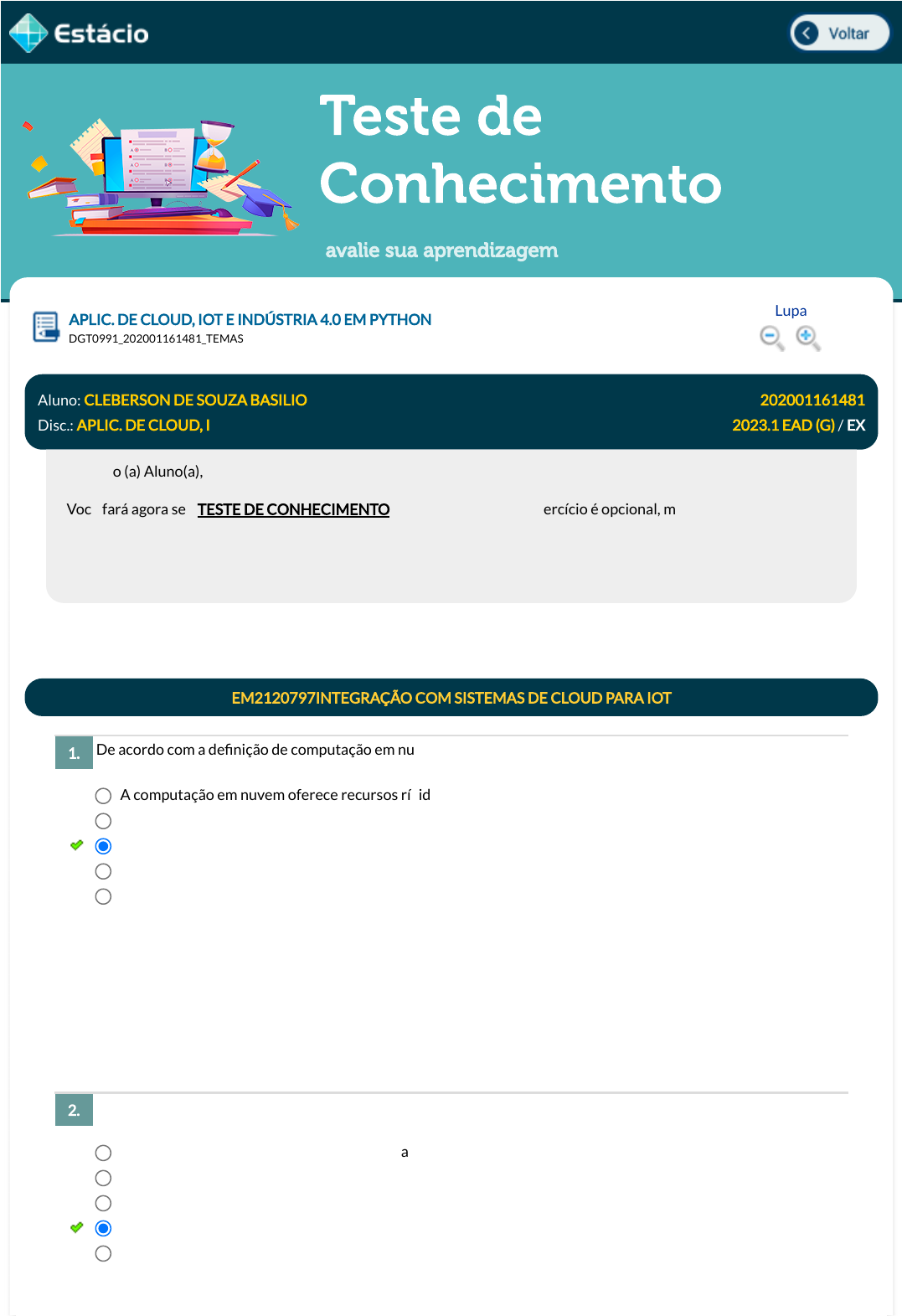 14/05/2023, 11:17 Estácio: Alunos https://simulado.estacio.br/alunos/ 1/5 Teste de Conhecimento avalie sua aprendizagem De acordo com a de�nição de computação em nuvem do NIST, marque a alternativa correta: Em relação às características de computação em nuvem, marque a alternativa correta. APLIC. DE CLOUD, IOT E INDÚSTRIA 4.0 EM PYTHON Lupa DGT0991_202001161481_TEMAS Aluno: CLEBERSON DE SOUZA BASILIO Matr.: 202001161481 Disc.: APLIC. DE CLOUD, I 2023.1 EAD (G) / EX Prezado (a) Aluno(a), Você fará agora seu TESTE DE CONHECIMENTO! Lembre-se que este exercício é opcional, mas não valerá ponto para sua avaliação. O mesmo será composto de questões de múltipla escolha. Após responde cada questão, você terá acesso ao gabarito comentado e/ou à explicação da mesma. Aproveite para se familiarizar com este modelo de questões que será usado na sua AV e AVS. EM2120797INTEGRAÇÃO COM SISTEMAS DE CLOUD PARA IOT 1. A computação em nuvem oferece recursos rígidos que não podem ser con�gurados. A computação em nuvem é um modelo que se contrapõe ao Big Data. A computação em nuvem é um modelo que permite o acesso onipresente. A computação em nuvem não permite o aprovisionamento rápido de recursos. A computação em nuvem requer contato estreito com os especialistas da plataforma. Data Resp.: 14/05/2023 10:19:37 Explicação: A resposta certa é: A computação em nuvem é um modelo que permite o acesso onipresente. 2. O cliente precisa prever com antecedência a necessidade de escalar seus recursos. Difícil acesso por causa da segurança instalada. Caracteriza-se por disponibilizar máquinas físicas dedicadas. Caracteriza-se pela capacidade de self-service. O faturamento é feito de acordo com o número de máquinas físicas dedicadas ao cliente. Data Resp.: 14/05/2023 10:19:48 javascript:voltar(); javascript:voltar(); javascript:diminui(); javascript:aumenta(); 14/05/2023, 11:17 Estácio: Alunos https://simulado.estacio.br/alunos/ 2/5 Qual sistema em cibersegurança é responsável por monitorar e registrar o comportamento em uma rede? Qual o princípio da Indústria 4.0 em que máquinas não dependem da interferência humana para funcionar e são capazes de tomar decisões automatizadas com base em dados de desempenho? Considere o protocolo HTTP/HTTPS. Qual das alternativas abaixo está incorreta? Explicação: A resposta certa é: Caracteriza-se pela capacidade de self-service. EM2120796PRINCÍPIOS E TECNOLOGIAS DA INDÚSTRIA 4.0 3. Sistema de desativação de serviços não seguros Sistema de �rewall Sistema de criptogra�a Sistema gerador de senhas Sistema de detecção de intrusão Data Resp.: 14/05/2023 10:20:12 Explicação: Resposta correta: Sistema de detecção de intrusão 4. Modularização. Descentralização. Automatização. Virtualização. Interoperabilidade. Data Resp.: 14/05/2023 10:21:39 Explicação: Resposta correta: Descentralização. EM2120795CONCEITOS DE INTERNET DAS COISAS 5. HTTP é considerado inseguro. É um protocolo que não guarda estados (stateless communication). Funciona por meio de requisições e respostas (requests, reponses) sob a camada TCP. O HTTPS é uma extensão de segurança do protocolo HTTP. Implementa �las por tópicos. Data Resp.: 14/05/2023 10:23:45 Explicação: 14/05/2023, 11:17 Estácio: Alunos https://simulado.estacio.br/alunos/ 3/5 Assinale a alternativa incorreta sobre a plataforma da Microsoft para IoT. Os modelos de Serviço na Nuvem tratam de diversos aspectos que são muito úteis para empresas que estão em diferentes momentos de maturidade de negócio. Um desses modelos é o CaaS (comunicação como um serviço). Nesse sentido, selecione a opção que relaciona CORRETAMENTE o CaaS com a categoria a que ele pertence: Existem diversas plataformas para desenvolvimento de projetos de IoT. Cada uma dessas plataformas possui características que vão desde o tempo de resposta a eventos, gerenciamento de dados, segurança e custos, que devem ser consideradas para a escolha de plataforma especí�ca. A ThingsBoard é uma dessas plataformas que, entre outras características, possui código aberto. Em relação à plataforma ThingsBoard, selecione a opção CORRETA: Resposta correta: Implementa �las por tópicos. 6. Não há limites para o número de dispositivos que pode gerenciar. É a plataforma líder de mercado e possui a maior variedade de oferta de serviços. O módulo DocumentDB armazena os metadados, enquanto o módulo LogicApp faz a integração com sistemas de backend. O módula IoT Hub suporta os protocolos de comunicação MQTT, HTTP/HTTPS e AMQP. A autenticação e a autorização são feitas pelo módulo active directory. Data Resp.: 14/05/2023 10:29:00 Explicação: Resposta correta: É a plataforma líder de mercado e possui a maior variedade de oferta de serviços. EM2120075PLATAFORMAS DE MIDDLEWARE E PROTOCOLOS DE COMUNICAÇÃO PARA IOT 7. PaaS: uma vez que, para que haja comunicação, é necessário que a plataforma esteja con�gurada. XaaS: pois generalizam os diversos modelos de serviço. SaaS: pois trata-se de um serviço de software. IaaS IoT: além da infraestrutura estar devidamente con�gura, ela também precisa estar habilitada para comunicar-se com dispositivos característicos de IoT. IaaS: dado que a infraestrutura base para que haja comunicação deve garantir a con�abilidade do processo. Data Resp.: 14/05/2023 10:30:44 Explicação: Resposta correta: XaaS: pois generalizam os diversos modelos de serviço. 8. É disponível para a maioria das distribuições do Linux, mas não para o Windows. Ela precisa de aplicações de terceiros para fazer a integração entre dispositivos e aplicações WEB. É uma plataforma do lado do servidor de código aberto que permite monitorar e controlar seus dispositivos IoT. É gratuito para uso pessoal, mas deve ser paga quando o uso for comercial. Utiliza os protocolos CoAP, XMPP, HTTP. Data Resp.: 14/05/2023 10:25:58 Expl