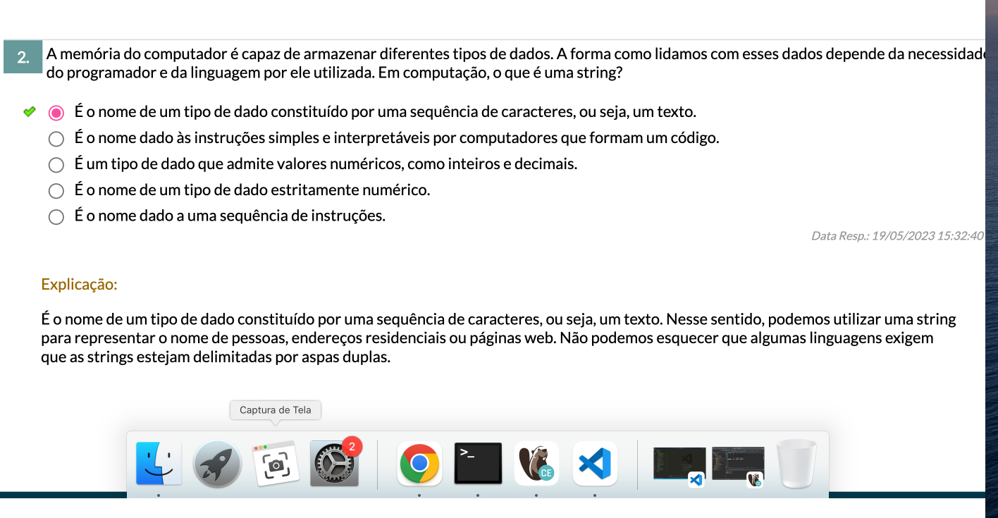 Uma string é um tipo de dado constituído por uma sequência de caracteres, ou seja, um texto. Uma string é o nome dado às instruções simples e interpretáveis por computadores que formam um código. Uma string é um tipo de dado que admite valores numéricos, como inteiros e decimais. Uma string é o nome de um tipo de dado estritamente numérico. Uma string é o nome dado a uma sequência de instruções. a) Apenas a afirmativa I está correta. b) Apenas as afirmativas I e II estão corretas. c) Apenas as afirmativas I e III estão corretas. d) Apenas as afirmativas I e V estão corretas. e) Todas as afirmativas estão incorretas.