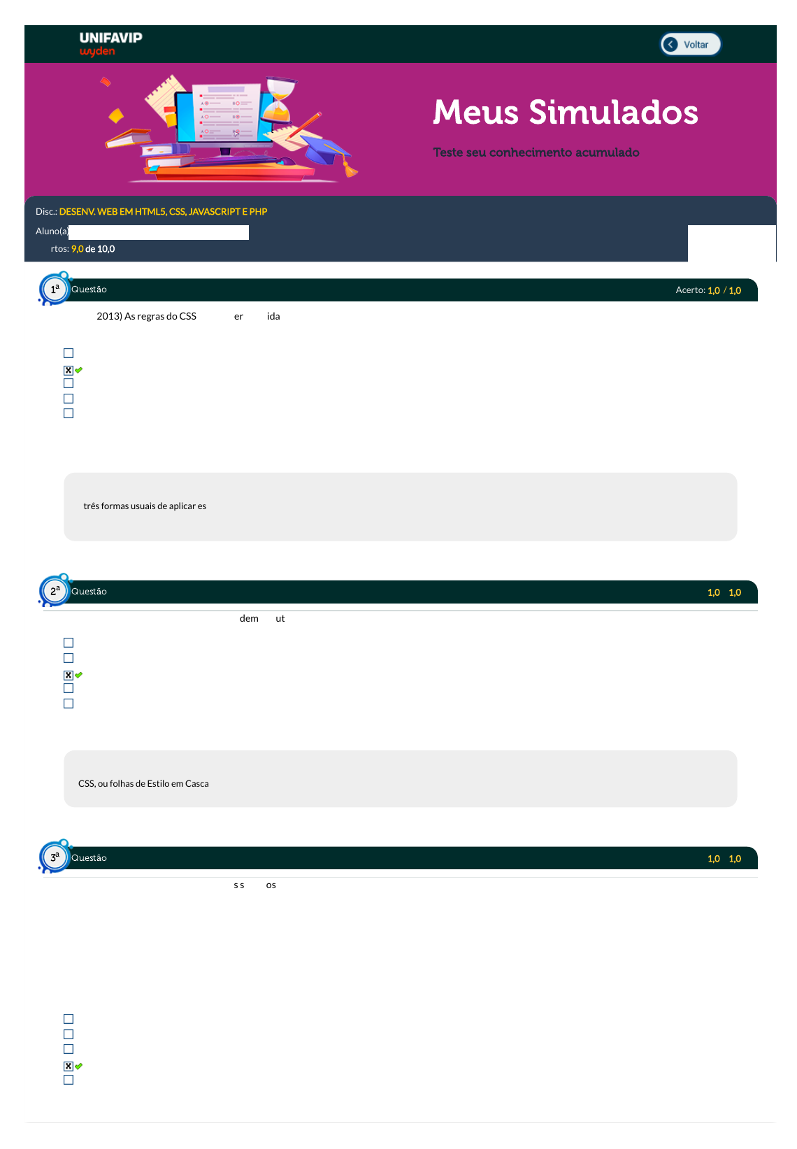 25/05/2023, 12:16 UNIFAVIP: Alunos https://simulado.wyden.com.br/bdq_simulados_avaliacao_parcial_resultado.asp?cod_hist_prova=309427619&cod_prova=6342887034&f_cod_di… 1/4 Meus Simulados Teste seu conhecimento acumulado Disc.: DESENV. WEB EM HTML5, CSS, JAVASCRIPT E PHP Aluno(a): AUGUSTO CESAR DE SOUZA SANTOS 202302048307 Acertos: 9,0 de 10,0 25/05/2023 Acerto: 1,0 / 1,0 (AOCP/2013) As regras do CSS podem ser de�nidas em alguns lugares diferentes em um documento HTML. Assinale a seguir a alternativa que descreve as formas onde podemos aplicar as formatações com CSS. No cabeçalho do documento HTML e dentro de cada tag HTML. Em um documento separado fora de todos os documentos HTML, no cabeçalho do documento HTML e dentro de cada tag HTML. Em um documento separado fora de todos os documentos HTML e no cabeçalho do documento HTML. Somente no cabeçalho do documento HTML. Em um documento separado fora de todos os documentos HTML, no cabeçalho do documento HTML, dentro de cada tag HTML e fora das tags HTML. Respondido em 25/05/2023 11:27:17 Explicação: Há três formas usuais de aplicar estilos em um documento HTML fazendo uso de CSS: Inline, Interna e Externa. CSS interna também chamada de CSS incorporada, é declarada na seção < head > do documento HTML. CSS externa onde os estilos são declarados em um arquivo externo, com extensão ".css" e vinculados ao documento HTML por meio da tag < link > ou da diretiva @import dentro da tag < head >. A forma CSS inline implica em declarar o estilo CSS diretamente na tag, no código HTML. Acerto: 1,0 / 1,0 (AOCP/2013 - Adaptada) HTML e CSS podem ser utilizados em conjunto. Qual a responsabilidade dos códigos CSS para uma aplicação web? O código CSS é responsável por prover o conteúdo da aplicação. O código CSS é responsável por processar conteúdos de downloads. O código CSS irá cuidar da formatação visual do conteúdo apresentado. O código CSS irá fazer chamadas assíncronas para o servidor. O código CSS é responsável por processar os dados no lado do servidor. Respondido em 25/05/2023 11:27:58 Explicação: A CSS, ou folhas de Estilo em Cascata (Cascading Style Sheets), é uma linguagem de estilo que fornece total controle sobre a apresentação de um documento escrito em HTML. Acerto: 1,0 / 1,0 Numa discussão entre os programadores sobre os conceitos de AJAX (Asynchronous JavaScript and XML), as seguintes a�rmações foram feitas: ( ) Permite atualizar dinamicamente o conteúdo, ou partes, de uma página Web. ( ) Embora usado no nome, a utilização da linguagem XML não é obrigatória. ( ) A XMLHttpRequest(XHR) é utilizada para enviar requisições pelo script para o lado client. Dê valores Verdadeiro (V) ou Falso (F) em cada a�rmação e identi�que a alternativa que apresenta a sequência correta (de cima para baixo): F - F - V F - F - F V - V - V V - V - F V - F - V Respondido em 25/05/2023 11:41:28 Questão1 a Questão2 a Questão3 a https://simulado.wyden.com.br/alunos/inicio.asp javascript:voltar(); 25/05/2023, 12:16 UNIFAVIP: Alunos https://simulado.wyden.com.br/bdq_simulados_avaliacao_parcial_resultado.asp?cod_hist_prova=309427619&cod_prova=6342887034&f_cod_di… 2/4 Explicação: A resposta correta é: V - V - F. O XMLHttpRequest permite a realização de requisições assíncronas a scripts do lado servidor. Acerto: 1,0 / 1,0 Analise o seguinte código escrito na linguagem JavaScript: banana | laranja | limao | uva | laranja | uva | laranja | uva | limao banana | uva | laranja | limao | uva | Respondido em 25/05/2023 11:53:38 Explicação: A resposta correta é: laranja | uva | O método shift remove um elemento do início do array. O splice é um método multiuso em JavaScript. Ele serve tanto para excluir elementos de um array como para substituir e inserir. Acerto: 1,0 / 1,0 (OBJETIVA/2021) Conforme BONATTI, sobre tecnologias e linguagens utilizadas na construção de websites, numerar a 2ª coluna de acordo com a 1ª e, após, assinalar a alternativa que apresenta a sequência CORRETA: (1) CSS. (2) PHP. (3) HTML. ( ) É uma linguagem de programação open source, que é interpretada pelo servidor, muito utilizada para o desenvolvimento de aplicações voltadas para a internet. ( ) Serve para promover o acabamento visual das páginas web. Pode ser compartilhado entre várias páginas, permitindo, assim, uma padronização visual muito simpli�cada e lógica. ( ) É uma linguagem de marcação, que é interpretada pelo browser para dar formatação e posicionamento ao conteúdo do website. 3 - 2 - 1. 2 - 1 - 3. 1 - 2 - 3. 2 - 3 - 1. 3 - 1 - 2. Respondido em 25/05/2023 11:55:56 Explicação: PHP é uma linguagem de programação open source, que é interpretada pelo servidor, muito utilizada para o desenvolvimento de aplicações voltadas para a internet. CSS é um mecanismo para adicionar estilo a um documento web. HTML é uma linguagem de marcação, que é interpretada pelo browser para dar formatação e posicionamento ao conteúdo do website. Acerto: 1,0 / 1,0 (Colégio Pedro II - 2016 - Colégio Pedro II - Professor - Ciência da Computação) O código de PHP abaixo insere dados em um banco de dados local MySQL, cujo usuário é root; a senha é mypsw e o nome do banco de dados, bdConcurso. Questão4 a Questão5 a Questão6 a 25/05/2023, 12:16 UNIFAVIP: Alunos https://simulado.wyden.com.br/bdq_simulados_avaliacao_parcial_resultado.asp?cod_hist_prova=309427619&cod_prova=6342887034&f_cod_di… 3/4 mysqli_select_db; localhost; bdConcurso; !mysqli_insert_db; $sql; mysqli_close; $con; mysqli_connect; localhost; bdConcurso; !mysqli_select_db; $sql; mysqli_close; $con; mysqli_connect; localhost; bdConcurso; !mysqli_query; $sql; close; $sql. mysqli_select_db; bdConcurso; localhost; !mysqli_query;$sql; mysqli_close; $sql; mysqli_connect; localhost; bdConcurso; !mysqli_query; $sql; mysqli_close; $con; Respondido em 25/05/2023 12:00:57 Explicação: A resposta correta é: mysqli_connect; localho
