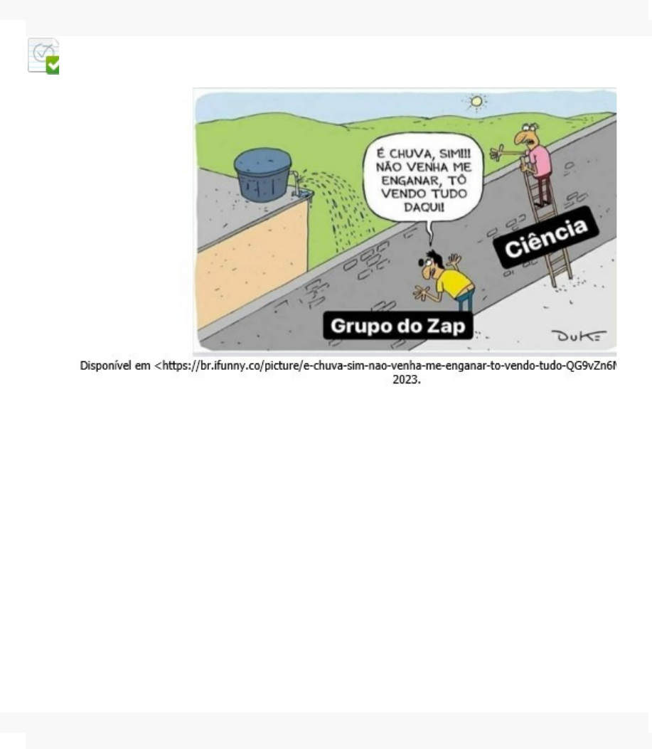 · Pergunta 1 0,5 em 0,5 pontos Leia a charge. Com base na leitura, avalie as asserções e a relação proposta entre elas. I. De acordo com a charge, o indivíduo que se informa somente por mensagens enviadas por redes sociais tem uma visão limitada e não verdadeira sobre os acontecimentos, sendo induzido a interpretações erradas. PORQUE 1. Apenas os cientistas têm discernimento sobre os fenômenos naturais e sociais, e a observação da realidade não é uma forma válida de conhecimento. Assinale a alternativa correta. Resposta Selecionada: c. A asserção I é verdadeira, e a II é falsa. 1. Pergunta 2 0,5 em 0,5 pontos Leia a charge, que faz o contraponto entre o filósofo Sócrates e um indivíduo contemporâneo que se informa pelas redes sociais. Com base na leitura, avalie as asserções e a relação proposta entre elas. I. A charge enaltece o interesse atual dos jovens pela informação e critica a falta de entusiasmo pelo conhecimento no período clássico da civilização grega. PORQUE II. O objetivo da charge é mostrar que a tecnologia permitiu a evolução do conhecimento e que, na “sociedade da informação”, somos mais sábios. A respeito dessas asserções, assinale a opção correta. Resposta Selecionada: e. As asserções I e II são falsas. 1. Pergunta 3 0,5 em 0,5 pontos Leia a tirinha. Com base na leitura, avalie as afirmativas. I. O posicionamento do personagem Pudim representa o comportamento de pessoas que se recusam a ver novas perspectivas. II. A tirinha valoriza a superioridade e a empatia decorrente dessa superioridade. III. O objetivo da tirinha é criticar o mau comportamento de crianças que buscam diversão com ações inadequadas. É correto o que se afirma apenas em Resposta Selecionada: a. I. 1. Pergunta 4 0,5 em 0,5 pontos Leia a tirinha e o texto. Lei torna mais severas as penas para crimes de intolerância religiosa Uma lei sancionada pelo presidente Luiz Inácio Lula da Silva (Lei Nº 14.532, de 11.01.2023) tornou mais severas as penas para crimes de intolerância religiosa. As religiões de matriz africana são o alvo mais frequente de quem não respeita a liberdade de crenças. Segundo dados do Ministério dos Direitos Humanos, só em 2022 foram 1.200 ataques – um aumento de 45% em relação a 2020. A lei sancionada, que equipara o crime de injúria racial ao crime de racismo, também protege a liberdade religiosa. A lei, agora, prevê pena de 2 a 5 anos para quem obstar, impedir ou empregar violência contra quaisquer manifestações ou práticas religiosas. A pena será aumentada de metade se o crime for cometido por duas ou mais pessoas, além de pagamento de multa. Antes, a lei previa pena de 1 a 3 anos de reclusão. A punição agora é a mesma prevista pelo crime de racismo, quando a ofensa discriminatória é contra grupo ou coletividade, pela raça ou pela cor. A expectativa é de que a nova lei ajude a punir quem comete crimes religiosos e ajude a proteger a vítima, que muitas vezes não encontra amparo quando tenta fazer uma denúncia. Disponível em <https://g1.globo.com/jornal-nacional/noticia/2023/01/18/lei-torna-mais-severas-as-penas-para-crimes-de- intolerancia-religiosa.ghtml>. Acesso em 26 jan. 2023. Com base na leitura, avalie as afirmativas. 4. Segundo o texto, cerca de 45% das vítimas da intolerância religiosa no Brasil são adeptas de religiões de matriz africana. 4. O racismo e a intolerância religiosa são formas de preconceito, que pode ser alimentado pelas relações sociais e pelas instituições, como mostram os quadrinhos. 4. A expectativa em torno da lei criada é que ela busque proteger todas as religiões com ações e gestos concretos que garantam o direito à liberdade de crença. É correto o que se afirma apenas em Resposta Selecionada: d. II e III. 1. Pergunta 5 0,5 em 0,5 pontos Leia o texto. Por que algumas pessoas são gênios esquecidos Diversos fatores psicológicos contribuem para que as pessoas atinjam níveis assombrosos de percepção e criatividade David Robson, BBC- 04/12/2022 No final dos anos 1920, um jovem de classe média conhecido como Ritty passava a maior parte do tempo mexendo no seu "laboratório", na casa dos pais em Rockaway, Nova York, nos Estados Unidos. O laboratório era uma velha caixa de madeira, equipada com prateleiras que continham uma bateria e um circuito elétrico com lâmpadas, chaves e resistores. Uma das suas invenções mais notáveis era um alarme doméstico contra intrusos que o alertava sempre que seus pais entrassem no seu quarto. Ele também usava um microscópio para estudar o mundo natural e, às vezes, levava seu conjunto de química para a rua, para fazer truques para as outras crianças. Mas o registro escolar de Ritty no ensino fundamental era comum. Ele tinha dificuldades com literatura e línguas estrangeiras. E, em um teste de QI quando criança, a pontuação dele teria sido de cerca de 125, que é acima da média, mas longe do espectro dos gênios. Na adolescência, Ritty demonstrou talento para a matemática e começou a estudar sozinho com livros elementares. No final do ensino médio, ele conseguiu o primeiro lugar no concurso anual de matemática do estado. Ritty é parte da história da Ciência. Ele tornou-se o físico Richard Feynman (1918-1988), vencedor do Prêmio Nobel em 1965. Sua teoria da eletrodinâmica quântica revolucionou o estudo das partículas subatômicas. Outros cientistas consideravam o funcionamento da mente de Feynman algo impenetrável. Para os colegas, ele parecia ter um talento quase sobrenatural, que levou o matemático polonês-americano Mark Kac a declarar, em sua autobiografia, que Feynman não era apenas um gênio comum, mas "um mágico do mais alto calibre". A psicologia moderna pode nos ajudar a decodificar essa magia e compreender, de forma mais geral, o que torna uma pessoa um gênio? A simples definição do termo já é uma dor de cabeça. Não existem critérios claros nem objetivos. Mas a maior part