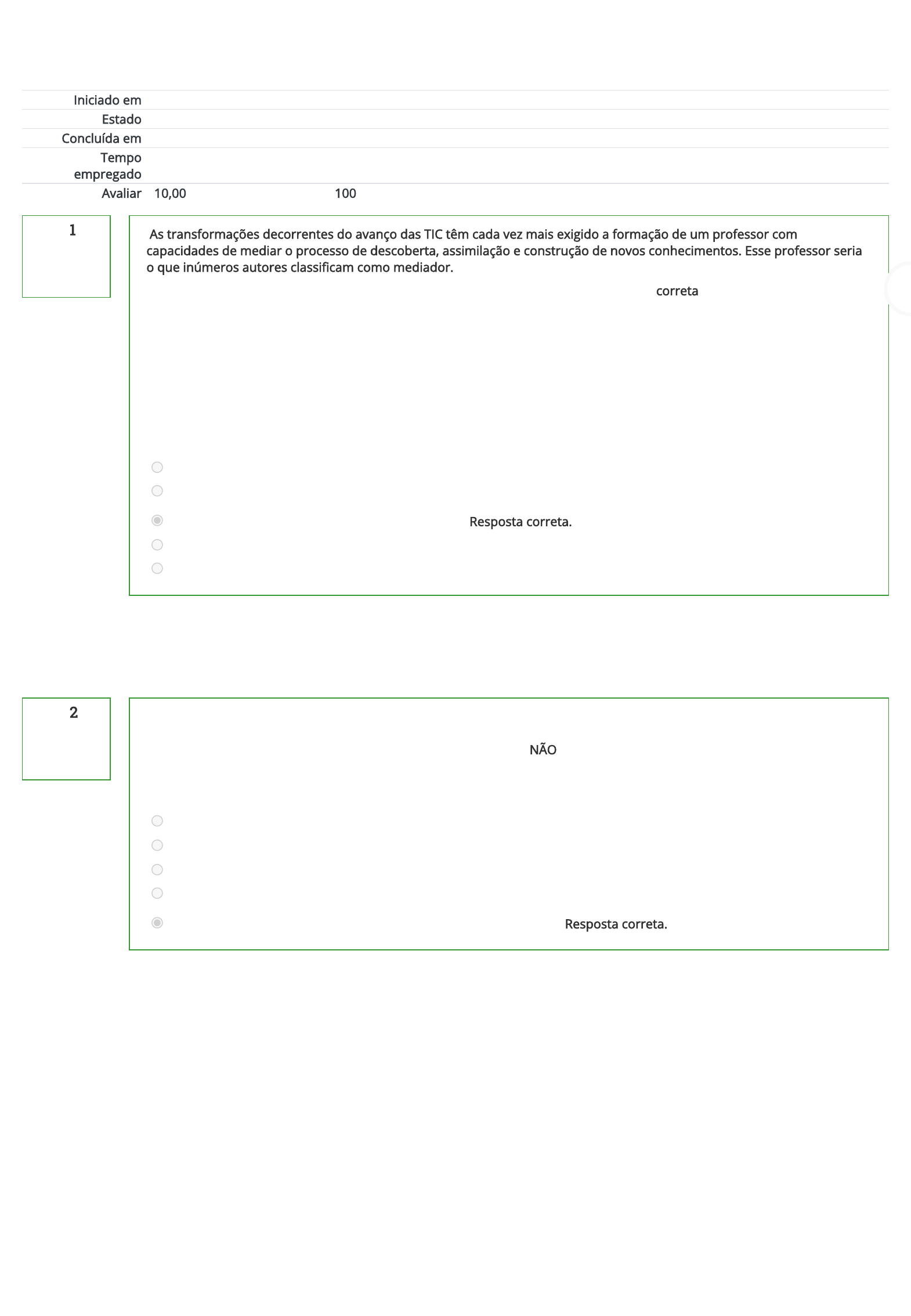 03/06/2023, 08:41 Avaliação Regular: Revisão da tentativa https://ava2.ifma.edu.br/mod/quiz/review.php?attempt=474364&cmid=80942 1/5 Página inicial Meus cursos História da Informática Educativa Avaliações Avaliação Regular Questão 1 Correto Atingiu 1,00 de 1,00 Questão 2 Correto Atingiu 1,00 de 1,00 Iniciado em sábado, 3 jun 2023, 08:31 Estado Finalizada Concluída em sábado, 3 jun 2023, 08:40 Tempo empregado 8 minutos 52 segundos Avaliar 10,00 de um máximo de 10,00(100%) As transformações decorrentes do avanço das TIC têm cada vez mais exigido a formação de um professor com capacidades de mediar o processo de descoberta, assimilação e construção de novos conhecimentos. Esse professor seria o que inúmeros autores classi�cam como mediador. Sobre mediação pedagógica, leia os postulados dados e, em seguida, assinale a opção correta. I. Uma prática, verdadeiramente mediadora, depende fundamentalmente dos meios tecnológicos, sem os quais se torna inviável o processo de interação. II. A mediação é a característica da interação especialmente na experiência de aprendizagem e na transmissão cultural. III. A mediação pedagógica não é possível em situações em que o professor utiliza técnicas didático-pedagógicas tradicionais. IV. O uso das TIC não garante a quali�cação da prática docente mediadora, podendo até mesmo ser um obstáculo a essa realização. Escolha uma opção: a. Apenas as a�rmativas III e IV estão corretas. b. Apenas as a�rmativas II e IV estão corretas c. Apenas as a�rmativas II e III estão corretas. Resposta correta. d. Apenas as a�rmativas I e III estão corretas. e. Todas as a�rmativas estão corretas. Sua resposta está correta. A resposta correta é: Apenas as a�rmativas II e III estão corretas. Desde os primórdios dos tempos o homem começou a inventar instrumentos que pudessem lhe facilitar a vida. A roda foi um destes inventos, carros de boi (usando a roda), as máquinas industriais (usando a roda e a “força” do boi), o avião e mais recentemente o computador. Dentre as opções abaixo qual NÃO se refere as necessidades que levaram o homem a criar o computador? Escolha uma opção: a. Armazenamento de grande quantidade de informações. b. O homem pensou em criar uma máquina que pudesse auxiliar e melhorar certos trabalhos. c. Rapidez na solução de problemas, geralmente cálculos complexos. d. Busca rápida. e. Aumento do número de pessoas para realizar um trabalho. Resposta correta. Sua resposta está correta. A resposta correta é: Aumento do número de pessoas para realizar um trabalho. https://ava2.ifma.edu.br/ https://ava2.ifma.edu.br/course/view.php?id=2320 https://ava2.ifma.edu.br/course/view.php?id=2320#section-3 https://ava2.ifma.edu.br/mod/quiz/view.php?id=80942 03/06/2023, 08:41 Avaliação Regular: Revisão da tentativa https://ava2.ifma.edu.br/mod/quiz/review.php?attempt=474364&cmid=80942 2/5 Questão 3 Correto Atingiu 1,00 de 1,00 Questão 4 Correto Atingiu 1,00 de 1,00 Questão 5 Correto Atingiu 1,00 de 1,00 Um marco na história da informática educativa no Brasil foi o I Seminário Nacional de Informática Educacional, em agosto de 1981, organizado por uma equipe intersetorial representada por integrantes da Secretaria Especial de Informática (SEI), do Ministério da Educação e Cultura (MEC), do Conselho Nacional de Desenvolvimento Cientí�co e Tecnológico (CNPq) e da Financiadora de Estudos e Projetos (Finep). A respeito desse Seminário, é correto a�rmar que: Escolha uma opção: a. Promoveu o I Concurso Nacional de Software Educacional. b. N.D.A c. Foi o primeiro fórum brasileiro a ressaltar a importância de se pesquisar o uso do computador como ferramenta auxiliar do processo de ensino-aprendizagem. Resposta correta. d. A partir desse evento, foi criado o PROINFO, que introduziu a informática educativa na rede pública de ensino. e. Destacou a importância da informática educacional brasileira seguir os padrões internacionais de controle e qualidade. Sua resposta está correta. A resposta correta é: Foi o primeiro fórum brasileiro a ressaltar a importância de se pesquisar o uso do computador como ferramenta auxiliar do processo de ensino-aprendizagem. Sobre os precursores na informatização da educação brasileira, podemos marcar como incorreta: Escolha uma opção: a. No regime militar, pós-1964, que orientou a política de informática e sua aplicação nos setores da economia e educação. b. No �nal da década de 1970 e princípios de 1980, surgiram experiências na UFRGS apoiadas nas teorias de Jean Piaget e nos estudos de Papert que exploravam a potencialidade do computador usando a Linguagem LOGO. c. Em agosto de 1981 e agosto de 1982 (CARNEIRO,2002), dois Seminários Nacionais de Informática na Educação constituíram importante passo na de�nição da política e da implantação do programa de informática na educação brasileira. Entre orientações levantadas nos seminários que ainda hoje conduzem as políticas públicas na área de informática. d. São as instâncias das escolas públicas e particulares que devem planejar e organizar ações de implementação para o uso de tecnologias da tecnologia da educação, de forma a atender os objetivos e fornecer os subsídios necessários para que tais objetivos sejam alcançados. Resposta correta. e. Outro marco importante que apresentou signi�cativas contribuições para a informática na educação brasileira foi um evento que ocorreu em Roma, Itália onde representantes de vários países, entre eles o Brasil, participaram da O�cina Intergovernamental para a Informática – IBI integrando grupos de re�exão sobre Informática e Educação. Sua resposta está correta. A resposta correta é: São as instâncias das escolas públicas e particulares que devem planejar e organizar ações de implementação para o uso de tecnologias da tecnologia da educação, de forma a a
