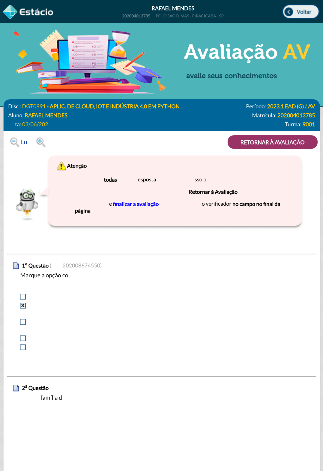 2. Caso você queira voltar à prova clique no botão "Retornar à Avaliação".