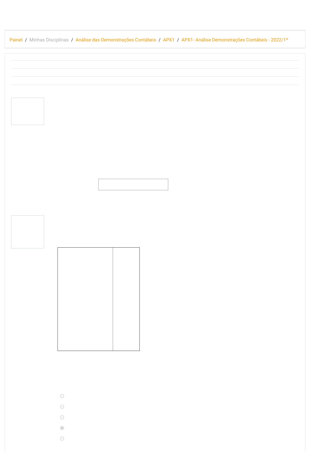 Painel / Minhas Disciplinas / Análise das Demonstrações Contábeis / APX1 / APX1- Análise Demonstrações Contábeis - 2022/1º Questão 1 Completo Não avaliada Questão 2 Completo Vale 0,50 ponto(s). Iniciado em sábado, 2 abr 2022, 00:11 Estado Finalizada Concluída em sábado, 2 abr 2022, 01:53 Tempo empregado 1 hora 42 minutos Termo de Conduta Declaro assumir o compromisso de confidencialidade e de sigilo escrito, fotográfico e verbal sobre as questões do exame ou avaliação pessoal que me serão apresentadas, durante o curso desta disciplina. Comprometo-me a não revelar, reproduzir, utilizar ou dar conhecimento, em hipótese alguma, a terceiros, e a não utilizar tais informações para gerar benefício próprio ou de terceiros. Reitero minha ciência de que não poderei fazer cópia manuscrita, registro fotográfico, filmar ou mesmo gravar os enunciados que me são apresentados. Declaro, ainda, estar ciente de que o não cumprimento de tais normas caracterizará infração ética, podendo acarretar punição de acordo com as regras da minha universidade. Dê seu ciente aqui: Ciente A empresa Parolin S/A apresentou, em suas Demonstrações Financeiras encerradas em 31/12/2012, os valores abaixo. Caixa e bancos Estoques Ativo circulante Imobilizado Intangível Ativo não circulante Ativo total Passivo circulante Passivo não circulante Patrimônio líquido Passivo total 20.000,00 30.000,00 50.000,00 15.000,00 5.000,00 20.000,00 70.000,00 40.000,00 25.000,00 5.000,00 70.000,00 Com base nesses dados, é correto afirmar que o departamento financeiro da empresa, ao calcular a liquidez, encontrará o seguinte índice: Escolha uma opção: a. 0,55. b. 0,71. c. 0,60. d. 1,25. e. 0,80. https://graduacao.cederj.edu.br/ava/my/ https://graduacao.cederj.edu.br/ava/course/view.php?id=15 https://graduacao.cederj.edu.br/ava/course/view.php?id=15§ion=2 https://graduacao.cederj.edu.br/ava/mod/quiz/view.php?id=317981 Questão 3 Completo Vale 0,50 ponto(s). Questão 4 Completo Vale 0,50 ponto(s). Os índices financeiros são importantes instrumentos gerenciais para uma boa gestão empresarial, que trazem uma análise dos dados das demonstrações contábeis. Dentre esses índices há o que mede a capacidade da empresa em honrar os seus pagamentos no curto prazo, usando apenas ativos que podem ser convertidos rapidamente em moeda. Este índice é definido como: Escolha uma opção: a. Liquidez Geral. b. Liquidez Corrente. c. Capital Circulante. d. Liquidez Seca. contas saldo (R$) prejuízos acumulados antes da DRE ?????? capital 44.000 gastos pré-operacionais 32.900 amortização acumulada do diferido 23.000 receitas de vendas 20.000 veículos 12.890 financiamento de longo prazo 12.000 compra de mercadorias 9.800 ações de controladas 9.000 estoque inicial de mercadorias 7.600 títulos a receber de longo prazo 5.000 empréstimos a pagar 4.000 estoque final de mercadorias 3.900 marcas 3.420 despesa de energia 3.200 fornecedores 3.200 contas a receber 3.000 despesa de salários 2.300 deduções da receita 2.000 salários e encargos a pagar 2.000 disponibilidades 1.900 provisões passivas 1.200 aplicações financeiras 1.200 impostos a recolher 900 despesas antecipadas de aluguel 900 outras cotas a receber 890 material de consumo 500 depreciação acumulada 500 despesa de licença de softwares 410 seguro sobre compras 400 despesas de manutenção 320 despesa de segurança eletrônica 190 Questão 5 Completo Vale 0,50 ponto(s). Questão 6 Completo Vale 0,50 ponto(s). Questão 7 Completo Vale 0,50 ponto(s). p g ç despesas financeiras 20 Com base no balancete de verificação apresentado acima, julgue o item subseqüente. O índice de liquidez imediata é menor que 0,4. Escolha uma opção: Verdadeiro Falso . A evolução das vendas de uma empresa apresentou o seguinte comportamento: T1 T2 T3 R$ 1.500.000,00 1.200.000,00 1.800.000,00 quantidades 300 300 420 A análise horizontal dessa série permite algumas conclusões. Acerca disso, assinale a alternativa correta. Escolha uma opção: a. Entre T1 e T2, houve valorização do preço das vendas. b. Houve barateamento das vendas entre T2 e T3. c. Tomando-se como base T1, é correto afirmar que o índice correspondente às quantidades cresceu o dobro do índice representativo dos valores em T3. d. Supondo-se que a inflação entre T1 e T2 tenha sido de 20%, é correto afirmar que houve queda real das vendas de 50%. e. Tomando-se por base T1, o índice correspondente aos valores será negativo em T2. Tendo em vista que, na avaliação de uma empresa, além dos dados econômicos e financeiros que integram as demonstrações contábeis, outras informações de mercado e informações não financeiras devem ser levadas em conta, julgue o item seguinte. I - A análise vertical efetua comparativos entre os períodos de tempo, ao passo que a análise horizontal se preocupa com o comparativo de itens no mesmo período de análise. Escolha uma opção: Verdadeiro Falso Uma empresa possui um capital circulante líquido de $ 950,00, passivo circulante de $ 2.500 e estoque de $ 1.100. Qual é seu índice de liquidez corrente? E seu índice de liquidez seca? ILC = 1,38 ILS = 0,94 Questão 8 Completo Vale 0,50 ponto(s). Questão 9 Completo Vale 0,50 ponto(s). Com base no balanço patrimonial em 31 de dezembro de 2013, bem como nas informações adicionais fornecidas, conforme a seguir, responda à questão. Ativo Circulante R$ Passivo Circulante R$ Caixa Bancos Aplicações financeiras Contas a receber de clientes Estoques Demais contas a receber Ativo não circulante Títulos a receber Investimentos Ativo Imobilizado Depreciação Acumulada Intangíveis 5.000,00 20.000,00 35.000,00 78.000,00 95.000,00 15.000,00 248.000,00 18.000,00 80.000,00 119.000,00 (24.000,00) 20.000,00 213.000,00 461.000,00 Fornecedores Empréstimos e financiamentos Impostos a recolher Salários a pagar Contas a pagar Passivo Não Circulante Empréstimos e financiamentos LP Contas a pagar d