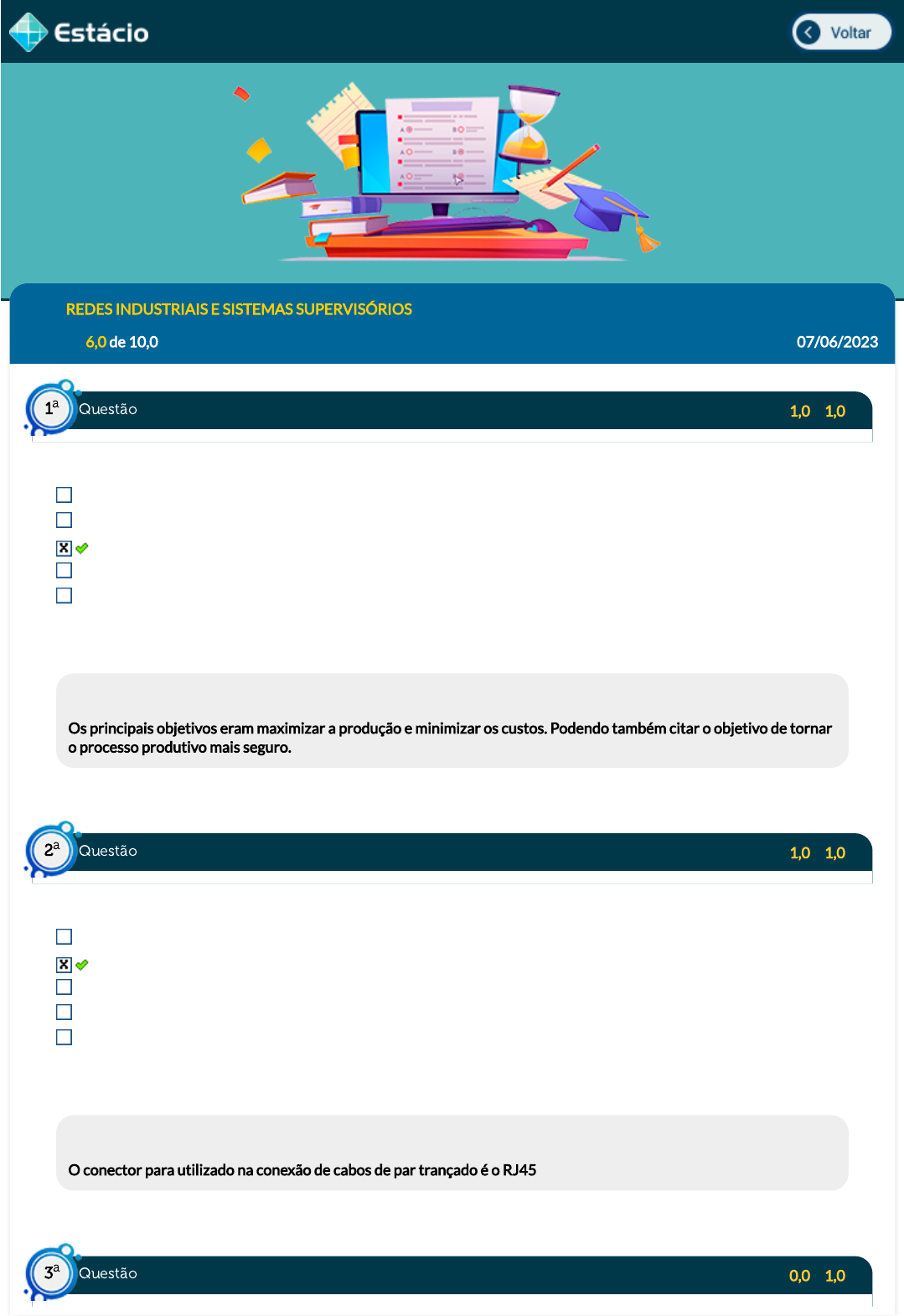 Disc.: REDES INDUSTRIAIS E SISTEMAS SUPERVISÓRIOS Acertos: 6,0 de 10,0 07/06/2023 Acerto: 1,0 / 1,0 Os sistemas de controle de processo foram criados com o objetivo de: Maximizar o uso da mão de obra Reduzir o uso de sistemas industriais Maximizar a produção e minimizar os custos Reduzir o número de processos simpli�cando a produção Minimizar os danos ambientais Respondido em 07/06/2023 13:19:41 Explicação: Os principais objetivos eram maximizar a produção e minimizar os custos. Podendo também citar o objetivo de tornar o processo produtivo mais seguro. Acerto: 1,0 / 1,0 Qual o conector mais utilizado para conexão de cabos de par trançado? P10 RJ45 P2 RJ11 BNC Respondido em 07/06/2023 13:20:03 Explicação: O conector para utilizado na conexão de cabos de par trançado é o RJ45 Acerto: 0,0 / 1,0 Questão1 a Questão2 a Questão3 a https://simulado.estacio.br/alunos/inicio.asp javascript:voltar(); Qual tipo de equipamento é utilizado para adaptação do padrão RS-485 de forma balanceada para níveis TTL? CI-TTL CI-485 MAX-485 TTL converter Resistores Respondido em 07/06/2023 13:20:38 Explicação: Para a adaptação do padrão RS-485 de forma balanceada para níveis TTL são utilizados dispositivos como o MAX-485 Acerto: 1,0 / 1,0 Em qual protocolo se baseia a World Wide Web? HTTP (HyperText Transfer Protocol) IP (Internet Protocol) ISO (Internatinoal Standard Organization) DNS (Domain Name Service) OSI (Open System Interconection) Respondido em 07/06/2023 13:21:13 Explicação: O protocolo é o HTTP. Posteriormente também foi desenvolvido o HTTPS, uma versão do HTTP que permite que os dados sejam enviados criptografados e que se solicite a autenticidade do servidor e do cliente através de certi�cados digitais. Acerto: 1,0 / 1,0 No protocolo HART os bits são transferidos na forma de modulação do sinal em frequência, sendo 2400 Hz a frequência para o bit 0 e qual frequência para o bit 1? 1200 Hz 2400 Hz 3600 Hz 240 Hz 100 Hz Respondido em 07/06/2023 13:21:40 Acerto: 1,0 / 1,0 Qual ano surgiu o protocolo PROFBUS? 1990 Questão4 a Questão5 a Questão6 a 1988 1980 1987 2000 Respondido em 07/06/2023 13:22:00 Explicação: O protocolo PROFBUS surgiu em 1987 Acerto: 0,0 / 1,0 Qual o tamanho de cada pacote de dados em uma rede ControlNet? 5,1 Bytes 51 MBytes 510 Bytes 0,51 MBytes 51 Bytes Respondido em 07/06/2023 13:22:30 Acerto: 0,0 / 1,0 Qual resolução que de�ne que ¿todas as partes de um sistema interativo (de software ou hardware) que fornecem informações e controle necessários para que o usuário realize uma determinada tarefa com o sistema interativo¿? ISO 9001-110 DCE 0538 NCE 2246 ISO 9241-110 DCE 7542 Respondido em 07/06/2023 13:23:01 Explicação: A resolução é a ISSO 9241-110 Acerto: 0,0 / 1,0 Os sistemas supervisórios são comumente denominados de sistemas: SWIITCH ROTEADORES Questão7 a Questão8 a Questão9 a GATEWAY WEB SCADA Respondido em 07/06/2023 13:23:18 Acerto: 1,0 / 1,0 Qual das opções abaixo não corresponde a uma vantagem do uso do OCP? Facilitar o acesso a sensores Acesso distribuído e remoto através do DCOM Existência de uma única API para todos os servidores de OCP, de modo a que o código de uma aplicação cliente possa ser reutilizado em qualquer dispositivo Identi�car os servidores que podem disponibilizar aos clientes determinados itens OPC Oportunidade para desenvolver aplicações clientes em ambientes de desenvolvimento que utilizem COM e ActiveX, tais como Visual Basic, Visual C++ e Excel Respondido em 07/06/2023 13:23:46 Explicação: A única das a�rmativas abaixo que não corresponde a uma das vantagens é facilitar o acesso a sensores Questão10 a