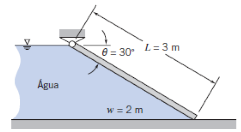 Exerćıcio Avaliativo 2 Mecânica dos Fluidos Prof.: Felipe Augusto Rocha da Silva Nome: Questão 1 Uma comporta plana, de espessura uniforme, suporta uma coluna de água conforme mostrado. Determine o peso mı́nimo da comporta necessário para mantê-la fechada. 1 Questão 2 A comporta parabólica mostrada na figura tem 2 metros de largura e é articulada em O; c = 0, 25 m–1, D = 2 m e H = 3 m. Determine: a) o módulo e a linha de ação da força vertical sobre a comporta causada pela água b) a força horizontal aplicada em A requerida para manter a com- porta em equiĺıbrio c) a força vertical aplicada em A requerida para manter a comporta em equiĺıbrio 2 Questão 3 Água escoa em regime permanente através de um tubo de comprimento L e raio R = 75 mm. Calcule a velocidade de entrada uniforme, U, se a distribuição de velocidade através da sáıda é dada por u = umax [ 1 − r 2 R2 ] e umax = 3m/s. 3 Questão 4 A velocidade média do escoamento em regime permanente em A e B é aquela indicada na figura. Determine a velocidade média em C. Os tubos possuem áreas transversais de AA = AC = 0, 1m 2 e AB = 0, 2m 2. 4 Questão 5 Considere o escoamento incompresśıvel e permanente através do dispositivo mostrado. Determine o módulo e o sentido da vazão volumétrica através da porta 3. 5
