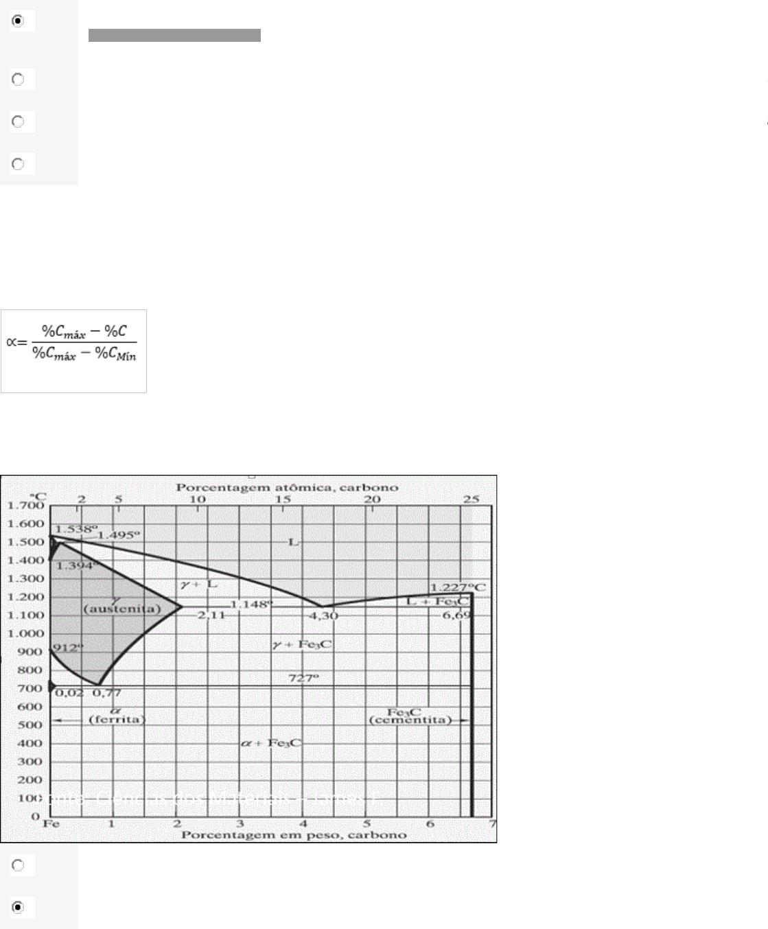 TENT 1 Questão 1/10 - Tecnologia dos Materiais Latão é uma liga de cobre e zinco tendo teores de zinco que variam de 5% a 50%. Possui estrutura CFC, devido a matriz de cobre, com Zinco sendo introduzido como inclusão substitucional. Como o zinco interfere nas propriedades do cobre ? A Diminui sua resistência a corrosão, diminui sua condutibilidade térmica e elétrica, e aumenta sua resistência mecânica. Você assinalou essa alternativa (A) B Aumenta sua resistência a corrosão, diminui sua condutibilidade térmica e elétrica, e diminui sua resistência mecânica. C Diminui sua resistência a corrosão, aumenta sua condutibilidade térmica e elétrica, e aumenta sua resistência mecânica. D Diminui sua resistência a corrosão, diminui sua condutibilidade térmica e elétrica, e diminui sua resistência mecânica. Questão 2/10 - Tecnologia dos Materiais Usando o diagrama de fases abaixo, lembrando que o teor mínimo de carbono na liga é de 0,005%C, determinar a procentagem de fases do aço do tipo ASTM 1037. A 68% de ferrita e 32% de perlita B 52% de ferrita e 48% de perlita Você assinalou essa alternativa (B) C 32% de ferrita e 68% de perlita D 48% de ferrita e 52% de perlita Questão 3/10 - Tecnologia dos Materiais Com base nas curvas TTT e CCT apresentadas abaixo, a velocidade que a liga eutetóide levará para ser resfriado de 730°C até 50°C, para garantir que tenha apenas martensita na estrutura final, é: A V < 140°C/s . B V ≥≥ 140ºC/s . Você assinalou essa alternativa (B) C 140ºC/s > V ≥≥ 30ºC/s D V < 30ºC/s Questão 4/10 - Tecnologia dos Materiais Com relação ao diagrama de fases da liga Pb Sn abaixo, sabendo que a liga tem um teor de 18%Sn a 50%Sn, se for necessário obter uma liga mais rígida, para ser usada em soldas de tubos, será recomendada: A Uma liga com 25% Sn, pois terá 75% de fase alfa. Você assinalou essa alternativa (A) B Uma liga com 30%Sn, pois terá 31% de fase beta. C Uma liga com 35%Sn, pois terá 64% de fase alfa. D Uma liga com 40%Sn, pois terá 41% de fase beta. Questão 5/10 - Tecnologia dos Materiais Curvas CCT (Transformações a Resfriamento Contínuo) são curvas que se inserem nas curvas TTT, representando transformações de fases para meios com diversas velocidades de resfriamento. Quanto maior o ângulo de inclinação da curva CCT, mais lento é o resfriamento. Nas curvas CCT se inserem duas novas fases que só ocorrem nas ligas ferrosas devido a choques térmicos nas estruturas cristalinas, que são a bainita e a martensita. Com relação a estas fases: A São fases dúcteis e de alta maleabilidade e resistência ao impacto. Bainita é a estrutura formada por um resfriamento rápido, de tal forma que parte dos cristais cúbicos da perlita sofrem deformação, passando de cúbicas para hexagonais compactas. A martensita é uma estrutura na qual há uma total clivagem da estrutura cristalina da perlita, que passa totalmente de cúbica para hexagonal compacta. B São fases duras e de baixa maleabilidade e resistência ao impacto. Bainita é a estrutura formada por um resfriamento rápido, de tal forma que parte dos cristais cúbicos da perlita sofrem deformação, passando de cúbicas para hexagonais compactas. A martensita é uma estrutura na qual há uma total clivagem da estrutura cristalina da perlita, que passa totalmente de cúbica para hexagonal compacta. Você assinalou essa alternativa (B) C São fases duras e de baixa maleabilidade e resistência ao impacto. Bainita é a estrutura formada por um resfriamento rápido, de tal forma há uma total clivagem da estrutura cristalina da perlita, passando de cúbicas para hexagonais compactas. A martensita é uma estrutura na qual que parte dos cristais cúbicos da perlita sofrem deformação, passando de cúbica para hexagonal compacta. D São fases dúcteis e de alta maleabilidade e resistência ao impacto. Bainita é a estrutura formada por um resfriamento rápido, de tal forma há uma total clivagem da estrutura cristalina da perlita, passando de cúbicas para hexagonais compactas. A martensita é uma estrutura na qual que parte dos cristais cúbicos da perlita sofrem deformação, passando de cúbica para hexagonal compacta. Questão 6/10 - Tecnologia dos Materiais Usando o diagrama de fases abaixo, lembrando que o teor mínimo de carbono na liga é de 0,005%C, determinar a procentagem de fases do aço do tipo ASTM 1050. A 42% de ferrita e 58% de perlita B 35% de ferrita e 65% de perlita Você assinalou essa alternativa (B) C 58% de ferrita e 42% de perlita D 65% de ferrita e 35% de perlita Questão 7/10 - Tecnologia dos Materiais Com base nas curvas TTT e CCT apresentadas abaixo, temos que: A Uma velocidade de resfriamento superior a 140°C/s irá gerar uma estrutura final composta por Martensita e Perlita. B Um tempo de resfriamento de 750°C até a temperatura ambiente de 1000 s leva a uma estrutura composta por Perlita. Você assinalou essa alternativa (B) C Uma velocidade de resfriamento entre 140°C/s e 35°C/s leva a uma estrutura composta por Perlita. D Um tempo de resfriamento de 750°C até a temperatura ambiente de 10 s leva a uma estrutura composta por Martensita. Questão 8/10 - Tecnologia dos Materiais Com relação as estruturas cristalinas de aços, as mesmas são responsáveis pela dureza e resistência mecânica, dentre outras propriedades das ligas. Assim, é importante saber o empacotamento e o número de átomos equivalentes em função da estrutura cristalina. Com relação as estruturas cristalinas dos aços, temos que: A A estrutura CCC possui 4 átomos por célula unitária e fator de empacotamento 0,68. A estrutura CFC possui 4 átomos por célula unitária e fator de empacotamento 0,74. A estrutura hexagonal compacta tem 6 átomos por célula unitária e fator de empacotamento 0,68. B A estrutura CCC possui 2 átomos por célula unitária e fator de empacotamento 0,68. A estrutura CFC possui 4 átomos por célula unitária e fator d