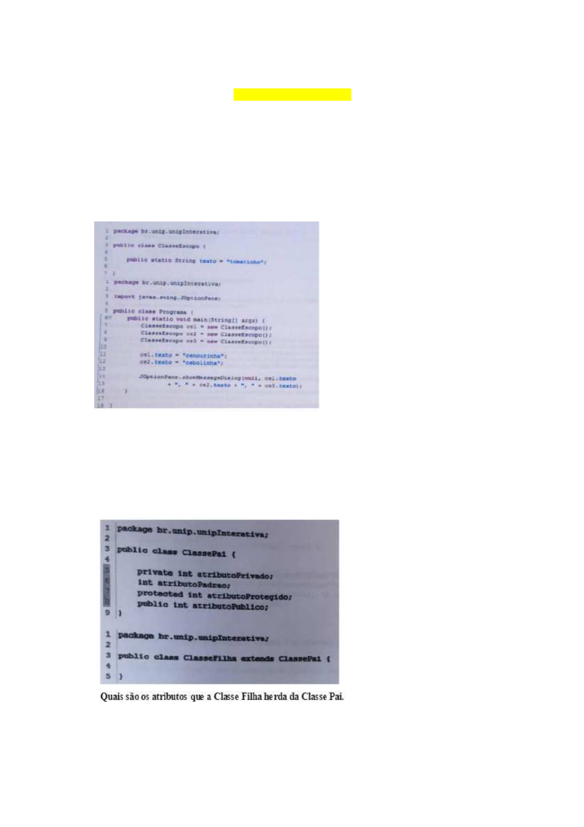 Impresso por Zet, E-mail arthurnunesp18@gmail.com para uso pessoal e privado. Este material pode ser protegido por direitos autorais e não pode ser reproduzido ou repassado para terceiros. 08/10/2022 11:26:12 Compilado – Tópicos Especiais de Programação Orientada a Objetos - UNIP Elaborado por Bortolotti Atualizado em 30/10/2019 – v1 Questões de Múltipla Escolha Pergunta: Considere as seguintes classes: Assinale a alternativa que apresenta a saída correta gerada quando o programa é executado: Resposta: A) Cenourinha, cebolinha, tomatinho. Pergunta: Considere as seguintes classes: Resposta: atributoPadrao, atributoProtegido, atributoPublico Impresso por Zet, E-mail arthurnunesp18@gmail.com para uso pessoal e privado. Este material pode ser protegido por direitos autorais e não pode ser reproduzido ou repassado para terceiros. 08/10/2022 11:26:12 Compilado – Tópicos Especiais de Programação Orientada a Objetos - UNIP Elaborado por Bortolotti Atualizado em 30/10/2019 – v1 Pergunta: Considere as seguintes classes: Resposta: D) atributoProtegido e atributoPublico Pergunta: Considere as seguintes classes: Resposta: E) O método não apresenta erros e imprime os dados de um objeto da Classe Roupa. Impresso por Zet, E-mail arthurnunesp18@gmail.com para uso pessoal e privado. Este material pode ser protegido por direitos autorais e não pode ser reproduzido ou repassado para terceiros. 08/10/2022 11:26:12 Compilado – Tópicos Especiais de Programação Orientada a Objetos - UNIP Elaborado por Bortolotti Atualizado em 30/10/2019 – v1 Pergunta: Considere as duas classes em Java abaixo: Resposta: B) O código está correto e ira exibir “Olá mundo de novo”. Pergunta: Considere o seguinte código em Java e julgue as afirmativas abaixo: Resposta: E) Apenas uma afirmativa esta correta. Impresso por Zet, E-mail arthurnunesp18@gmail.com para uso pessoal e privado. Este material pode ser protegido por direitos autorais e não pode ser reproduzido ou repassado para terceiros. 08/10/2022 11:26:12 Compilado – Tópicos Especiais de Programação Orientada a Objetos - UNIP Elaborado por Bortolotti Atualizado em 30/10/2019 – v1 Pergunta: Considere o seguinte programa e julgue as afirmativas abaixo: Resposta: A) Apenas I e II estão corretas. Pergunta: Considere o seguinte código em Java e julgue as afirmativas abaixo: Resposta: B) Apenas II e III estão corretas. Impresso por Zet, E-mail arthurnunesp18@gmail.com para uso pessoal e privado. Este material pode ser protegido por direitos autorais e não pode ser reproduzido ou repassado para terceiros. 08/10/2022 11:26:12 Compilado – Tópicos Especiais de Programação Orientada a Objetos - UNIP Elaborado por Bortolotti Atualizado em 30/10/2019 – v1 Pergunta: Considere o seguinte programa Resposta: D) O programa irá apresentar a mensagem “A soma dos dois números é 35”. Pergunta: Considere o seguinte programa Resposta: E) O código não apresenta erros. Pergunta: Considere o seguinte trecho de código em Java: Resposta: A) O código está correto e irá exibir o valor 2.0 Impresso por Zet, E-mail arthurnunesp18@gmail.com para uso pessoal e privado. Este material pode ser protegido por direitos autorais e não pode ser reproduzido ou repassado para terceiros. 08/10/2022 11:26:12 Compilado – Tópicos Especiais de Programação Orientada a Objetos - UNIP Elaborado por Bortolotti Atualizado em 30/10/2019 – v1 Pergunta: Qual das alternativas abaixo apresenta uma declaração correta de um array? Resposta: E) Int [] I = new int [5]; Pergunta: Assinale a alternativa correta sobre Intent em aplicativos Android Resposta: É um mecanismo que permite que o aplicativo se comunique com o sistema operacional e com outros aplicativos. Pergunta: Assinale a alternativa correta sobre Services em aplicativos Android: Resposta: B) É um componente que permite que o aplicativo realize tarefas em segundo plano. Pergunta: Julgue as afirmativas abaixo sobre o desenvolvimento de aplicativos para Android: Resposta: B) Apenas II e III estão corretas. Pergunta: Assinale a alternativa correta sobre o Broadcast Receivers em aplicativos Android. Resposta: D) São mecanismos que permitem que o aplicativo receba informações do sistema operacional (como bateria fraca e fone de ouvido conectado), assim como informações de outros aplicativos. Pergunta: Assinale a alternativa correta sobre views em aplicativos Android. Resposta: C) São componentes de interface gráfica que podem ser adicionados a uma activity. Impresso por Zet, E-mail arthurnunesp18@gmail.com para uso pessoal e privado. Este material pode ser protegido por direitos autorais e não pode ser reproduzido ou repassado para terceiros. 08/10/2022 11:26:12 Compilado – Tópicos Especiais de Programação Orientada a Objetos - UNIP Elaborado por Bortolotti Atualizado em 30/10/2019 – v1 Pergunta: Assinale a alternativa correte sobre o conceito de escopo de membros de classe: Resposta: E) Escopo indica se o membro (atributo ou método) pertence a classe ou aos seus objetos. A situação padrão é o escopo de objeto e não é indicado por qualquer anotação. Já o escopo de classe e indicado pela palavra reservada static. Pergunta: Quando precisamos utilizar valores de tipos números, é valido afirmar que: Resposta: A) podemos armazenar o valor de uma variável de menor capacidade em outra de maior capacidade. Pergunta: Julgue as afirmativas abaixo sobre as interfaces gráficas em Java: Resposta: D) Todas estão corretas. Pergunta: Assinale a alternativa correta: Resposta: B) Um método construtor pode ter ou não ter parâmetros. Impresso por Zet, E-mail arthurnunesp18@gmail.com para uso pessoal e privado. Este material pode ser protegido por direitos autorais e não pode ser reproduzido ou repassado para terceiros. 08/10/2022 11:26:12 Compilado – Tópicos Especiais de Programação Orientada a Objetos - UNIP Elaborado por Bortolotti Atualizado em 30/10/2019 – v1 Pergunta: Assinale