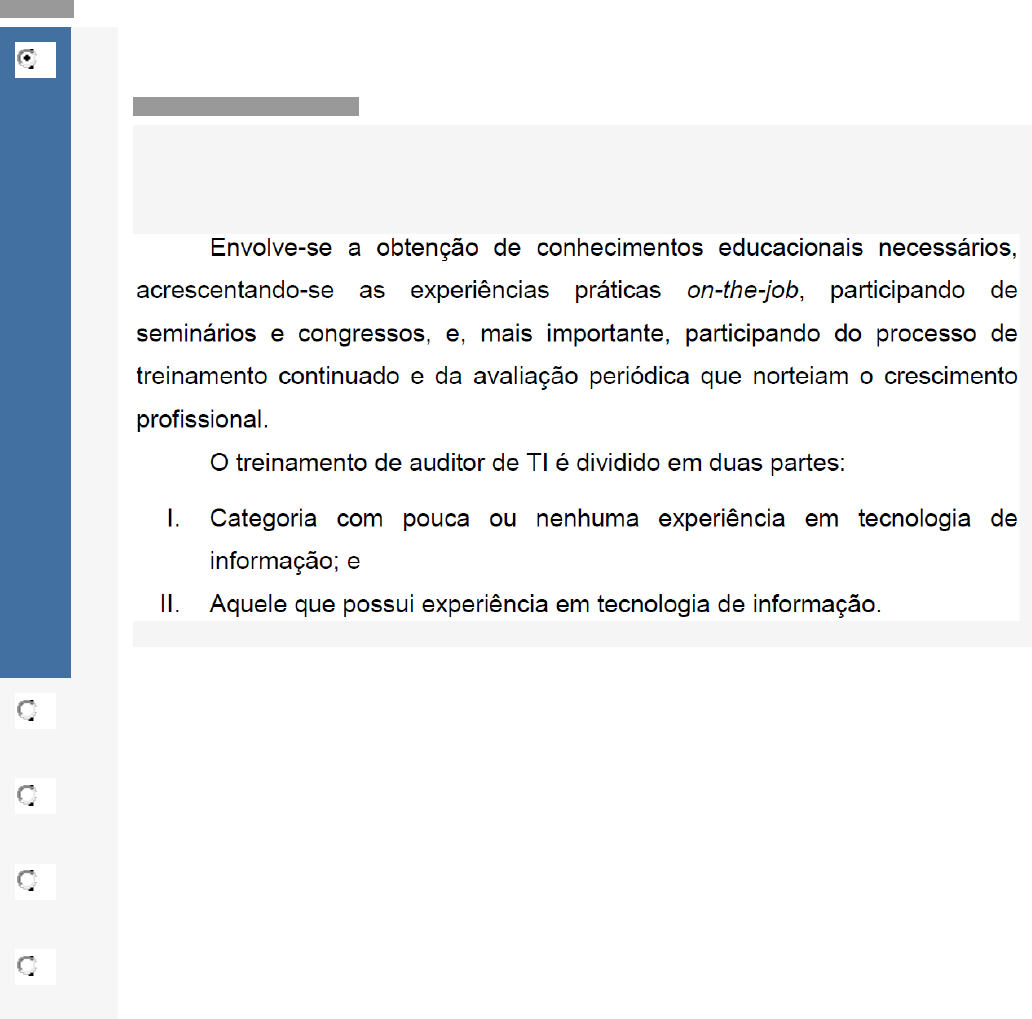 Questão 1/5 - Auditoria de Sistemas No Texto da Aula 2 (página 5/19) - TEMA 2 – TREINAMENTO E CAPACITAÇÃO PARA FORMAÇÃO DE MÃO DE OBRA, apresenta-se que "Envolve-se a obtenção de conhecimentos educacionais necessários, acrescentando-se as experiências práticas on-the-job, participando de seminários e congressos, e, mais importante, participando do processo de treinamento continuado e da avaliação periódica que norteiam o crescimento profissional" O treinamento de auditor de TI é dividido em duas partes. São elas: Analise as alternativas a seguir e assinale a alternativa com a resposta CORRETA Nota: 20.0 A I. Categoria com pouca ou nenhuma experiência em tecnologia de informação; II. Aquele que possui experiência em tecnologia de informação. Você assinalou essa alternativa (A) Você acertou! Texto da Aula 2 (página 5/19) - TEMA 2 – TREINAMENTO E CAPACITAÇÃO PARA FORMAÇÃO DE MÃO DE OBRA B I. Categoria de inexperientes em gestão de ativos; II. Categoria de Experts em auditoria C I. Categoria de iniciantes em técnicas de inspeção; II. Categoria dos veteranos em perícia técnica e contábil D I. Categoria "novatos" em processos de investigação; II. Categoria "experientes" perícia técnica e contábil E I. Categoria de trainee em investigação e perícia forense; II. Categoria de seniors em perícia técnica e contábil Questão 2/5 - Auditoria de Sistemas Na Aula 1 - tema 4: Roteiro e planejamento para elaboração, (página 11/18 do texto da aula) o autor Dutra (2017) apresenta que o processo de organização dos trabalhos de auditoria de sistemas de informações segue a norma de execução de trabalhos do auditor, o principal componente das normas de auditoria geralmente aceitas. Essa norma contempla: Analise as alternativas e assinale a alternativa com a resposta CORRETA Nota: 20.0 A planejamento de auditoria, avaliação de riscos de auditoria, supervisão e controle de qualidade. Você assinalou essa alternativa (A) Você acertou! página 11/18 do texto da aula 1 - tema 4: Roteiro e planejamento para elaboração, B Negociação de Valores com o Cliente e os Prazos de realização/entrega da auditoria C Análise detalhada dos equipamentos e dispositivos utilizados na organização/empresa D Validação dos dados compartilhados entre as diversas ferramentas (apps) E Análise dos Softwares (Programas, Apps, etc), Hardwares (Dispositivos, Periféricos, Componentes, Etc) e Conectividade da Corporação Questão 3/5 - Auditoria de Sistemas São apresentadas, nos Slides e demais materiais da Aula 1, as Definições de auditoria de sistema. Analise as Definições de auditoria de sistema a seguir: I - Exame analítico, minucioso, de investigação e validação de um sistema, atividade ou informação II - A palavra auditar é originária do latim de auditu, ou seja, saber por ouvir. III - Auditoria não significa ouvir, é uma técnica da organização. IV - Auditoria define-se como "um ramo de estudo das ciências de negócios, que avalia determinadas informações com o objetivo de trazer maior eficácia e eficiência, seguindo princípios e normas com aplicações próprias e direcionando a entidade a melhores resultados" Considerando os conteúdos ministrados na Aula 1 responda: Assinale a alternativa com a resposta CORRETA Nota: 20.0 A Apenas as Alternativas I e II são CORRETAS B As Alternativas I, II e III são CORRETAS C Apenas as Alternativas I e IV são CORRETAS D As Alternativas I, II e IV são CORRETAS Você assinalou essa alternativa (D) Você acertou! Slide 8/37 - Aula 1 O Item III está INCORRETO E Apenas as Alternativas III e IV são CORRETAS Questão 4/5 - Auditoria de Sistemas É Apresentada no Slide 12/28 da Aula 2 uma visão piramidal e global de desenvolvimento de carreira de um auditor de tecnologia de informações. Foram classificados em cinco níveis os planos de desenvolvimento de carreira do auditor de TI. Analise a figura a Seguir e complete com os 5 (cinco) níveis: Analise as alternativas a seguir e assinale a alternativa com a resposta CORRETA Nota: 20.0 A Nível 5, para os sócios. Nível 4, para os gerentes de auditoria. Nível 3, para os seniores e supervisores. Nível 2, para os assistentes de auditoria. Nível 1, básico para os trainees. Você assinalou essa alternativa (A) Você acertou! Slide 12/28 - Aula 2 B Nível 5, básico para os trainees. Nível 4, para os gerentes de auditoria. Nível 3, para os seniores e supervisores. Nível 2, para os assistentes de auditoria. Nível 1, para os sócios. C Nível 5, básico para os trainees. Nível 4, para os seniores e supervisores. Nível 3, para os assistentes de auditoria. Nível 2, para os gerentes de auditoria. Nível 1, para os sócios. D Nível 5, básico para os trainees. Nível 4, para os gerentes de auditoria. Nível 3, para os assistentes de auditoria. Nível 2, para os seniores e supervisores. Nível 1, para os sócios. Questão 5/5 - Auditoria de Sistemas Na aula 1 são apresentados/definidos os Objetivos globais de auditoria Na página 6/18 do texto da Aula 1, (Imoniana, 2016) e (Lyra, 2015) apresentam/destacam alguns objetivos. Segundo o conteúdo do Texto e dos Slides da Aula 1, São Objetivos globais de auditoria: Assinale a Alternativa com a resposta CORRETA Nota: 20.0 A integridade, confidencialidade, privacidade, acuidade, disponibilidade, auditabilidade, versatilidade e manutenabilidade. Você assinalou essa alternativa (A) Você acertou! Página 6/18 do Texto da Aula 1 ou Slides 13 a 19 da Aula 1 B Rastreabilidade, Sigilo, privacidade, assiduidade, disponibilidade, auditabilidade, versatilidade e manutenabilidade. C Atualidade, Conectividade, Velocidade, Sigilo, assiduidade, manutenabilidade. D Funcionalidade, Sensibilidade, Sigilo, assiduidade, disponibilidade, auditabilidade, versatilidade e manutenabilidade. E Velocidade, confidencialidade, privacidade, acuidade, Desempenho, auditabilidade, versatilidade e manutenabilidade.