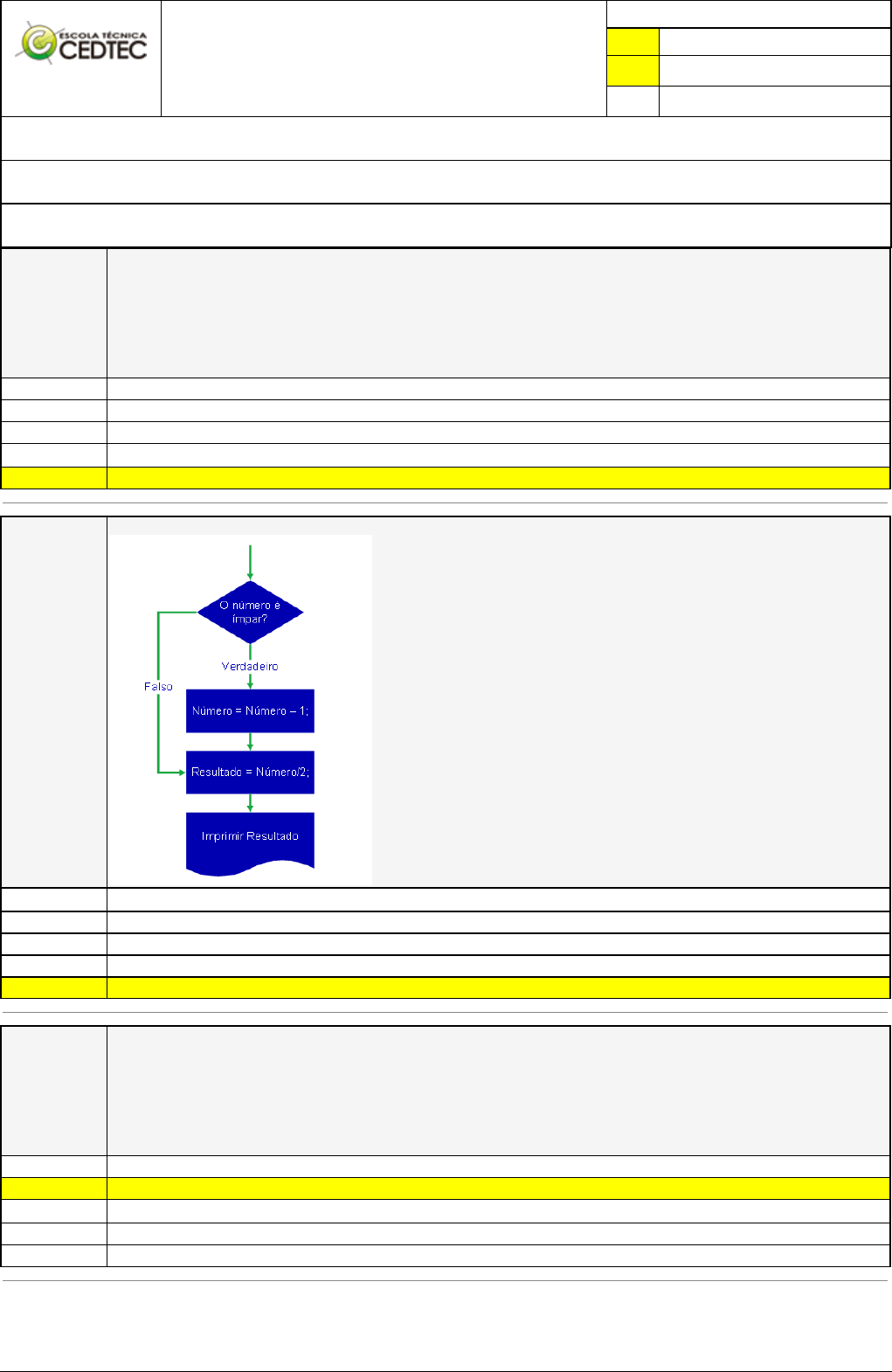 Pincel Atômico - 29/06/2023 23:09:44 1/2 GUTIERRE LOPES KLEIN Exercício Caminho do Conhecimento - Etapa 8 (21120) Atividade finalizada em 25/06/2023 23:55:45 (848852 / 2) LEGENDA Resposta correta na questão # Resposta correta - Questão Anulada X Resposta selecionada pelo Aluno Disciplina: CONTROLADOR LÓGICO PROGRAMÁVEL [469568] - Avaliação com 4 questões, com o peso total de 13,00 pontos [capítulos - 112] Turma: Curso Técnico: Eletrotécnica - Grupo: EAD - JUNHO/22 - EAD ELE [68219] Aluno(a): 91328088 - GUTIERRE LOPES KLEIN - Respondeu questões corretas, obtendo um total de 0,00 pontos como nota [350096_126985] Questão 001 No fim do código abaixo valor armazenado na variável “Resultado” será: inteiro x, y, i, resultado; x = 3; y = 2; resultado = x*(y+5); para (i=0;i<3; i=i+1) resultado = resultado-1; fim para 20 11 21 X 24 18 [350096_126970] Questão 002 O diagrama abaixo demonstra uma lógica de decisão, qual das alternativas representa um comportamento adequado da lógica? X Se “Número” tiver um valor inicial de 10, o resultado que será apresentado será 4,5. Se “Número” tiver um valor inicial de 11, o resultado que será apresentado será 6. Se “Número” tiver um valor inicial de 10, o resultado que será apresentado será 4. Se “Número” tiver um valor inicial de 11, o resultado que será apresentado será 5,5. Se “Número” tiver um valor inicial de 11, o resultado que será apresentado será 5. [350096_126979] Questão 003 No fim do código abaixo valor armazenado na variável “Resultado” será: inteiro x, y, resultado; x = 3; y = 2; resultado = (x*y)+5; se (resultado < 10) resultado =19; fim se 15 11 X 9 21 19 Pincel Atômico - 29/06/2023 23:09:44 2/2 [350097_126993] Questão 004 Considere o diagrama abaixo e assuma que todas as entradas estão sendo ligados por botões normalmente abertos (NA), assim, é correto afirmar que a saída F é ENERGIZADA quando: X Os botões ligados às entradas A e B estão sendo acionados. Os botões ligados às entradas D e E estão sendo acionados. Os botões ligados às entradas B e E estão sendo acionados. Os botões ligados às entradas B e C estão sendo acionados. Os botões ligados às entradas A e C estão sendo acionados.