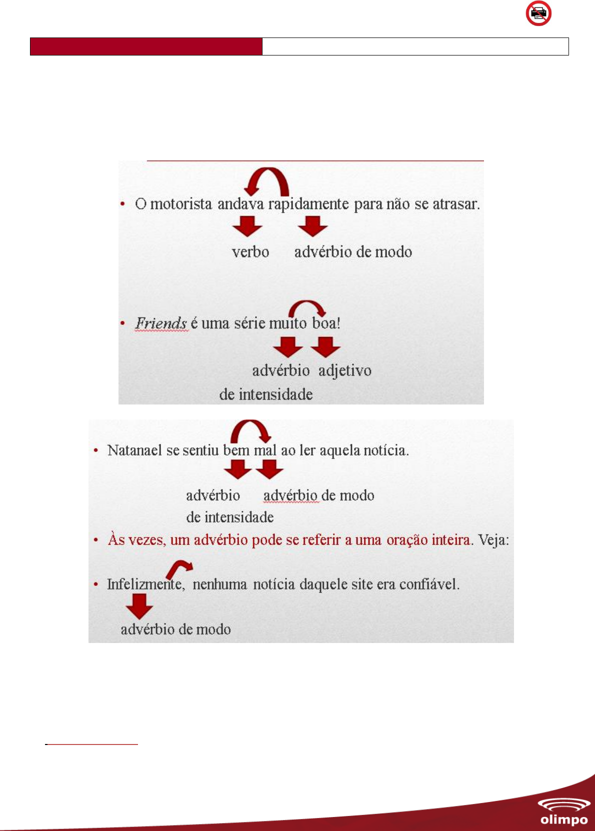 A impressão deste material não é obrigatória. APOSTILA SOBRE ADVÉRBIO 7° ANO – GRAMÁTICA – PROF. LORNA O ADVÉRBIO Palavra invariável que denota uma circunstância e que modifica o sentido de um verbo, de um adjetivo ou de outro advérbio. Às vezes, o advérbio pode modificar também uma oração inteira. Exemplos: LOCUÇÃO ADVERBIAL Conjunto de duas ou mais palavras que exercem a função do advérbio. Exemplos: a) De vez em quando, Neyla gosta de ficar sozinha. A impressão deste material não é obrigatória. Locução adverbial temporal / de tempo = circunstância b) Vire à direita para fazer o retorno. Locução adverbial de lugar = circunstância c) Adair vai a pé para o trabalho. Locução adverbial de meio = circunstância d) Minha amiga não falaria isso de jeito nenhum! Locução adverbial de negação = circunstância e) Escrevia com giz as respostas dos alunos. Locução adverbial de instrumento = circunstância f) Com muito cuidado, o perito verificava as provas. Locução adverbial de modo = circunstância VALORES SEMÂNTICOS DOS ADVÉRBIOS E LOCUÇÕES ADVERBIAIS Os advérbios e as locuções adverbiais são classificados de acordo com seu valor semântico, isto é, com o sentido que apresentam ou a circunstância que indicam. Algumas ideias, circunstâncias, noções, valores semânticos que os advérbios e as locuções adverbiais podem indicar: Valores semânticos Advérbios ou locuções adverbiais 1. Tempo hoje, ontem, anteontem, amanhã, primeiramente, imediatamente, antigamente, provisoriamente, sucessivamente, constantemente, atualmente, brevemente, sempre, nunca, jamais, cedo, tarde, antes, depois, logo, já, agora, em breve, nunca mais, hoje em dia, de tarde, à tarde, à noite, à noitinha, ao pôr do sol, de manhã, de noite, por ora, por fim, de repente, de vez em quando, a tempo, às vezes, etc. 2. Modo bem, mal, assim, melhor, pior, depressa, devagar, às pressas, às claras, às cegas, à toa, à vontade, às escondidas, aos poucos, desse jeito, desse modo, dessa maneira, frente a frente, lado a lado, de cor, em vão e a maior parte dos que terminam em "-mente": calmamente, tristemente, propositadamente, pacientemente, amorosamente, docemente, escandalosamente, bondosamente, generosamente; ao léu, em vão, em geral, passo a passo, por acaso, etc. 3. Lugar aqui, antes, dentro, ali, adiante, fora, acolá, atrás, além, lá, detrás, cá, acima, perto, aí, abaixo, longe, externamente, à distância de, de longe, de perto, em cima, à direita, à esquerda, ao lado, em volta, de dentro, de cima, por ali, por perto, por fora, por dentro, etc. 4. Dúvida acaso, porventura, possivelmente, provavelmente, quiçá, talvez, casualmente, quem sabe, por certo, etc. A impressão deste material não é obrigatória. 5. Afirmação sim, certamente, realmente, decerto, efetivamente, certo, decididamente, deveras, indubitavelmente, com certeza, sem dúvida, por certo, etc. 6. Negação não, nem, nunca, jamais, de modo algum, tampouco, de jeito nenhum, de forma alguma, de modo algum, de forma nenhuma, etc. 7. Intensidade muito, demais, pouco, tão, bastante, mais, menos, demasiado, quanto, quão, tanto, nada, todo, quase, de todo, de muito, por completo, extremamente, intensamente, grandemente, bem (quando aplicado a propriedades graduáveis), em excesso, por inteiro, etc. 8. Instrumento com lápis, com a pá, com a tesoura, com uma caneta, etc. 9. Companhia junto com, na companhia de, com sua prima, contigo, comigo, com os amigos, etc. 10. Meio (de transporte) a pé, de ônibus, de carro, de moto, de patins, de bicicleta, de metrô, de trem, etc. 11. Assunto sobre, a respeito de, de, a respeito de futebol, sobre seu passado, etc. 12. Interrogativos onde? aonde? donde? quando? como? por que? EXEMPLOS: 1. Tempo • Amanhã, Cleonice começará a trabalhar em uma nova empresa. • As mudanças devem ser feitas imediatamente. • Desde os tempos mais remotos, os homens são caçadores. 2. Modo • Mirabel estava andando depressa por causa do horário. • O meliante escalou o muro calmamente e saiu correndo entre as casas. 3. Lugar • Minha casa fica logo ali. • Nas vielas escuras do bairro, dezenas de ratos passeiam sem que nenhuma alma viva os atrapalhe. 4. Dúvida • Talvez Ademilton vá ao banco. • Quiçá chova hoje. • Meu filho provavelmente fará o Enem. 5. Afirmação • Certamente viajaremos no fim do ano. • Ela irá sim ao nosso encontro. 6. Negação • Jamais repita isso! A impressão deste material não é obrigatória. • De jeito nenhum que Mariana aceitaria uma coisa assim. 7. Intensidade • Irineu gosta muito de Carmelita. • A atriz Gal Gadot é tão linda! 8. Instrumento • Acabei de me cortar com essa tesoura. • O assassino matou sua vítima com uma faca. 9. Companhia • Irei ao cinema com uns amigos, mãe. • Saiu com um desconhecido e nunca mais voltou. 10. Meio • Voltamos de trem para Paris. • Todos dos dias milhares de brasileiros vão de ônibus ao trabalho. • Fomos a pé buscar nossa encomenda. 11. Assunto • Não gosto muito dele. Ele só conversa sobre astronomia! 12. Advérbios interrogativos: Os advérbios onde, quando, como e por que são empregados nas orações interrogativas diretas e indiretas, indicando, respectivamente, lugar, tempo, modo e causa. Gente, onde está o material da pesquisa? Advérbio de lugar Gente, gostaríamos de saber onde está o material da pesquisa. Como ficarão férias? Advérbio de modo. Digam-me como ficarão as férias. Quando iremos viajar para a Suíça? Advérbio de tempo Desejamos saber quando iremos viajar para a Suíça. Por que não deixam o menino em paz? Advérbio de causa. Quero saber por que não deixam o menino em paz. OBSERVAÇÃO FLEXÃO DO ADVÉRBIO Alguns advérbios admitem a variação em grau. Os advérbios flexionam em dois graus: o comparativo e o superlativo. Grau comparativo: Acontece quando o advérbio expressa uma circunstância de comparação. Po