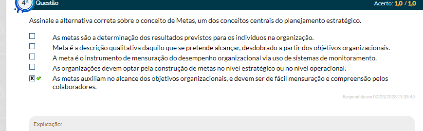 Assinale a alternativa correta sobre conceito de Metas, um dos conceitos centrais do planejamento estratégico. As metas são a determinação dos resultados previstos para os indivíduos na organização. Meta é a descrição qualitativa daquilo que se pretende desdobrado a partir dos objetivos organizacionais. A meta é instrumento de mensuração do desempenho organizacional via uso de sistemas de monitoramento. As organizações devem optar pela construção de metas no nível estratégico ou no nível operacional. As metas auxiliam no alcance dos objetivos e devem ser de fácil mensuração e compreensão.