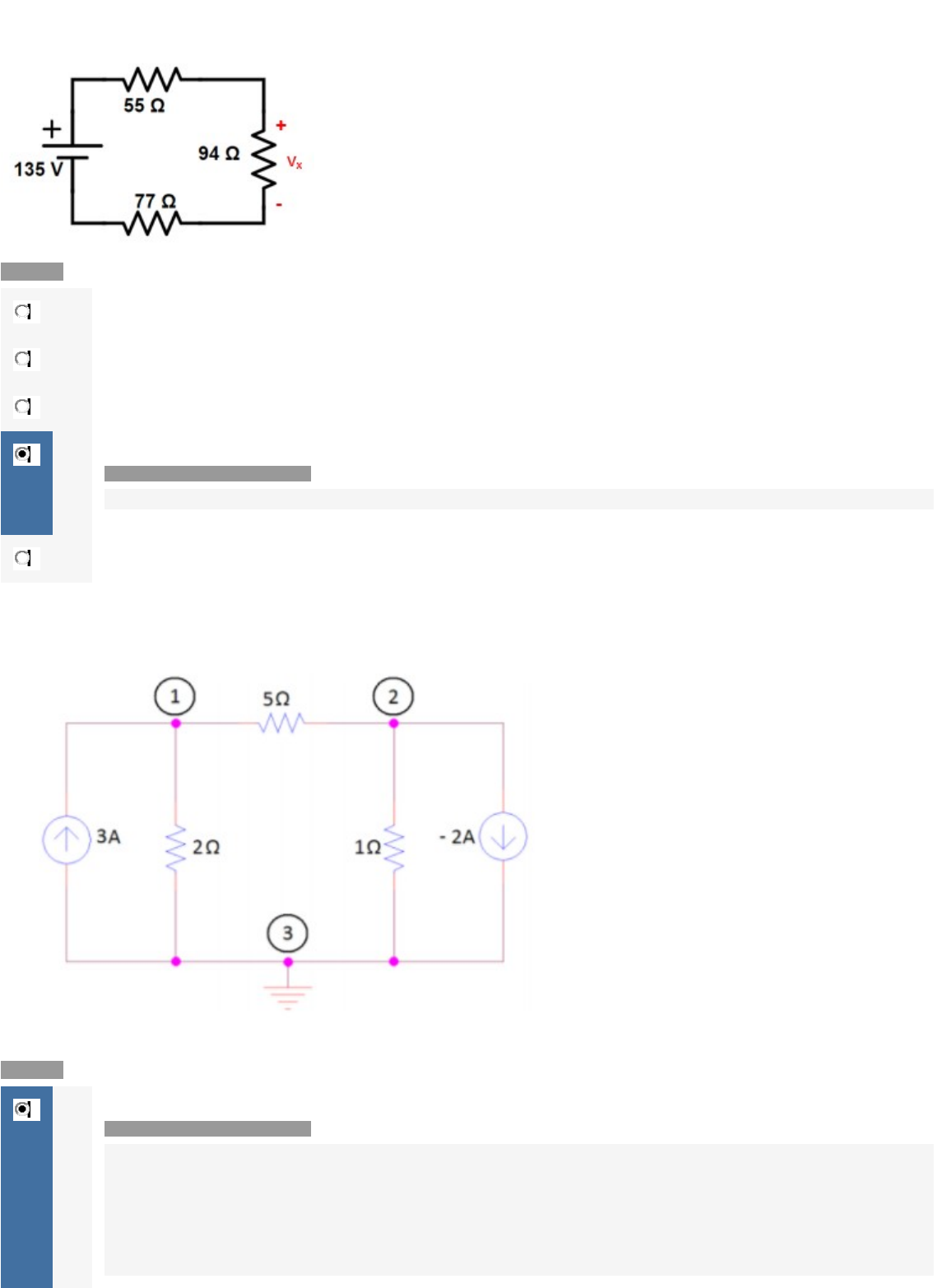 Questão 1/10 - Circuitos Elétricos (Eletricidade) Calcule a tensão vx aplicada ao resistor de 94 ΩΩ. Nota: 10.0 A 32,85 V B 40,2 V C 45,99 V D 56,15 V Você assinalou essa alternativa (D) Você acertou! E 70,8 V Questão 2/10 - Circuitos Elétricos (Eletricidade) Considere o circuito apresentado e resolva-o através da análise nodal. Calcule a tensão no Nó 1 (V1) e Nó 2 (V2) sabendo-se que a tensão no Nó 3 = 0 V. Nota: 10.0 A V1 = 5 V e V2 = 2,5 V Você assinalou essa alternativa (A) Você acertou! Nó 1: 0,5.V1+0,2(V1-V2)-3=0 Nó 2: 1.V2+0,2(V2-V1)-2=0 Logo: 0,7.V1-0,2.V2=3 -0,2.V1+1,2.V2=2 V1=5 V e V2=2,5 V B V1 = 5 V e V2 = 7,5 V C V1 = 2,5 V e V2 = 5 V D V1 = 25 V e V2 = 30 V E V1 = 100 V e V2 = 12 V Questão 3/10 - Circuitos Elétricos (Eletricidade) Calcule a corrente i1 do circuito. Nota: 10.0 A 1,96 A Você assinalou essa alternativa (A) Você acertou! Aplicando o divisor de corrente: I1=I.ReqR1=10.0,98.1035.103=1,963A�1=�.����1=10.0,98.1035.103=1,963� B 2,04 A C 2,58 A D 3,76 A E 5,45 A Questão 4/10 - Circuitos Elétricos (Eletricidade) Calcular o valor da corrente ix no circuito abaixo utilizando a análise nodal por meio do cálculo das tensões dos nós (V1 e V2). Assinale a alternatia correta. Nota: 10.0 A ix = -2 A. B ix = -1 A. C ix = 0 A. D ix = 1 A. E ix = 2 A. Você assinalou essa alternativa (E) Você acertou! Questão 5/10 - Circuitos Elétricos (Eletricidade) Dado o circuito abaixo, determine a resistência equivalente entre os pontos A e D: Para esta resolução, utilize a transformação estrela-triângulo. Nota: 10.0 A Req = 25,58 ΩΩ B Req = 38,82 ΩΩ Você assinalou essa alternativa (B) Você acertou! C Req = 40,23 ΩΩ D Req = 41,25 ΩΩ E Req = 50,56 Ω Questão 6/10 - Circuitos Elétricos (Eletricidade) Considerando o nó representado pela imagem a seguir, determine a intensidade da corrente ix. Considere i1=10 A, i2=20 A e i3=12 A e i4=8 A. Nota: 10.0 A ix=52 A. Você assinalou essa alternativa (A) Você acertou! B ix=-52 A. C ix=12 A. D ix=-12 A. E ix=-60 A. Questão 7/10 - Circuitos Elétricos (Eletricidade) Calcular a tensão vx no circuito abaixo utilizando o método das correntes de malha. Assinale a alternativa correta. Nota: 10.0 A vx = -1 V. B vx = 1 V. C vx = -1,538 V. Você assinalou essa alternativa (C) Você acertou! D vx = 1,538 V. E vx = 0 V. Questão 8/10 - Circuitos Elétricos (Eletricidade) Calcular as tensões dos nós do circuito a seguir utilizando a análise nodal. Nota: 10.0 A V1 = 11,05 V e V2= 8,42 V B V1 = 11,05 V e V2= -8,42 V C V1 = 25,1 V e V2= 12,7 V Você assinalou essa alternativa (C) Você acertou! D V1 = 25,1 V e V2= -12,7 V E V1 = 12,7 V e V2= 25,1 V Questão 9/10 - Circuitos Elétricos (Eletricidade) Calcule a tensão vx aplicada ao resistor de 77 Ω.Ω. Nota: 10.0 A 32,85 V B 40,2 V C 45,99 V Você assinalou essa alternativa (C) Você acertou! D 56,15 V E 70,8 V Questão 10/10 - Circuitos Elétricos (Eletricidade) Calcular as correntes das malhas (i1, i2 e i3) do circuito abaixo. Assinale a alternativa correta. Nota: 10.0 A i1 = 967,1 mA; i2 = 88,81 mA; i3= 2 A B i1 = -1,03 A; i2 = 0,078 A; i3= -2 A C i1 = 1,16 A; i2 = 0,44 A; i3= 2 A D i1 = -1,16 A; i2 = -0,44 A; i3= -2 A E i1 = -967,1 mA; i2 = 88,81 mA; i3= -2 A Você assinalou essa alternativa (E) Você acertou! Questão 1/10 - Circuitos Elétricos (Eletricidade) Calcular a impedância equivalente do circuito abaixo. Assinale a alternativa correta. Nota: 10.0 A 9,026 - j 0,882 ohms B 5,905 + j 3,191 ohms C 5,905 - j 3,191 ohms D 7,325 + j 1,493 ohms E 7,325 - j 1,493 ohms Você assinalou essa alternativa (E) Você acertou! Questão 2/10 - Circuitos Elétricos (Eletricidade) Calcular a constante de tempo (T) do circuito abaixo e assinale a alternativa correta. Nota: 10.0 A T = 1 us. B T = 10 us. C T = 100 us. D T = 1 ms. Você assinalou essa alternativa (D) Você acertou! E T = 10 ms. Questão 3/10 - Circuitos Elétricos (Eletricidade) Calcule a corrente i1 do circuito: Nota: 10.0 A 0 A B 0,363 A C 0,4 A Você assinalou essa alternativa (C) Você acertou! Neste circuito temos os resistores de 35 ΩΩ e 50 ΩΩ em série, resultando em um resistor equivalente de 85 ΩΩ. Os resistores de 45 ΩΩ e 85 ΩΩ estão em paralelo, resultando em um resistor de 29,42ΩΩ. Associando os resistores de 32 ΩΩ e 29,43 ΩΩ em série: Neste ponto é importante observar que os resistores de 61,42 ΩΩ e 10 ΩΩ estão em paralelo com um fio, ou seja, estão curto circuitados. O fio é considerado como um elemento com resistividade muito baixa, podendo sua resistência ser considerada como 0 ΩΩ. Fazendo a associação deste fio com o resistor de 61,42 ΩΩ teremos: Req=61,42⋅061,42+0=0Ω���=61,42⋅061,42+0=0Ω O mesmo se aplica ao resistor de 10 ΩΩ. Uma outra forma de visualizar isto, é observar que a corrente sempre vai fluir pelo caminho com menos resistência, portanto toda a corrente irá fluir pelo curto circuito, já que nos dois outros ramos ela irá encontrar resistência a sua passagem. Por fim, temos que o circuito será dado por: A resistência equivalente é igual a 100 ΩΩ A corrente será dada por: I=40100=0,4V�=40100=0,4� D 0,52 A E 1 A Questão 4/10 - Circuitos Elétricos (Eletricidade) Dado o circuito abaixo, determine a tensão equivalente de Thévenin entre os pontos a e b. Nota: 10.0 A VTh = 0,75 V B VTh = 2,25 V C VTh = 3,5 V D VTh = 4,75 V E VTh = 6,0 V Você assinalou essa alternativa (E) Você acertou! Questão 5/10 - Circuitos Elétricos (Eletricidade) Calcular a corrente que circula em uma fonte de tensão de 150 cos(377t) V conectada a um resistor de 100 ohms em série com um indutor de 100 mH. Assinale a alternativa correta. Nota: 10.0 A B C Você assinalou essa alternativa (C) Você acertou! D E Questão 6/10 - Circuitos Elétricos (Eletricidade) Dado o circuito abaixo, determine a resistência equivalente de Thévenin entre os pontos a e b. Nota: 10.0 A RTh = 1 ΩΩ B RTh = 3 ΩΩ Você assinalou essa alternat