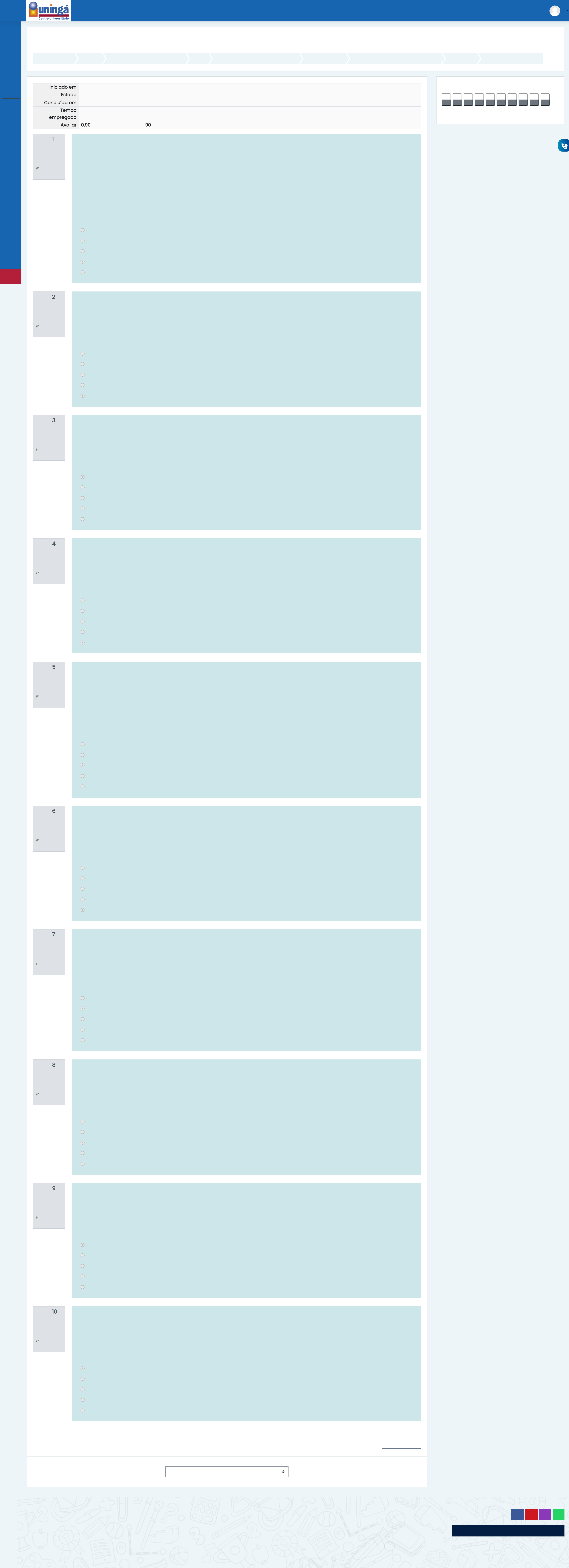 DIN4S2023 - AVA: GOVERNANÇA CORPORATIVA E COMPLIANCE Página inicial Cursos GRADUAÇÃO PRESENCIAL - 2023 2023 DIREITO - 2023 - 2º, 3º, 4º ANO 2023 DIN 4SERIE 2023 2023-DIN4S2023-AVAGOCOC-63649 UNIDADE III Atividade - Unidade III Questão 1 Completo Atingiu 0,10 de 0,10 Marcar questão Questão 2 Completo Atingiu 0,10 de 0,10 Marcar questão Questão 3 Completo Atingiu 0,10 de 0,10 Marcar questão Questão 4 Completo Atingiu 0,10 de 0,10 Marcar questão Questão 5 Completo Atingiu 0,10 de 0,10 Marcar questão Questão 6 Completo Atingiu 0,10 de 0,10 Marcar questão Questão 7 Completo Atingiu 0,10 de 0,10 Marcar questão Questão 8 Completo Atingiu 0,10 de 0,10 Marcar questão Questão 9 Completo Atingiu 0,00 de 0,10 Marcar questão Questão 10 Completo Atingiu 0,10 de 0,10 Marcar questão Terminar revisão Iniciado em segunda, 7 ago 2023, 15:17 Estado Finalizada Concluída em segunda, 7 ago 2023, 15:48 Tempo empregado 30 minutos 55 segundos Avaliar 0,90 de um máximo de 1,00(90%) Considere as afirmativas relativas às razões do crescimento do Brasil entre os anos de 2005 até 2010, indicando quais são verdadeiras (V) e quais são falsas (F): I. ( ) Apreciação cambial do real, que eleva o valor em dólar dos ativos. II. ( ) A retomada do crescimento econômico interno, com reflexos positivos nos resultados operacionais das empresas, especialmente nas relacionadas a mercados de consumo de massa. III. ( ) o bom período de crescimento de grandes países emergentes, com forte impacto na demanda de produtos básicos, originários da diversidade de capital natural do país. IV. ( ) os bons fundamentos macroeconômicos do país e sua crescente e positiva visibilidade em mercados internacionais. V. ( ) A atitude positiva dos EUA em escolher o Brasil como parceiro estratégico principal Assinale a única alternativa correta. a. F-V-F-V-V b. F-V-V-V-V c. F-F-F-V-F d. V-V-V-V-F e. V-F-V-F-F Considere as afirmativas relativas a estrutura do sistema financeiro nacional: I. É componente o CMN – Conselho Monetário Nacional. II. É componente o CNSP – Conselho Nacional de Seguros Privados. III. É componente o CNPC – Conselho Nacional de Previdência Complementar. Assinale a única alternativa correta: a. Apenas a afirmativa I está correta. b. Apenas as afirmativas II e III estão corretas. c. Apenas a afirmativa III está correta. d. Apenas a afirmativa II está correta. e. As afirmativas I, II e III estão corretas. Considere as afirmativas relativas aos objetivos CVM: I. Estimula a formação de poupança e sua aplicação em valores mobiliários. II. Assegura a observância de práticas comerciais equitativas no mercado de valores mobiliários. III. Assegura o funcionamento eficiente e regular dos mercados de bolsa e de balcão. Assinale a única alternativa correta: a. As afirmativas I, II e III estão corretas. b. Apenas a afirmativa I está correta. c. Apenas a afirmativa II está correta. d. Apenas as afirmativas I e II estão corretas. e. Apenas a afirmativa III está correta. Considere as afirmativas relativas aos impactos da reengenharia dos negócios: I. Um dos impactos se deu pelas privatizações. II. As políticas de barreiras de entrada permitiram uma onda sustentável de crescimento. III. A abertura de mercado foi marcada pelo aumento da média tarifária. Assinale a única alternativa correta: a. Apenas as afirmativas I e II estão incorretas. b. As afirmativas I, II e III estão incorretas. c. A afirmativa I contradiz a afirmativa III. d. Apenas as afirmativas I e III estão incorretas. e. Apenas as afirmativas II e III estão incorretas. Considere as afirmativas relativas ao Brasil no ambiente corporativo nacional e no alinhamentos das empresas, indicando quais são verdadeiras (V) e quais são falsas (F): I. ( ) Havia cartelização de mercados; II. ( ) A inflação complicava os processos de gestão; III. ( ) O aumento da competição só aconteceu a partir do fim do séc. XX; IV. ( ) O mercado era desregulamentado; V. ( ) Não havia protecionismo de mercado. Assinale a única alternativa correta. a. F-F-F-F-V b. F-V-V-V-F c. V-V-V-F-F d. F-V-F-V-V e. V-V-V-V-V Considere as afirmativas relativas às ações que compõem o IBovespa: I. Ser exclusivamente de empresa classificada como privada. II. Estar presente em 95% dos pregões no período de vigência das três carteiras anteriores. III. Não ser classificada como Penny Stock. Assinale a única alternativa correta: a. Apenas a afirmativa II está correta. b. Apenas a afirmativa III está correta. c. Apenas a afirmativa I está correta. d. As afirmativas I, II e III estão corretas. e. Apenas as afirmativas II e III estão corretas. Considere as afirmativas relativas à CVM: I. A sigla CVM significa Comércio de Valores Mobiliários. II. O Sistema Financeiro é o conjunto de instituições e instrumentos que viabilizam o fluxo financeiro entre os que têm excedente de recursos e os que necessitam tomar recursos. III. O chamado mercado financeiro é composto pelo mercado de capitais, de crédito, de câmbio e monetário. Assinale a única alternativa correta. a. Apenas as afirmativas I e III estão corretas. b. Apenas as afirmativas II e III estão corretas. c. A afirmativa I contradiz a afirmativa II. d. As afirmativas I, II e III estão corretas. e. Apenas as afirmativas I e II estão corretas. Considere as afirmativas relativas ao B3 e IBovespa: I. A B3 é a bolsa brasileira, sendo o seu nome uma abreviação para Brasil-Bolsa-Balcão. II. A B3 surgiu oficialmente em 2017, logo após a fusão entre a Bm&fBovespa e a CETIP. III. O Ibovespa é o principal índice do mercado de ações brasileiro. Assinale a única alternativa correta: a. Apenas a afirmativa III está correta. b. Apenas as afirmativas I e III estão corretas. c. As afirmativas I, II e III estão corretas. d. Apenas a afirmativa I está correta. e. Apenas a afirmativa II está correta. Considere as afirmativas relativas ao Brasil e as transformaç