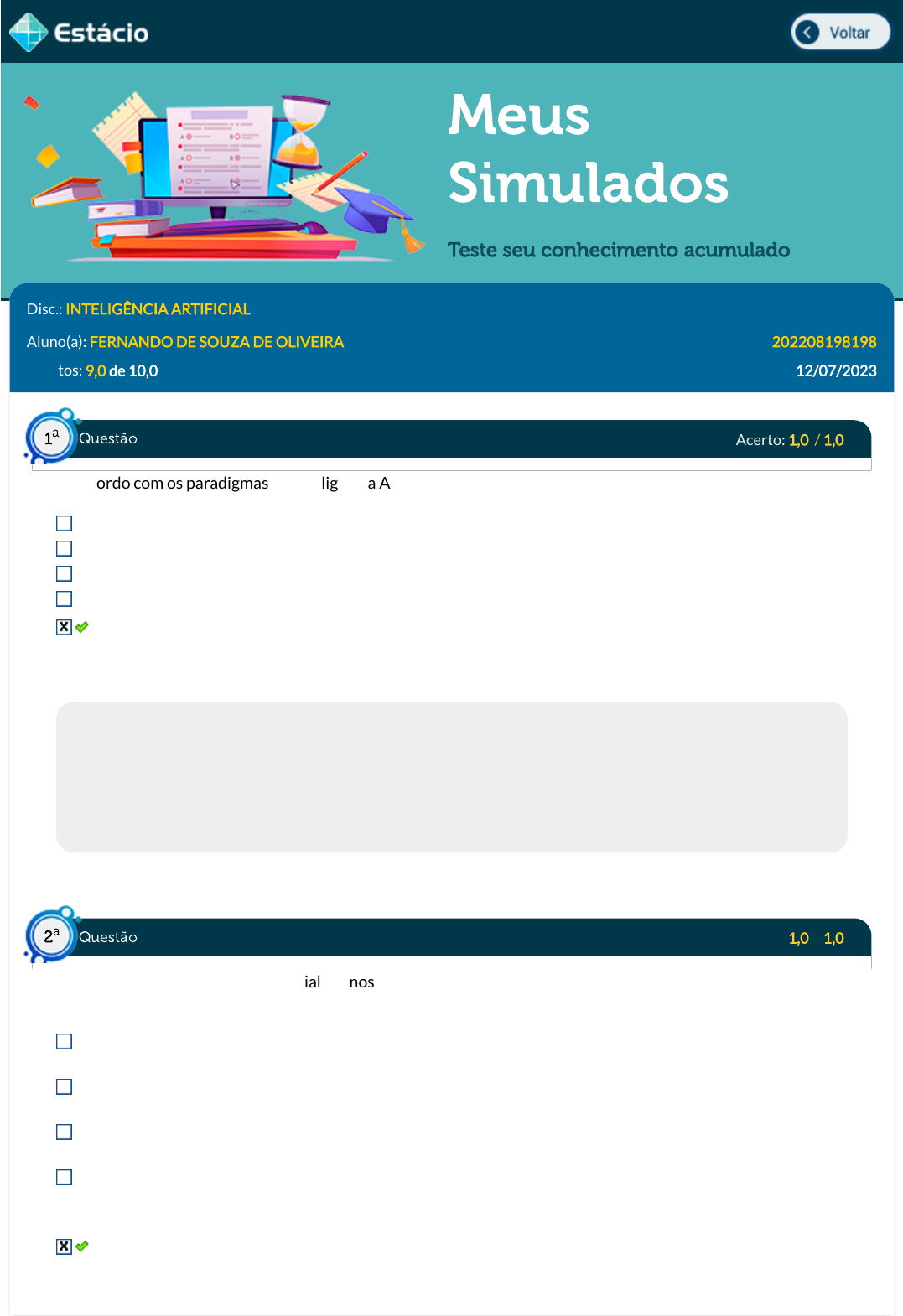 07/08/2023, 16:32 Estácio: Alunos https://simulado.estacio.br/bdq_simulados_avaliacao_parcial_resultado.asp?cod_hist_prova=313764792&cod_prova=6555173425&f_cod_disc= 1/8 Meus Simulados Teste seu conhecimento acumulado Disc.: INTELIGÊNCIA ARTIFICIAL Aluno(a): FERNANDO DE SOUZA DE OLIVEIRA 202208198198 Acertos: 9,0 de 10,0 12/07/2023 Acerto: 1,0 / 1,0 De acordo com os paradigmas de Inteligência Arti�cial, pode-se a�rmar que um modelo simbolista é um modelo que aprende a partir dos dados. é formado por uma rede de elementos conectados por pesos que detêm o conhecimento. não possui conhecimento representado explicitamente. lida apenas com símbolos grá�cos. lida com conhecimento explícito e representado simbolicamente. Respondido em 12/07/2023 12:01:33 Explicação: A Inteligência Arti�cial possui vários paradigmas. Um deles é o paradigma simbólico, que consiste em estruturas simbólicas que podem ser compreendidas por seres humanos. Dessa maneira, é correto a�rmar que o modelo simbolista lida com conhecimento explícito, facilmente interpretado por humanos. Os resultados são descrições simbólicas das entidades dadas e devem ser compreensíveis como simples pedaços de informação e diretamente interpretáveis em linguagem natural. Acerto: 1,0 / 1,0 A introdução da Inteligência Arti�cial em nossas rotinas trouxe o termo casa inteligente. Sobre o assunto, julgue as opções. As vantagens de uma casa inteligente são: segurança e personalização, porém, devido ao elevado custo, ainda não saíram do papel, atualmente, são apenas projetos. As casas inteligentes são uma das tecnologias mais antigas da IA, com seu modelo projetado nos anos 1960. Atualmente, as casas inteligentes são a realidade em uma grande maioria de cidades pelo mundo, principalmente no Brasil. Com a possibilidade de ajustar intensidade e potência e personalizar a usabilidade de aparelhos e eletrodomésticos, devido à ausência de economia de energia, o preço que se paga pelos gadgets não é viável. As casas inteligentes têm o objetivo de oferecer diversos recursos de automação que prometem tornar a vida mais tranquila. Respondido em 12/07/2023 12:03:50 Questão1 a Questão2 a https://simulado.estacio.br/alunos/inicio.asp javascript:voltar(); 07/08/2023, 16:32 Estácio: Alunos https://simulado.estacio.br/bdq_simulados_avaliacao_parcial_resultado.asp?cod_hist_prova=313764792&cod_prova=6555173425&f_cod_disc= 2/8 Explicação: A casa inteligente, também conhecida como casa conectada - do inglês, Connected Home - é uma casa que possui sistemas avançados de automação para providenciar monitoramento e controle sobre as funções de toda a construção, como, por exemplo, controles de temperatura, multimídia, portas e janelas. Acerto: 1,0 / 1,0 A estratégia de alguns algoritmos para resolver problemas em espaços de estados é explorar a vizinhança de uma determinada solução com a garantia qualidade. Nesse sentido, selecione a opção correta que trata esta classe de problemas. Técnicas de pesquisa informadas. Técnicas de pesquisa local. Heurísticas. Técnicas de pesquisa desinformadas. Algoritmo A*. Respondido em 12/07/2023 12:04:41 Explicação: Os algoritmos de busca global são muito importantes, pois garantem a solução ótima de um problema, quando ela existe. No entanto, para problemas práticos, obter a solução ótima global pode ser um processo muito custoso do ponto de vista computacional. Uma estratégia bastante utilizada é a dos algoritmos de busca local que exploram o entorno de uma determinada solução na tentativa de obter uma solução melhor que a atual, mas não garantem uma solução global. Acerto: 1,0 / 1,0 As estratégias que podem ser aplicadas a um método de busca visam aumentar as chances de alcançar a solução alvo (ou solução meta) do problema de um modo mais e�ciente. Nesse sentido, selecione a opção correta que trata sobre as estratégias de um método de busca no espaço de estados. Uma das vantagens de utilizar estratégias em um método de busca de estados é o determinismo das escolhas dos estados ao longo das iterações. As estratégias mais e�cientes que podem ser aplicadas a um método de busca no espaço de estados são Best First, Breadth First Search e Depth First Search. Uma estratégia não garante que a solução alvo será obtida da forma mais e�ciente. Quando uma estratégia é e�ciente para um problema, pode-se a�rmar que ela é ideal para resolver qualquer problema semelhante. A e�ciência de um método é medida através das estratégias que são aplicadas. Respondido em 12/07/2023 12:07:37 Explicação: Os métodos para explorar os espaços de estados, normalmente, são algoritmos heurísticos. Esses algoritmos são caracterizados por incorporar comportamentos que funcionam bem na prática, mas que não dão garantias a respeito da qualidade da solução. Portanto esses métodos não garantem que a solução é obtida da forma mais e�ciente, apesar de que, normalmente, funcionam muito bem. Questão3 a Questão4 a 07/08/2023, 16:32 Estácio: Alunos https://simulado.estacio.br/bdq_simulados_avaliacao_parcial_resultado.asp?cod_hist_prova=313764792&cod_prova=6555173425&f_cod_disc= 3/8 Acerto: 1,0 / 1,0 Algumas regras de aprendizagem são conhecidas por mais de uma forma. Em relação à regra de aprendizagem Instar, selecione a opção que contém outra forma pela qual ela é conhecida. O vencedor leva tudo. Regra de aprendizagem Outstar. Método dos mínimos quadrados. Distribuição aleatória. Regra de aprendizagem Perceptron. Respondido em 12/07/2023 12:09:03 Explicação: A outra forma de chamar a regra de aprendizagem Instar é que o vencedor leva tudo. Isso ocorre porque essa regra tem como característica principal a escolha da unidade que produz a saída com melhor resultado. Após a escolha da unidade, é feito o ajuste dos pesos sinápticos. As demais alternativas estão erradas, pois não s