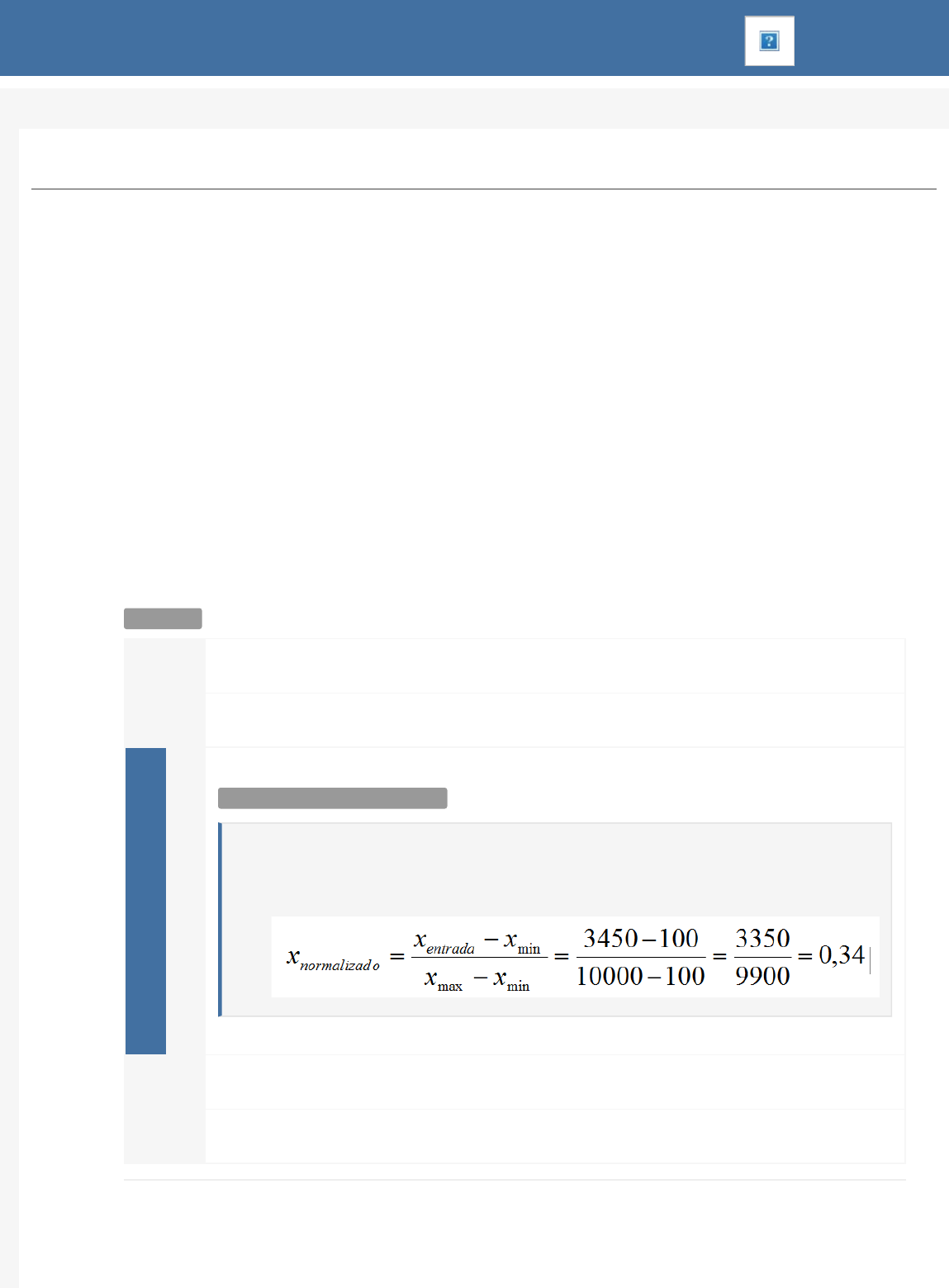 AVA UNIVIRTUS https://univirtus.uninter.com/...ioHistorico/QKR15QOkzSGCPDCoUQB1jQ%3D%3D/novo/1/DEnjN%2FsUAap66pAOlZUlzQ%3D%3D[02/09/2023 16:01:28] Voltar CURSO: TECNOLOGIA EM REDES DE COMPUTADORES - DISTÂNCIA Created with Raphaël 2.1.0 AVALIAÇÃO » NOVO Atenção. Este gabarito é para uso exclusivo do aluno e não deve ser publicado ou compartilhado em redes sociais ou grupo de mensagens. O seu compartilhamento infringe as políticas do Centro Universitário UNINTER e poderá implicar sanções disciplinares, com possibilidade de desligamento do quadro de alunos do Centro Universitário, bem como responder ações judiciais no âmbito cível e criminal. Questão 1/12 - Inteligência Artificial Aplicada A aplicação de uma RNA a um problema qualquer com uma grande quantidade de sinais de entrada exige que seja feita a normalização para padronizar o cálculo internamente à RNA. Considerando a normalização de um sinal de entrada para um neurônio relativo à que tenha o valor mínimo de 100 (zero), o sinal máximo de 10000 e um valor qualquer de entrada de 3450, o valor normalizado para esta entrada específica (com duas casas decimais) será de: Nota: 10.0 A 0,56 B 0,38 C 0,34 Você assinalou essa alternativa (C) D 3,45 E 1,00 Questão 2/12 - Inteligência Artificial Aplicada Relacione os critérios com as proposições sobre os ambientes de tarefa a seguir e depois marque a alternativa correta: Você acertou! Utiliza-se a fórmula para o cálculo da normalização de uma entrada de RNA: javascript: void(0) javascript:void(0) AVA UNIVIRTUS https://univirtus.uninter.com/...ioHistorico/QKR15QOkzSGCPDCoUQB1jQ%3D%3D/novo/1/DEnjN%2FsUAap66pAOlZUlzQ%3D%3D[02/09/2023 16:01:28] 1. Completamente x Parcialmente observável 2. Determinístico x Estocástico 3. Episódico x Sequencial 4. Estático x Dinâmico 5. Discreto x Contínuo ( ) Se há dependência dos estados atuais com os estados anteriores ou não. ( ) Se o ambiente se modifica ou não enquanto o agente executa a tarefa ( ) Se o agente acessa de forma completa ou não os estados do ambiente a cada instante ( ) Se há uma mudança brusca ou suave na sequência de estados que o agente experimenta. ( ) Se o próximo estado é completamente conhecido pelo estado atual ou não por parte do agente. Nota: 10.0 A 3-5-4-1-2 B 4-3-1-2-5 C 5-4-1-3-2 D 3-4-1-5-2 Você assinalou essa alternativa (D) Você acertou! Pelo critério completamente x parcialmente observável, se os sensores do agente acessam de forma completa aos estados do ambiente em cada instante, o ambiente é completamente observável. Se houver ruído, sensoriamento impreciso ou lacunas nos estados, é parcialmente observável; pelo critério determinístico x estocástico, se o próximo estado é completamente determinado pelo estado atual e pela ação executada pelo agente, o ambiente é dito determinístico, senão, é estocástico. Se o sistema é determinístico mas apresenta elementos estocásticos, o ambiente é dito estratégico; pelo critério episódico x sequencial, num ambiente de tarefa episódico o agente experimenta os eventos de maneira atômica, com os episódios começando com a percepção do agente e na execução de uma única ação. Num ambiente sequencial, há a dependência dos estados atuais com os estados anteriores; pelo critério estático x dinâmico, caso o ambiente se altere enquanto o agente está executando a tarefa, ele é dinâmico. Se o ambiente não se modifica ao longo da AVA UNIVIRTUS https://univirtus.uninter.com/...ioHistorico/QKR15QOkzSGCPDCoUQB1jQ%3D%3D/novo/1/DEnjN%2FsUAap66pAOlZUlzQ%3D%3D[02/09/2023 16:01:28] E 1-2-3-4-5 Questão 3/12 - Inteligência Artificial Aplicada Relacione as afirmações com as estratégias de busca a seguir e depois marque a alternativa com a sequência correta: I. Busca em amplitude II. Busca de custo uniforme III. Busca em profundidade IV. Busca em profundidade limitada V. Busca em aprofundamento iterativo ( ) Caso se tenha algum conhecimento sobre o problema, pode-se restringir a busca a um nível limite de expansão dos nós. ( ) Combina os benefícios da busca em profundidade e da busca em extensão. ( ) O nó raiz é expandido, depois os nós sucessores do nó raiz, depois os sucessores dos sucessores e assim por diante. ( ) Variante da busca em amplitude por considerar a expansão do nó que possui o custo mais baixo. ( ) Pode ser implementada por um algoritmo de busca em árvore com uma estrutura de pilha. Nota: 10.0 A III-IV-V-II-I B V-IV-I-III-II C IV-V-I-II-III Você assinalou essa alternativa (C) execução, é estático (Há situações em que os ambientes podem ser caracterizados como semidinâmicos); e o critério discreto x contínuo refere-se ao modo como o tempo é considerado, e também ao estado do ambiente e das percepções e ações. Uma sequência de estados discretos muda de forma brusca de um estado para outro. Uma sequência de estados contínua muda de forma suave. Você acertou! No caso da busca em profundidade limitada, caso se tenha algum conhecimento sobre o problema, pode-se restringir a busca a um nível limite de expansão dos nós. O aprofundamento iterativo combina os benefícios da busca em profundidade e da AVA UNIVIRTUS https://univirtus.uninter.com/...ioHistorico/QKR15QOkzSGCPDCoUQB1jQ%3D%3D/novo/1/DEnjN%2FsUAap66pAOlZUlzQ%3D%3D[02/09/2023 16:01:28] D IV-V-III-II-I E I-II-III-V-IV Questão 4/12 - Inteligência Artificial Aplicada Relacione os conceitos de AG com as afirmações a seguir e depois marque a alternativa correta: I. Seleção II. Crossover III. Mutação IV. Gene V. Fitness ( ) Compõe um cromossomo, referindo-se geralmente a um bit. ( ) Altera levemente a característica de um individuo. ( ) Uma medida de quão boa é a adaptação ou adequação de um indivíduo. ( ) Ocorre pela mistura de dois (ou mais) indivíduos. ( ) Análogo à sobrevivência dos mais adaptados no mundo natural. Nota: 10.0 A V-III-IV-I-II B IV-V-II-I-III C III-V-II-IV-I D IV-III
